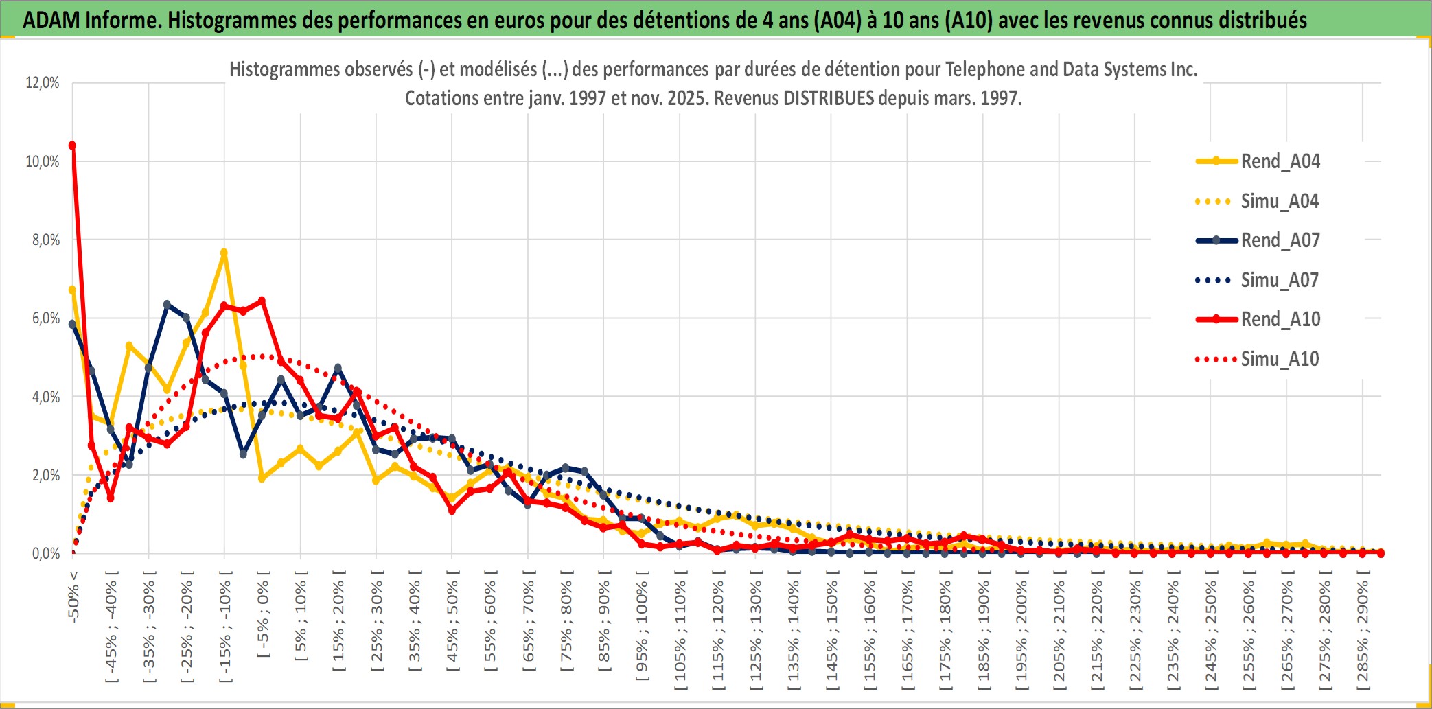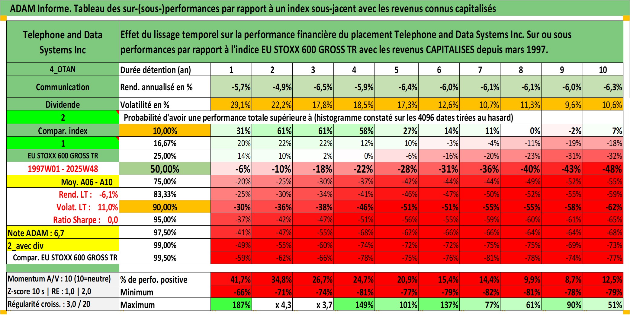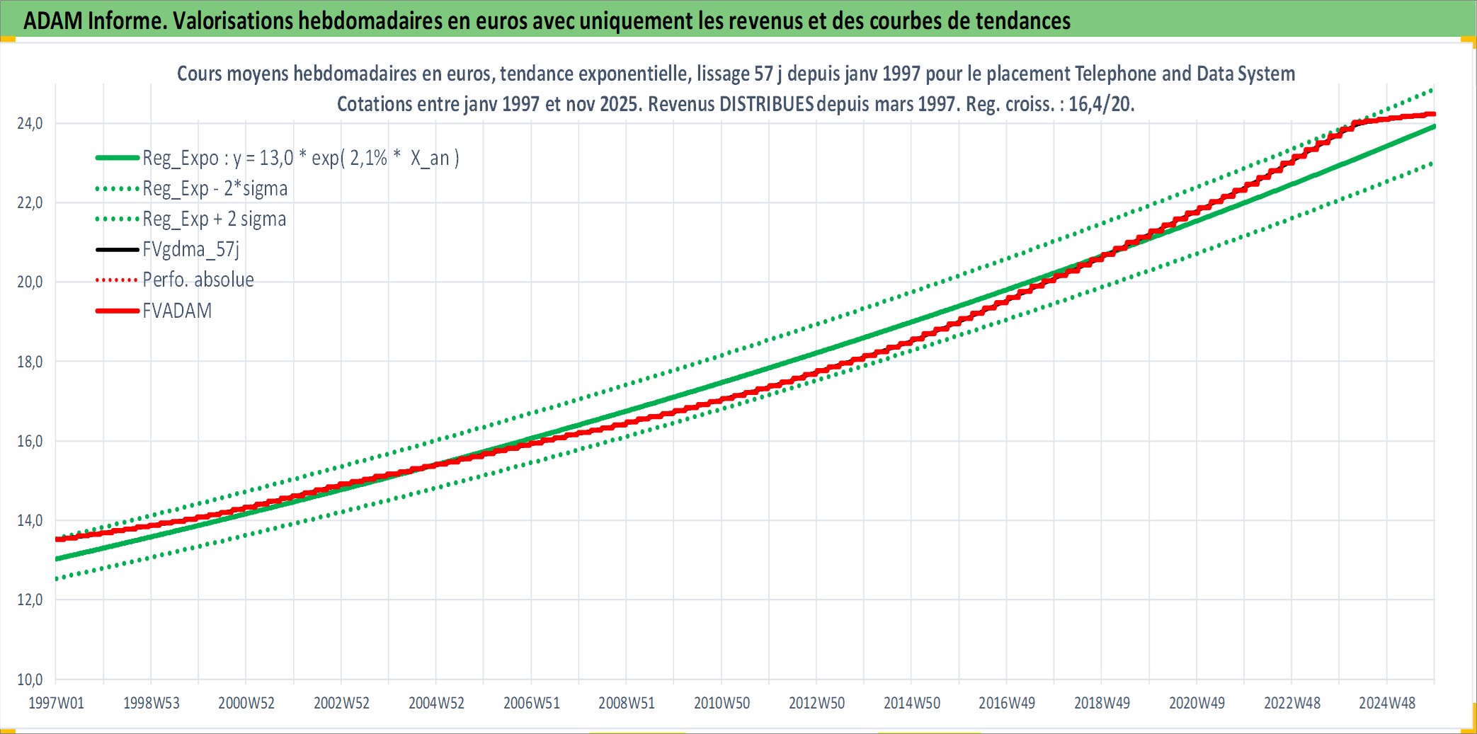 Site dédié aux investisseursPage dédiée sur site financeAnalyse des valorisations hebdomadaires de l'action Telephone and Data Systems Inc. Cet actif est cote en USD. Les valorisations sont en contrevaleur EURO et couvrent les semaines 1997W01 a 2025W48. Les revenus de cet actif financier sont pris en compte depuis la semaine 1997W11. La note ESG de cet actif n'est pas connue.