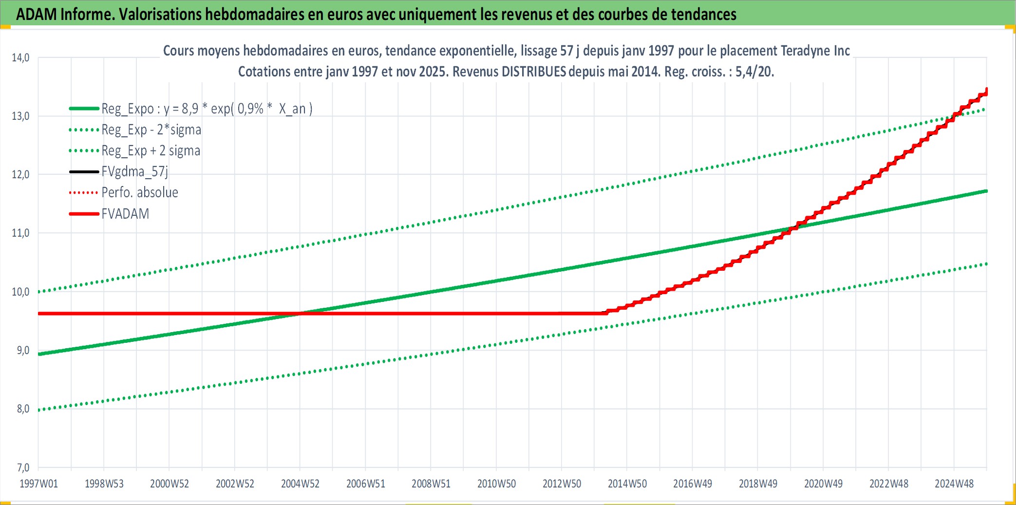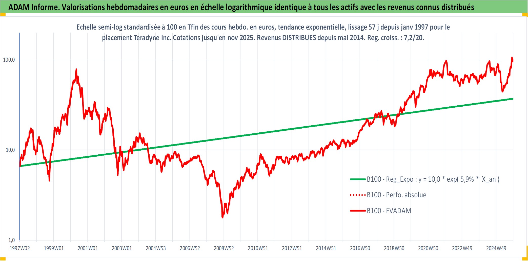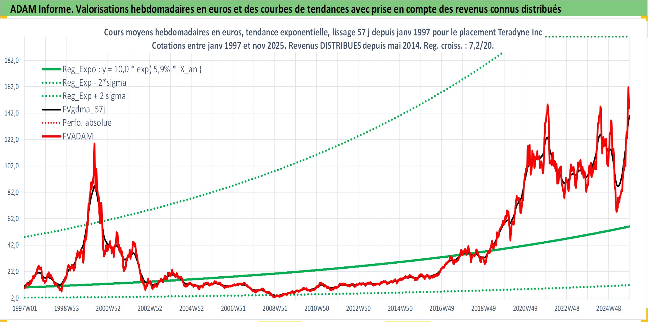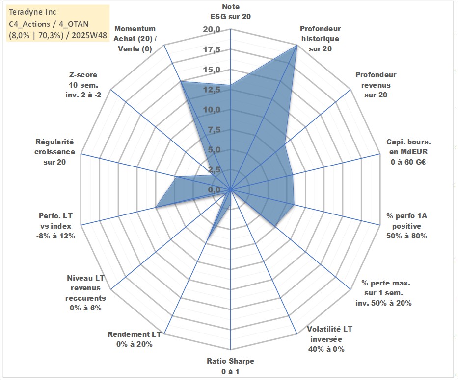 Site dédié aux investisseursPage dédiée sur site financeAnalyse des valorisations hebdomadaires de l'action Teradyne Inc. Cet actif est cote en USD. Les valorisations sont en contrevaleur EURO et couvrent les semaines 1997W01 a 2025W48. Les revenus de cet actif financier sont pris en compte depuis la semaine 2014W19. La note globale ESG de cet actif est estimee a 13.0 (apres rebasage entre 0 et 20).