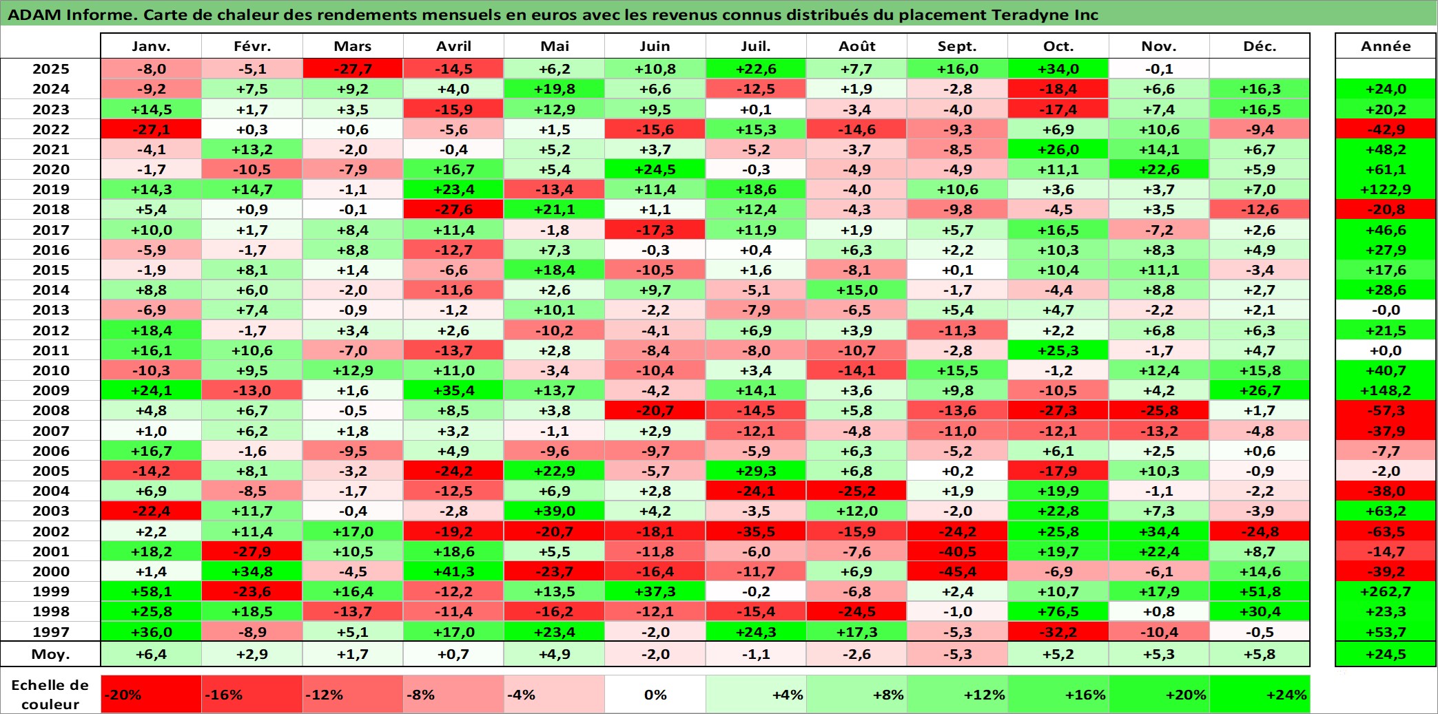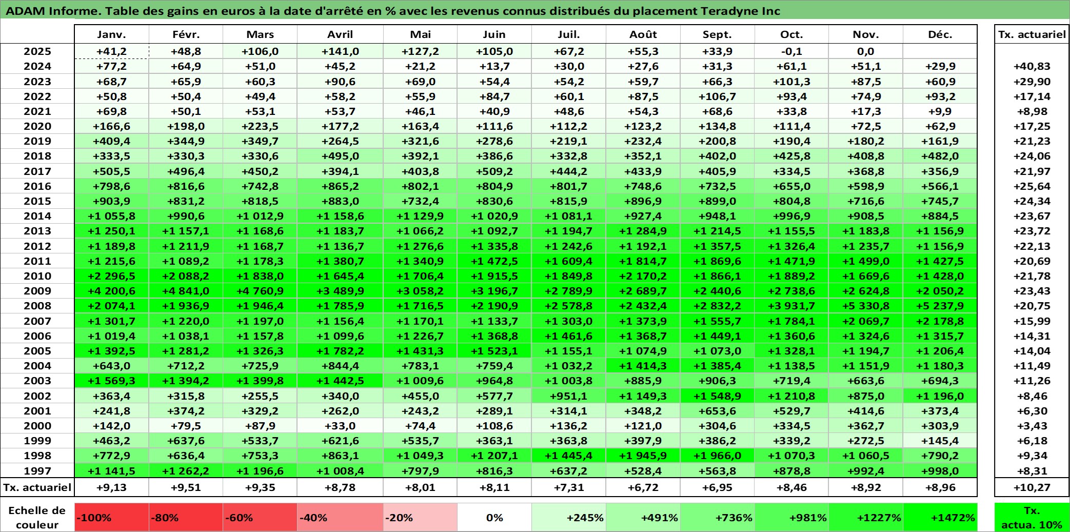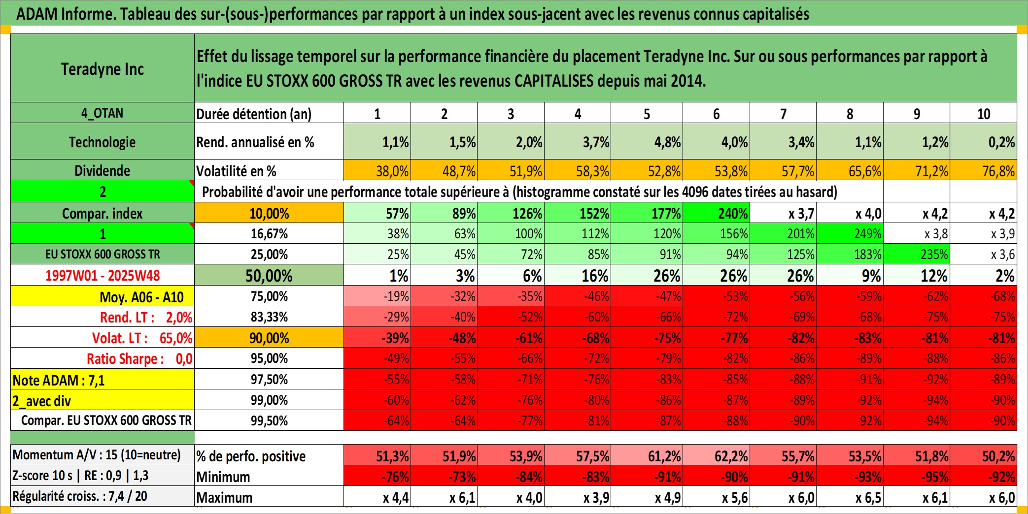 Site dédié aux investisseursPage dédiée sur site financeAnalyse des valorisations hebdomadaires de l'action Teradyne Inc. Cet actif est cote en USD. Les valorisations sont en contrevaleur EURO et couvrent les semaines 1997W01 a 2025W48. Les revenus de cet actif financier sont pris en compte depuis la semaine 2014W19. La note globale ESG de cet actif est estimee a 13.0 (apres rebasage entre 0 et 20).