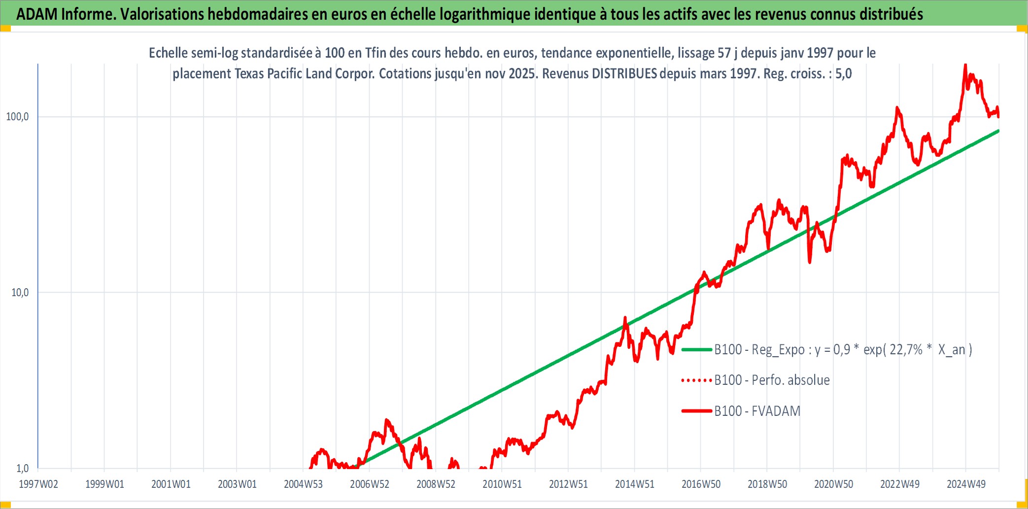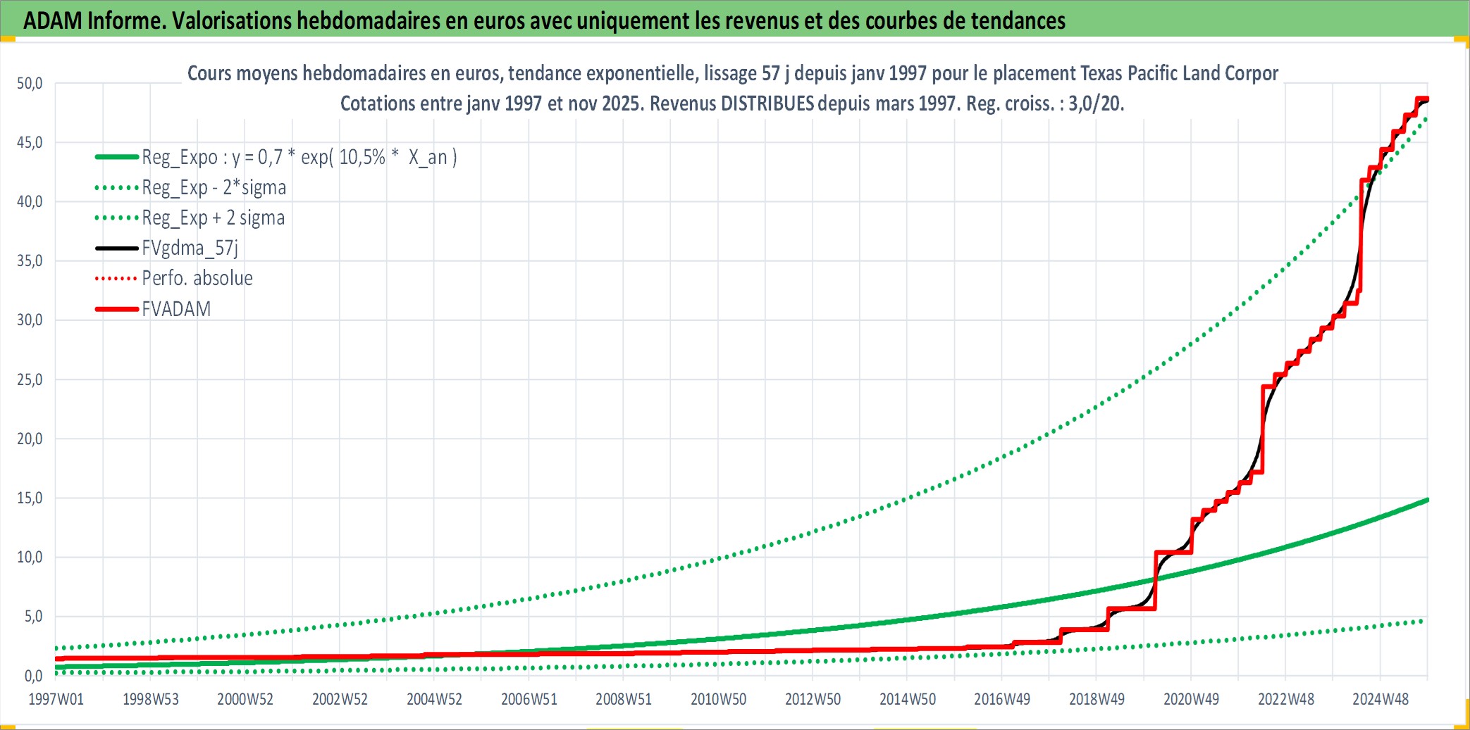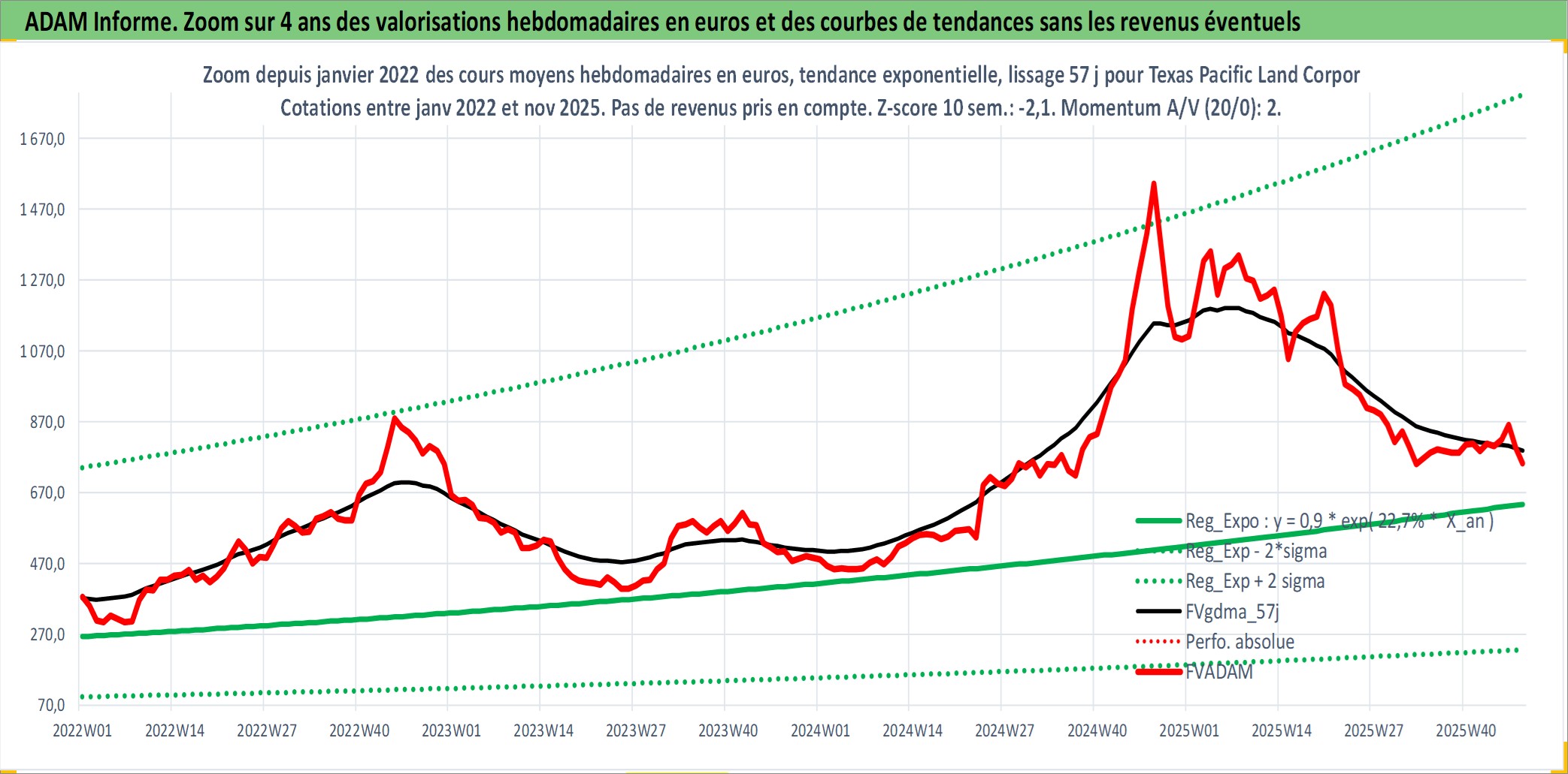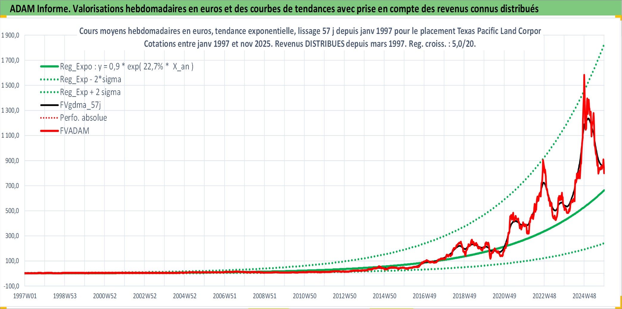 Site dédié aux investisseursPage dédiée sur site financeAnalyse des valorisations hebdomadaires de l'action Texas Pacific Land Corporation. Cet actif est cote en USD. Les valorisations sont en contrevaleur EURO et couvrent les semaines 1997W01 a 2025W48. Les revenus de cet actif financier sont pris en compte depuis la semaine 1997W10. La note ESG de cet actif n'est pas connue.