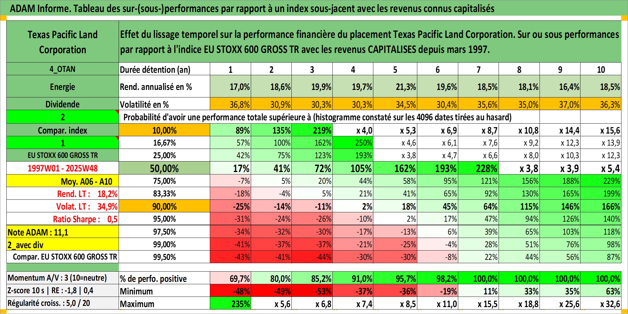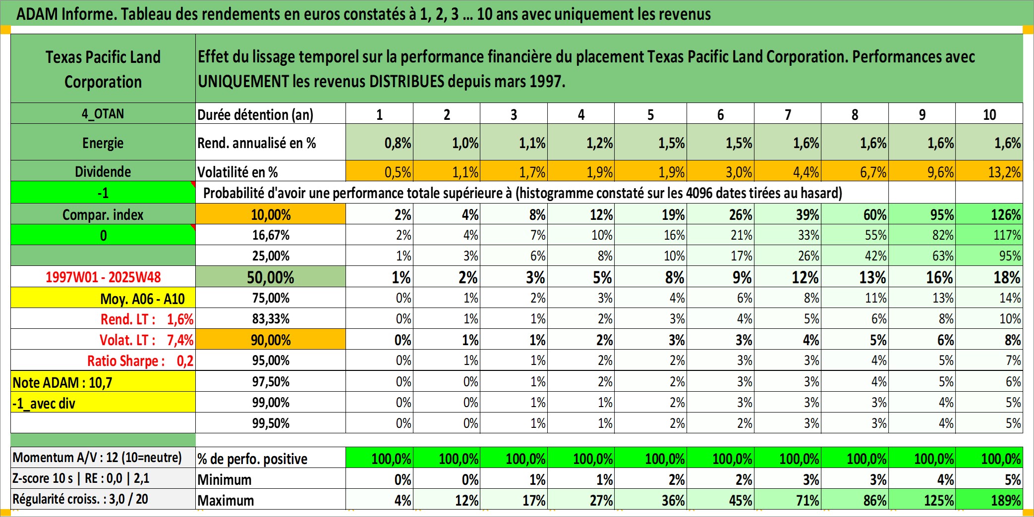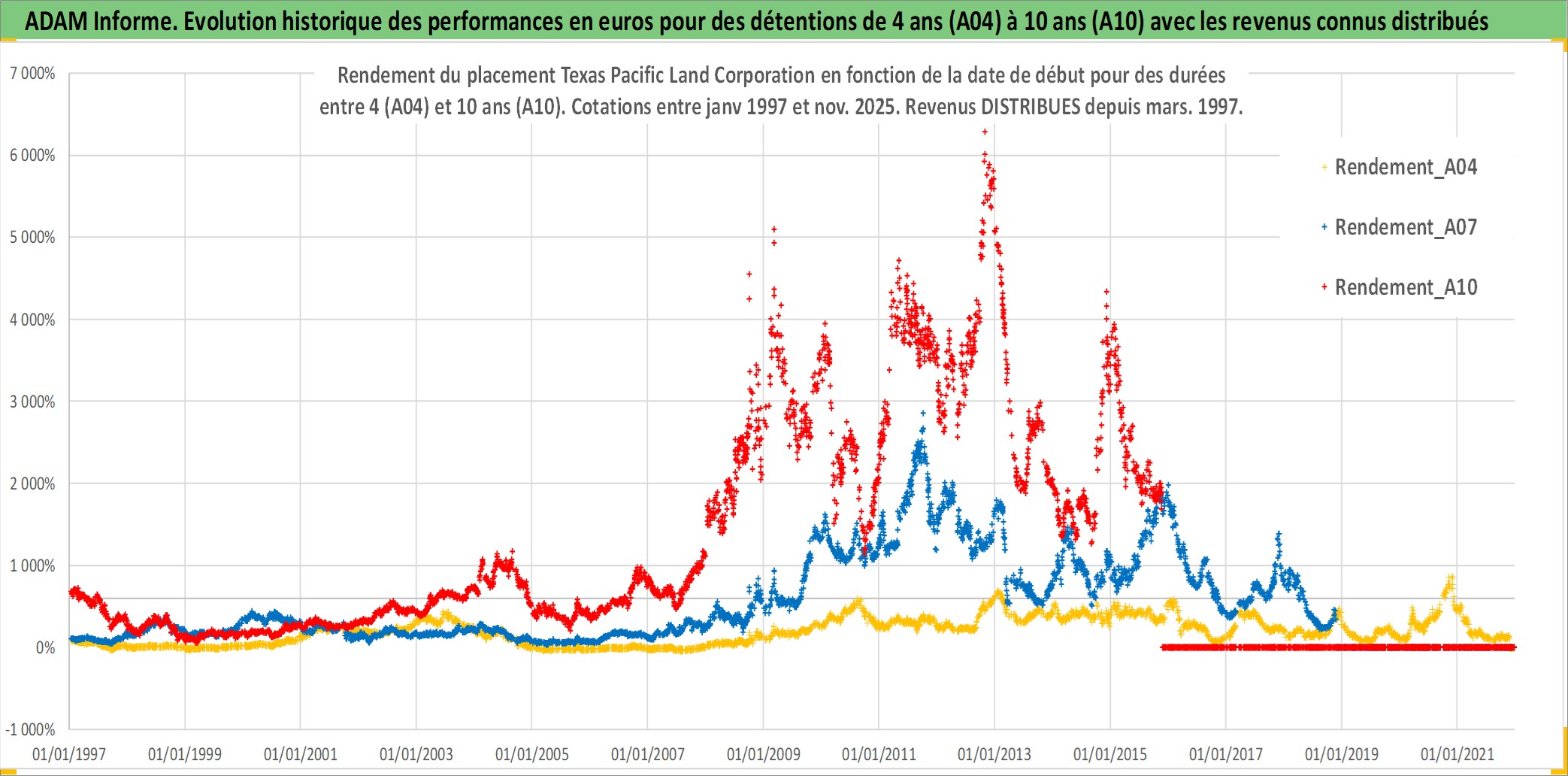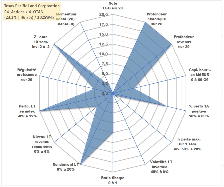 Site dédié aux investisseursPage dédiée sur site financeAnalyse des valorisations hebdomadaires de l'action Texas Pacific Land Corporation. Cet actif est cote en USD. Les valorisations sont en contrevaleur EURO et couvrent les semaines 1997W01 a 2025W48. Les revenus de cet actif financier sont pris en compte depuis la semaine 1997W10. La note ESG de cet actif n'est pas connue.
