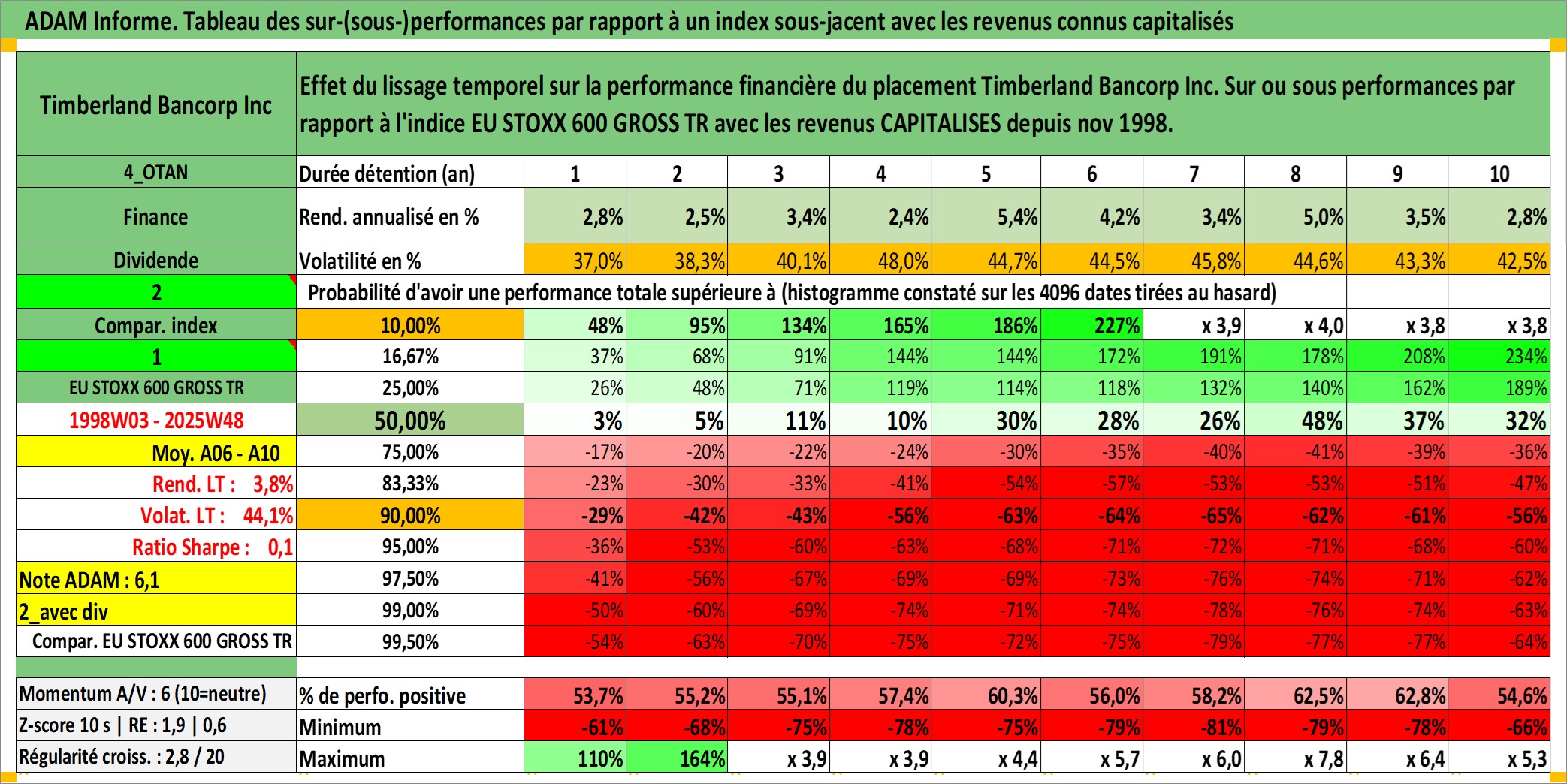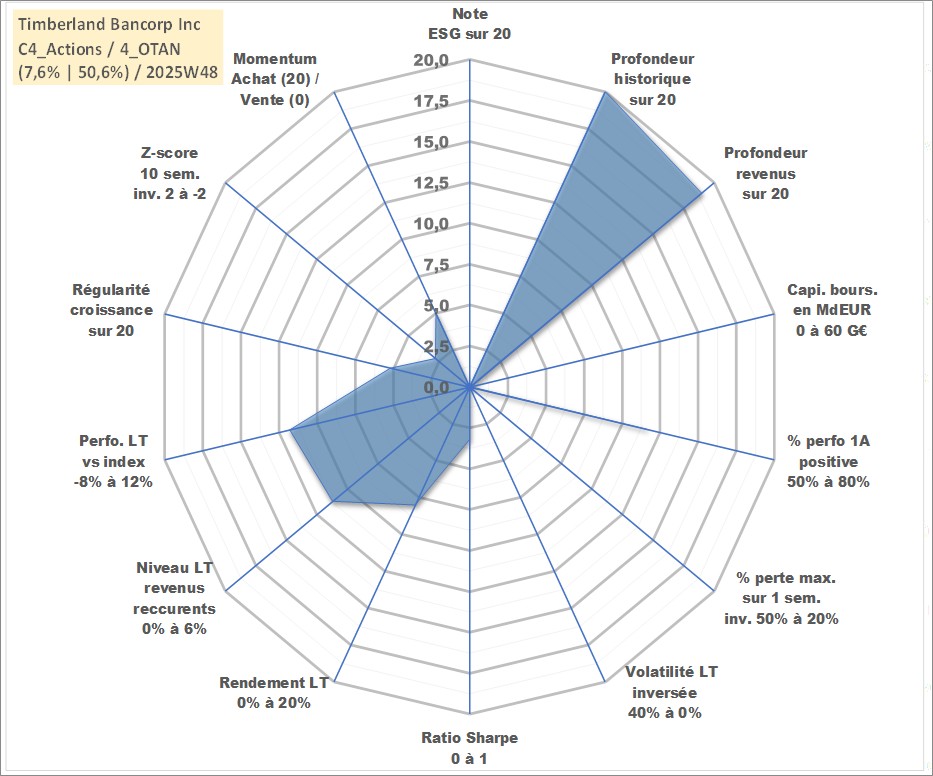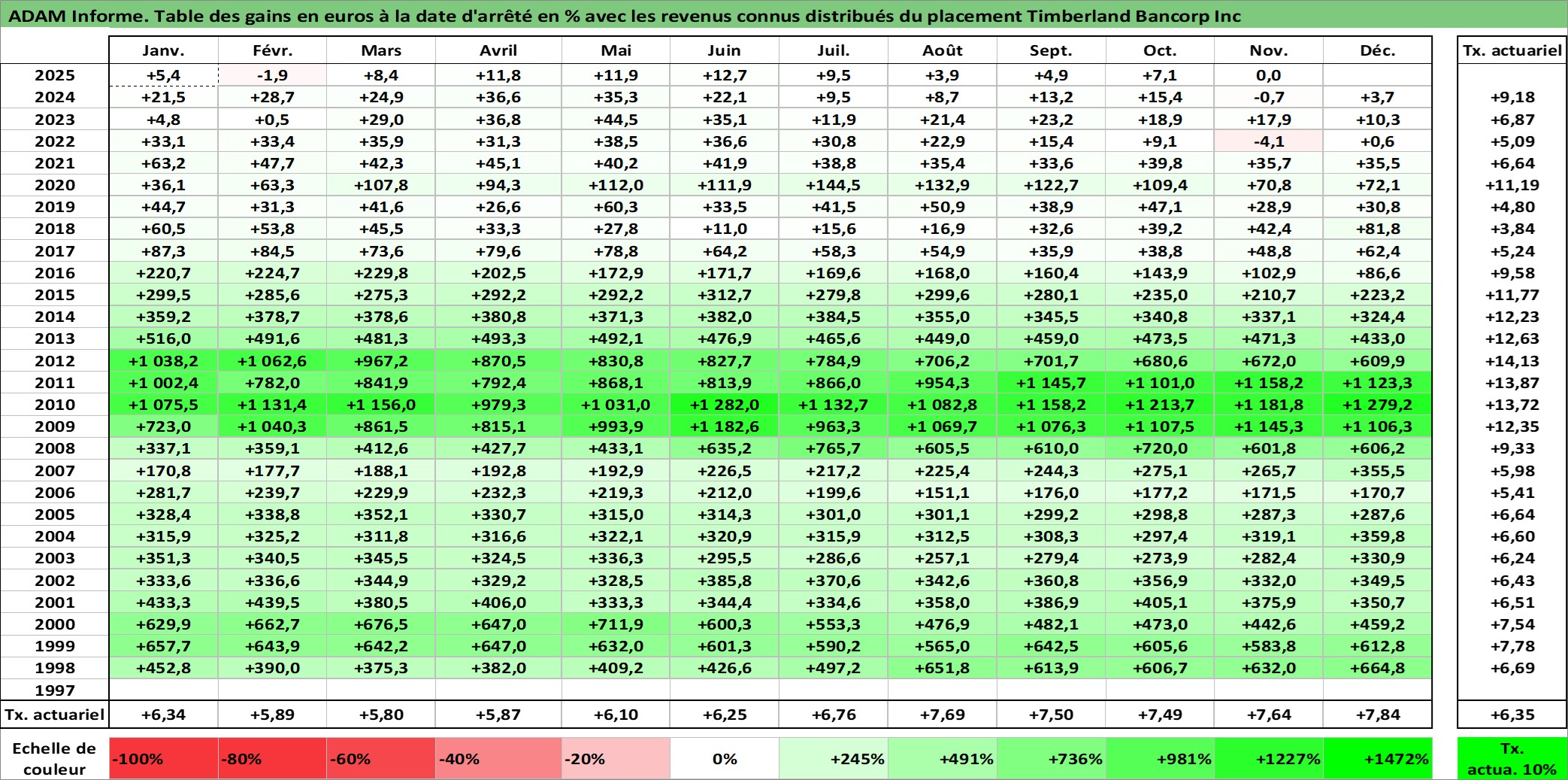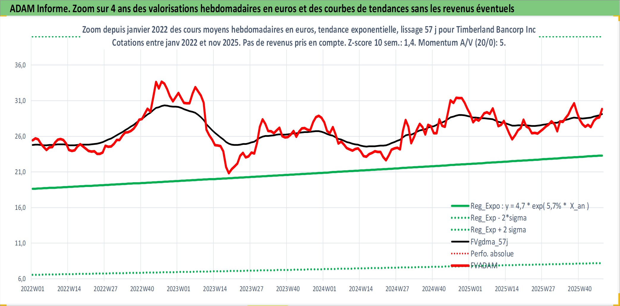 Site dédié aux investisseursPage dédiée sur site financeAnalyse des valorisations hebdomadaires de l'action Timberland Bancorp Inc. Cet actif est cote en USD. Les valorisations sont en contrevaleur EURO et couvrent les semaines 1998W03 a 2025W48. Les revenus de cet actif financier sont pris en compte depuis la semaine 1998W45. La note ESG de cet actif n'est pas connue.