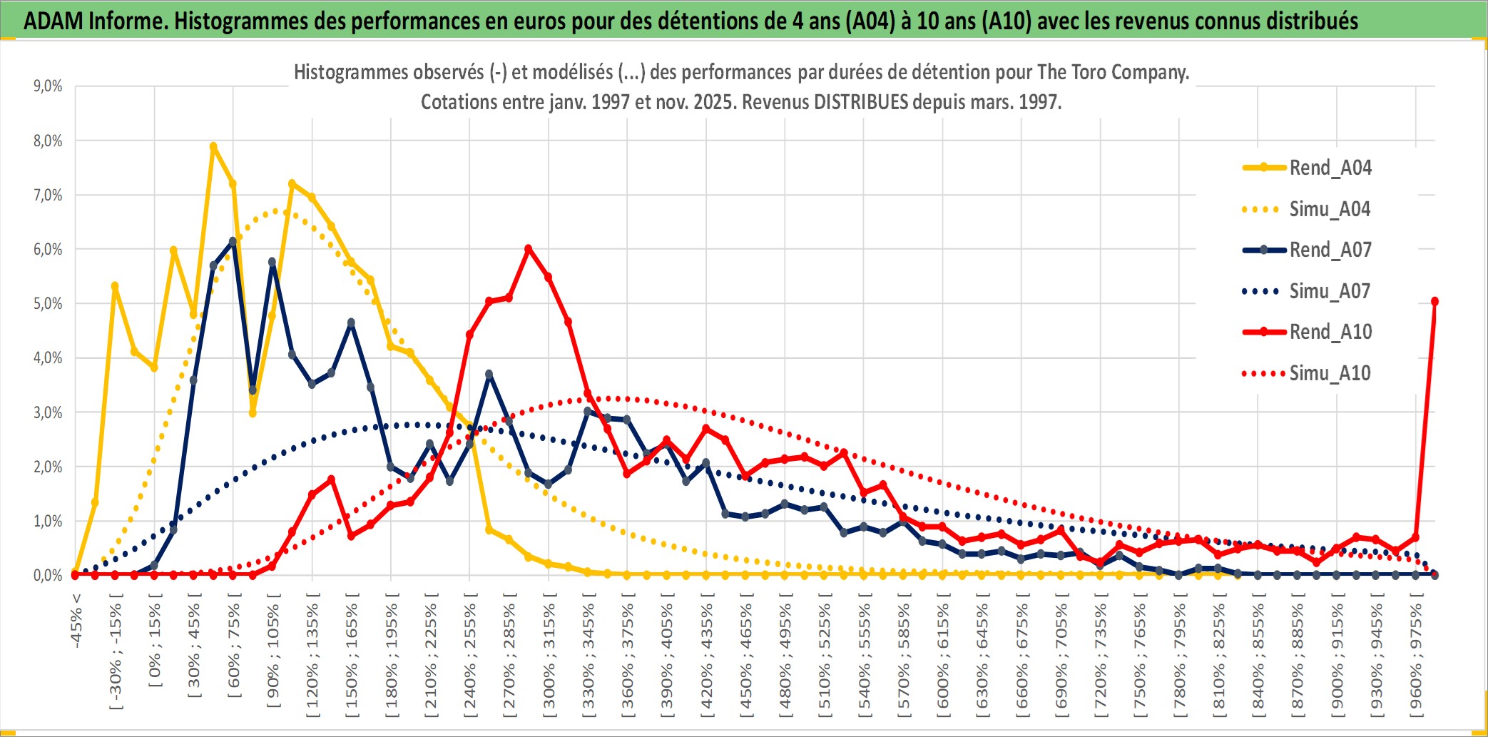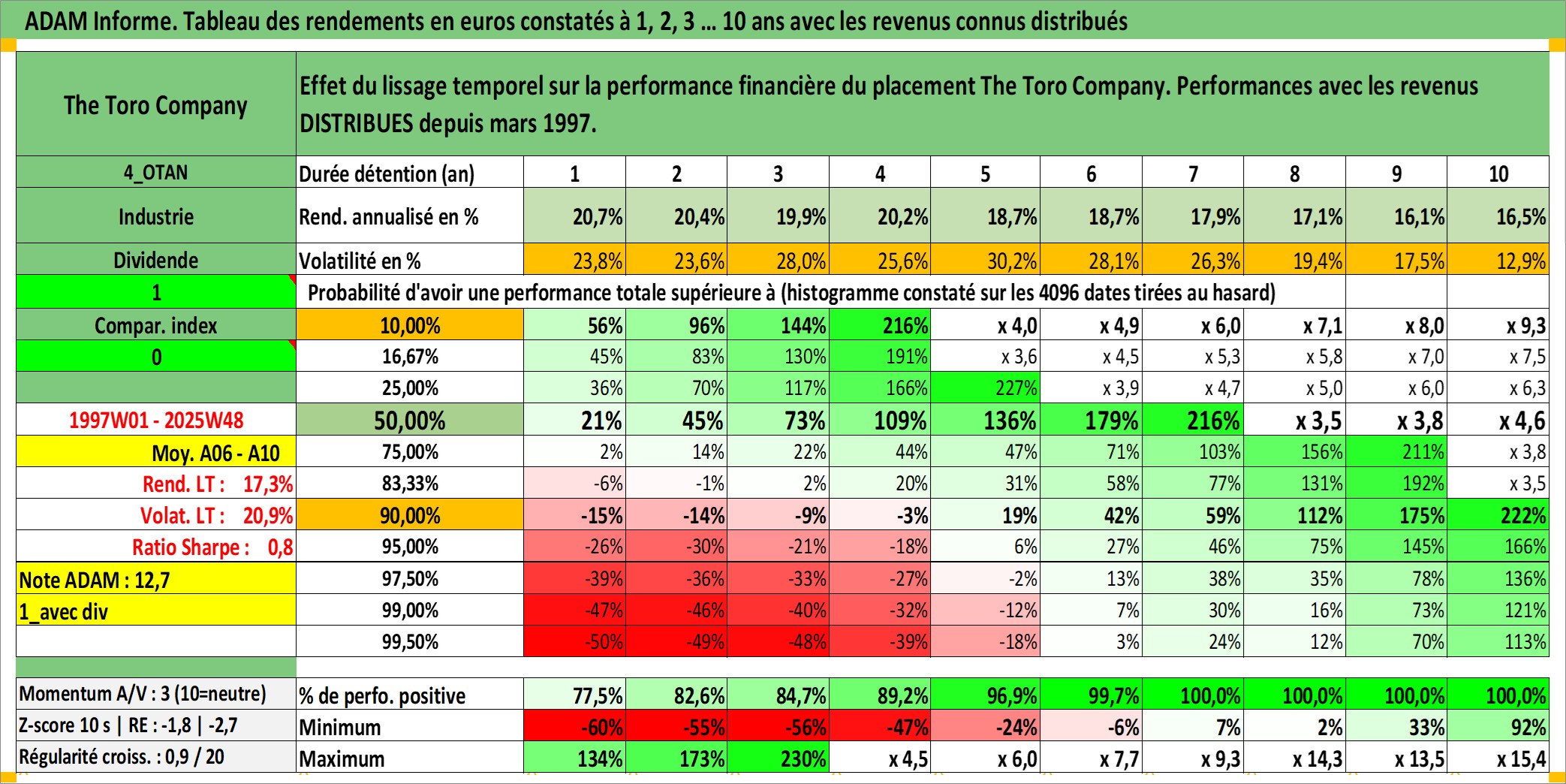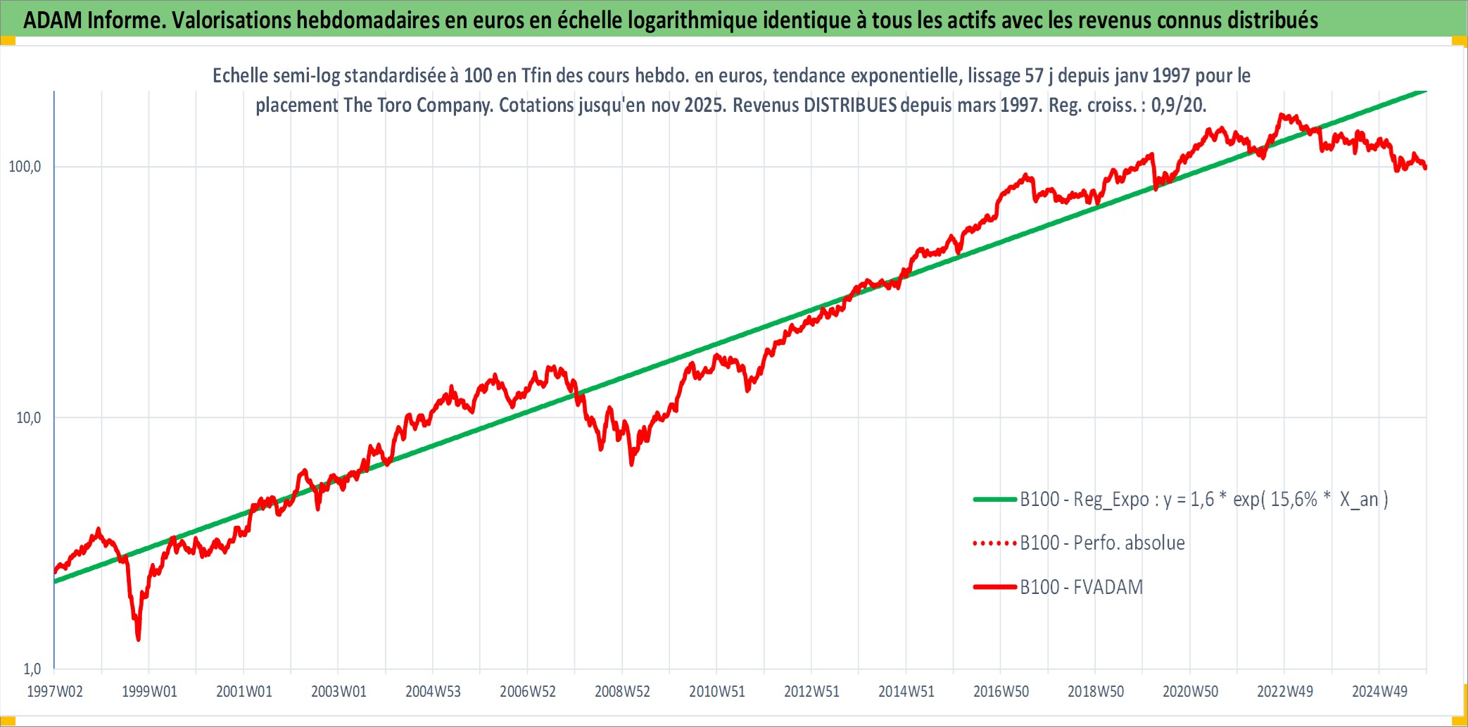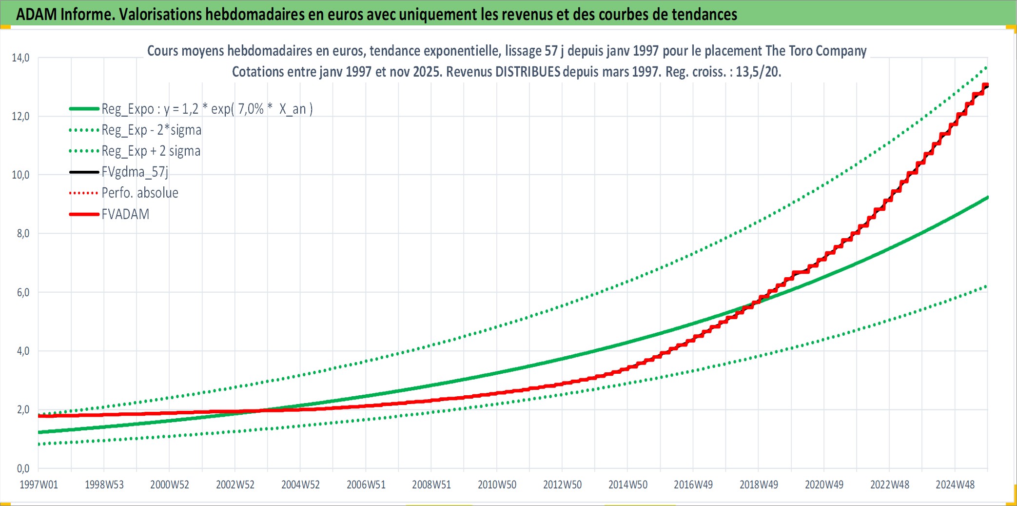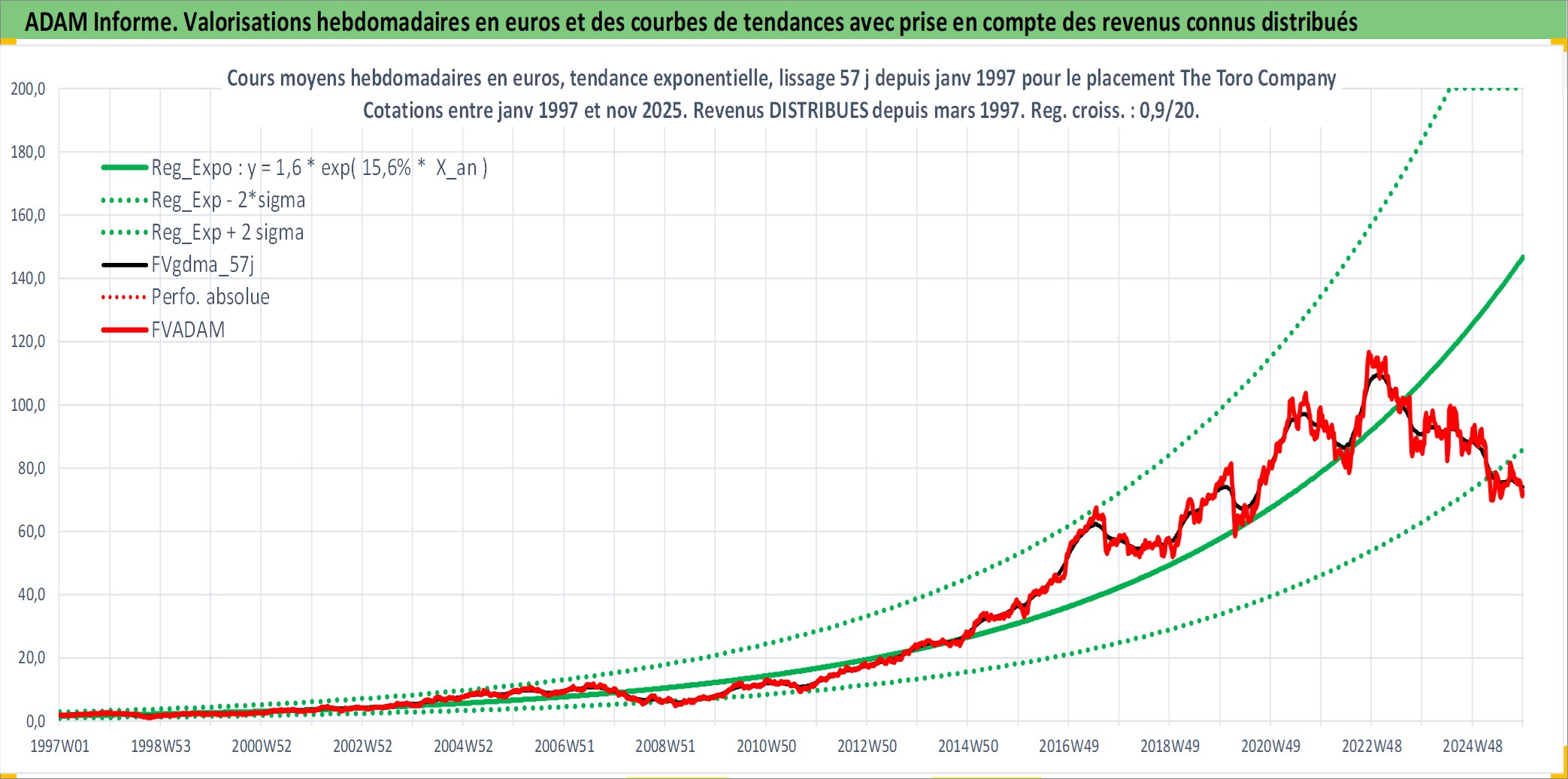 Site dédié aux investisseursPage dédiée sur site financeAnalyse des valorisations hebdomadaires de l'action The Toro Company. Cet actif est cote en USD. Les valorisations sont en contrevaleur EURO et couvrent les semaines 1997W01 a 2025W48. Les revenus de cet actif financier sont pris en compte depuis la semaine 1997W13. La note globale ESG de cet actif est estimee a 10.0 (apres rebasage entre 0 et 20).