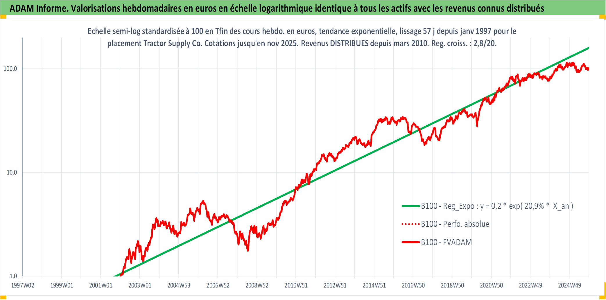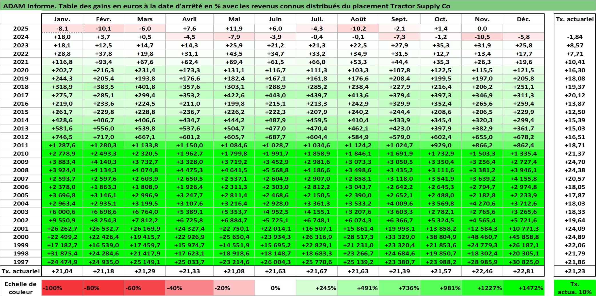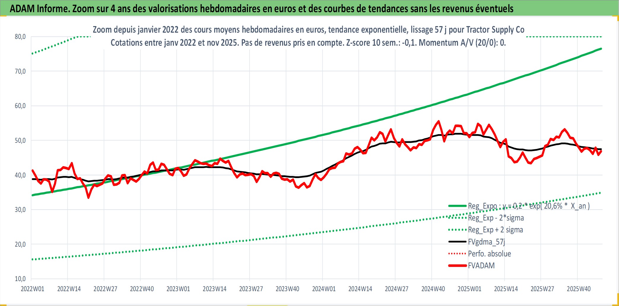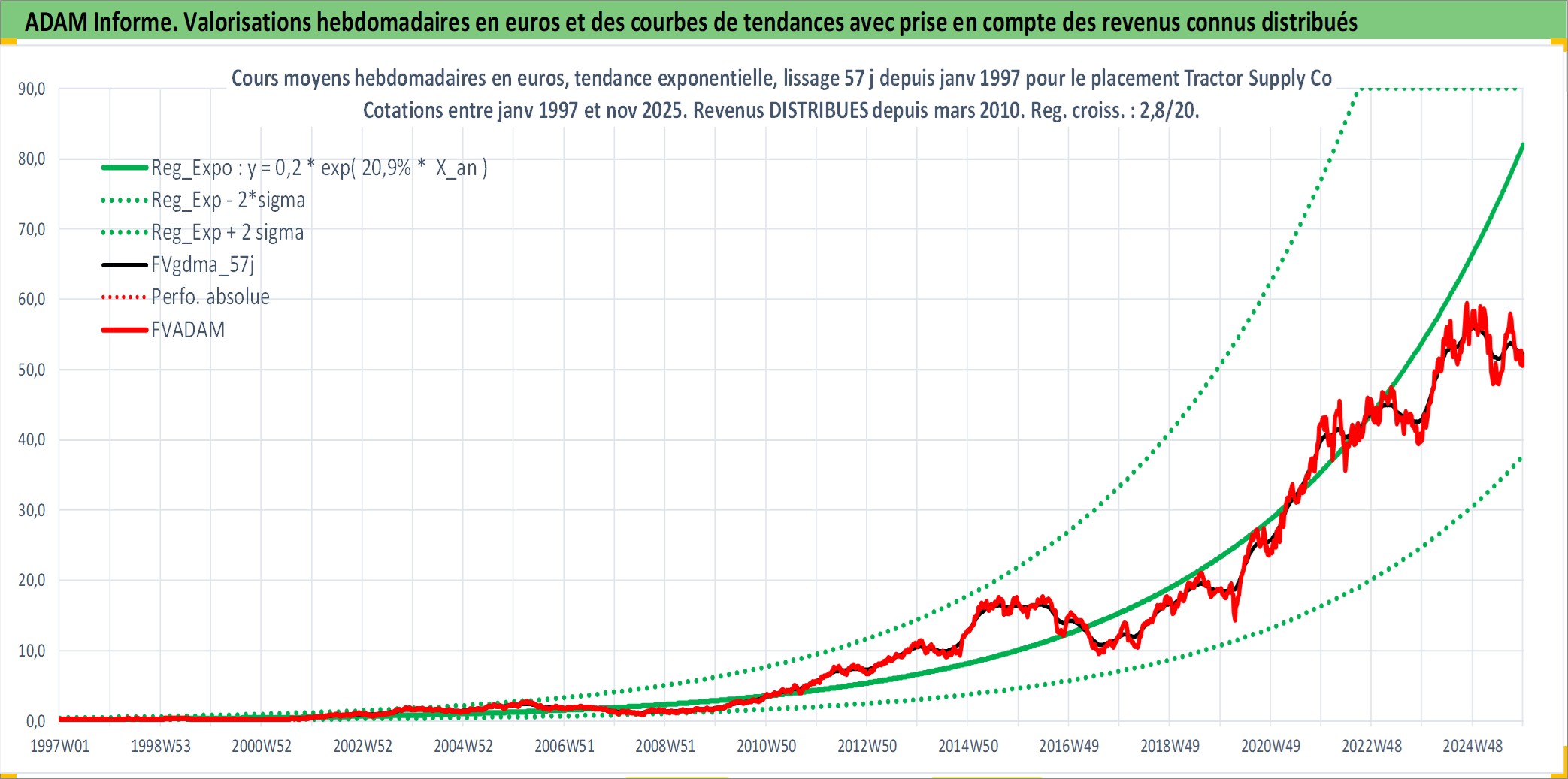 Site dédié aux investisseursPage dédiée sur site financeAnalyse des valorisations hebdomadaires de l'action Tractor Supply Co. Cet actif est cote en USD. Les valorisations sont en contrevaleur EURO et couvrent les semaines 1997W01 a 2025W48. Les revenus de cet actif financier sont pris en compte depuis la semaine 2010W10. La note globale ESG de cet actif est estimee a 14.0 (apres rebasage entre 0 et 20).