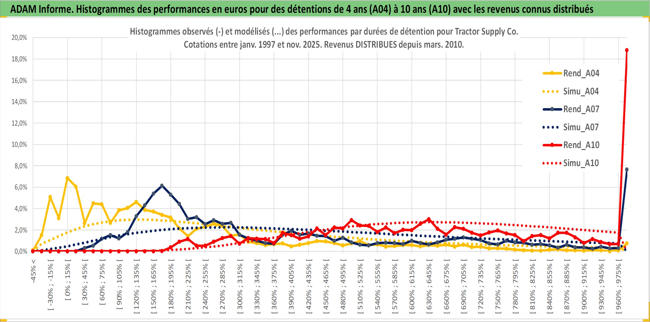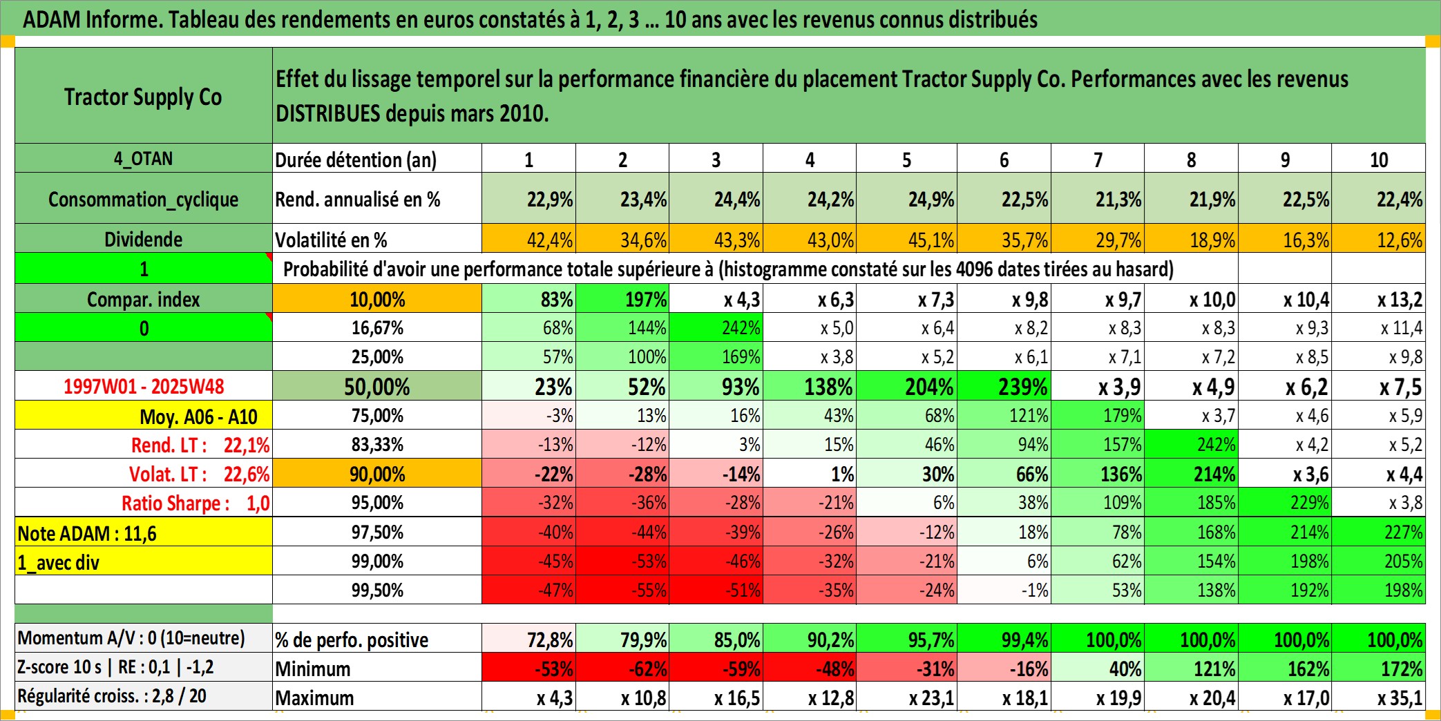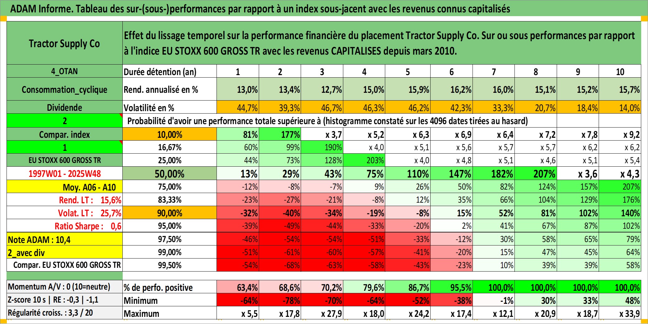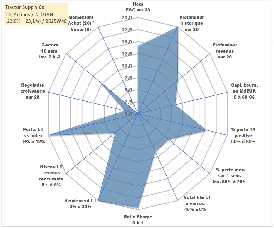 Site dédié aux investisseursPage dédiée sur site financeAnalyse des valorisations hebdomadaires de l'action Tractor Supply Co. Cet actif est cote en USD. Les valorisations sont en contrevaleur EURO et couvrent les semaines 1997W01 a 2025W48. Les revenus de cet actif financier sont pris en compte depuis la semaine 2010W10. La note globale ESG de cet actif est estimee a 14.0 (apres rebasage entre 0 et 20).