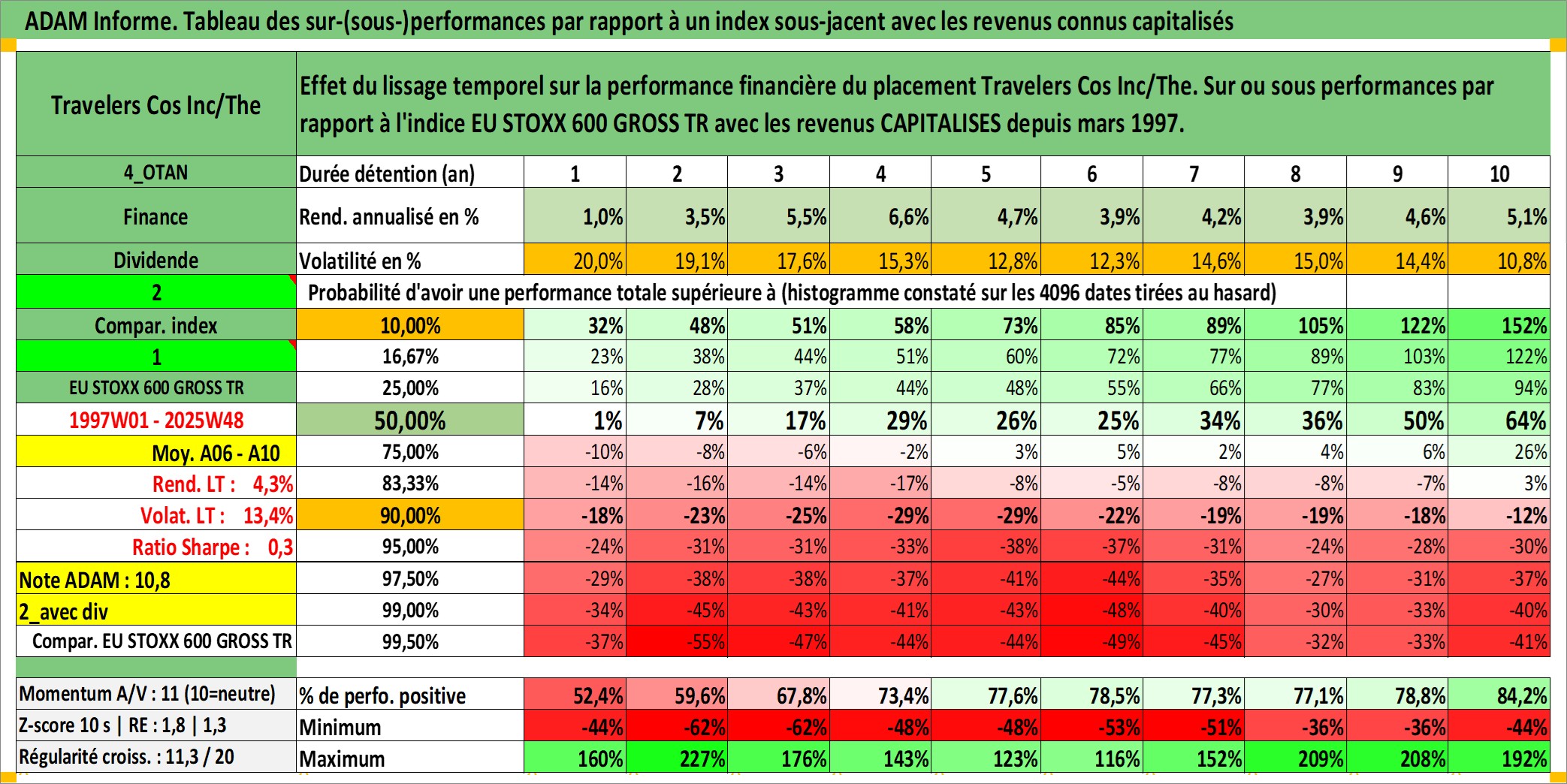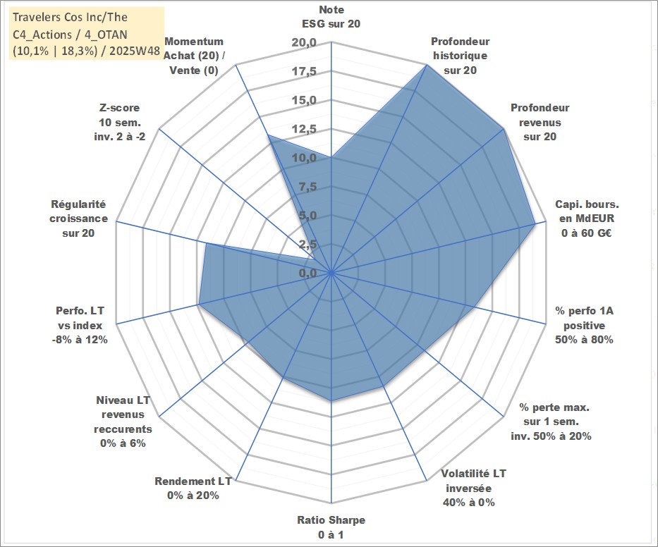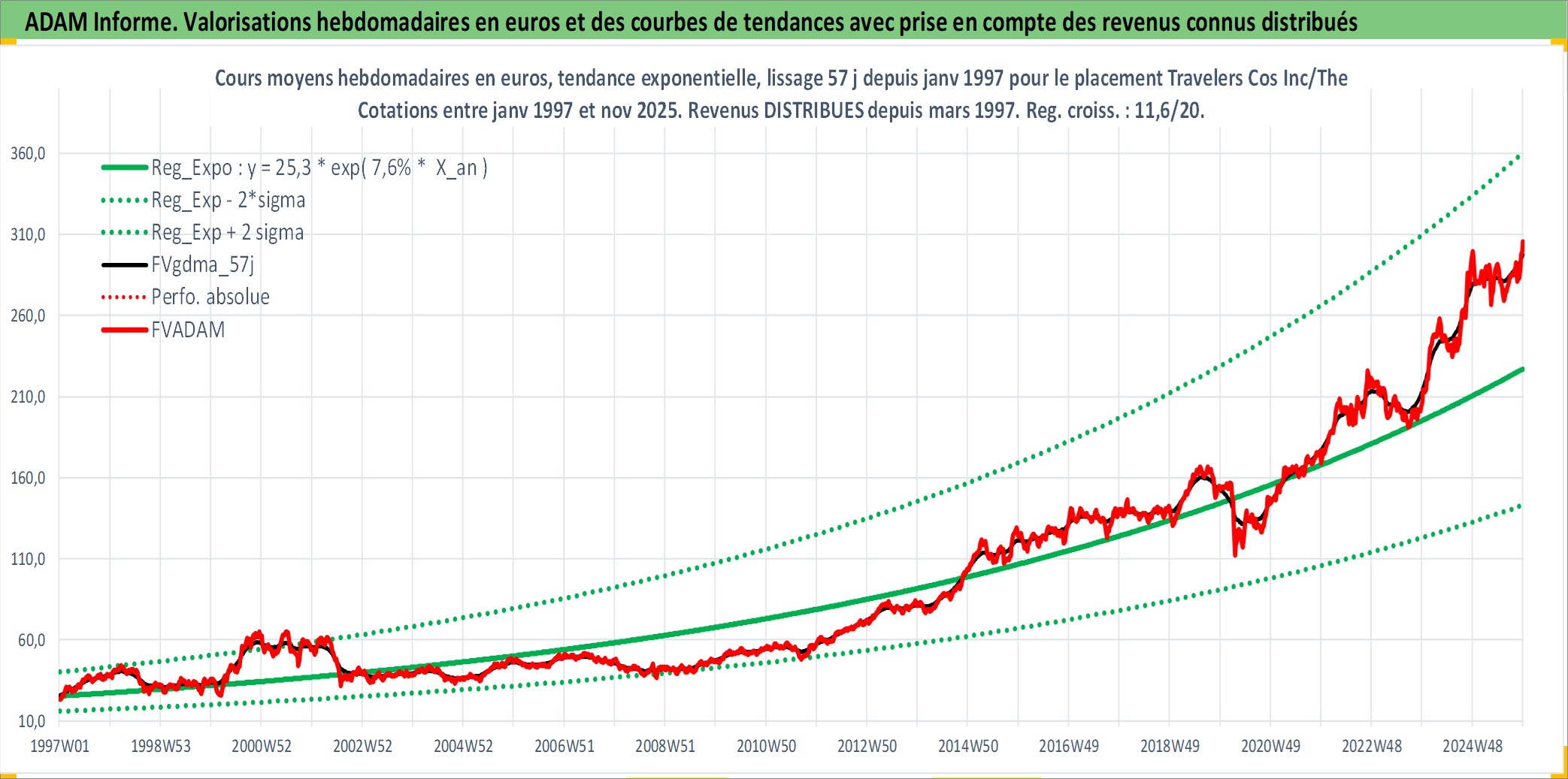 Site dédié aux investisseursPage dédiée sur site financeAnalyse des valorisations hebdomadaires de l'action Travelers Cos Inc/The. Cet actif est cote en USD. Les valorisations sont en contrevaleur EURO et couvrent les semaines 1997W01 a 2025W48. Les revenus de cet actif financier sont pris en compte depuis la semaine 1997W13. La note globale ESG de cet actif est estimee a 10.0 (apres rebasage entre 0 et 20).