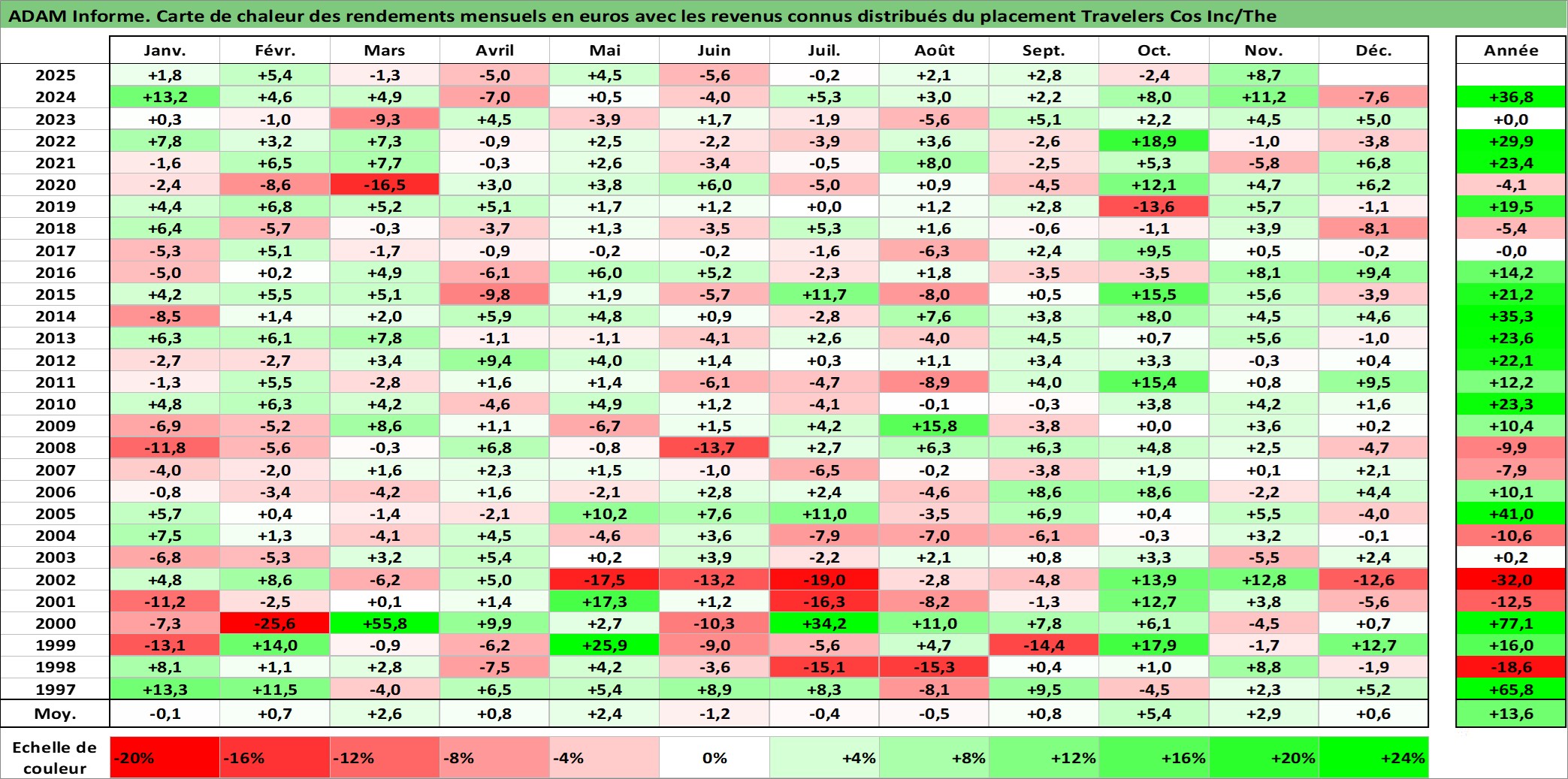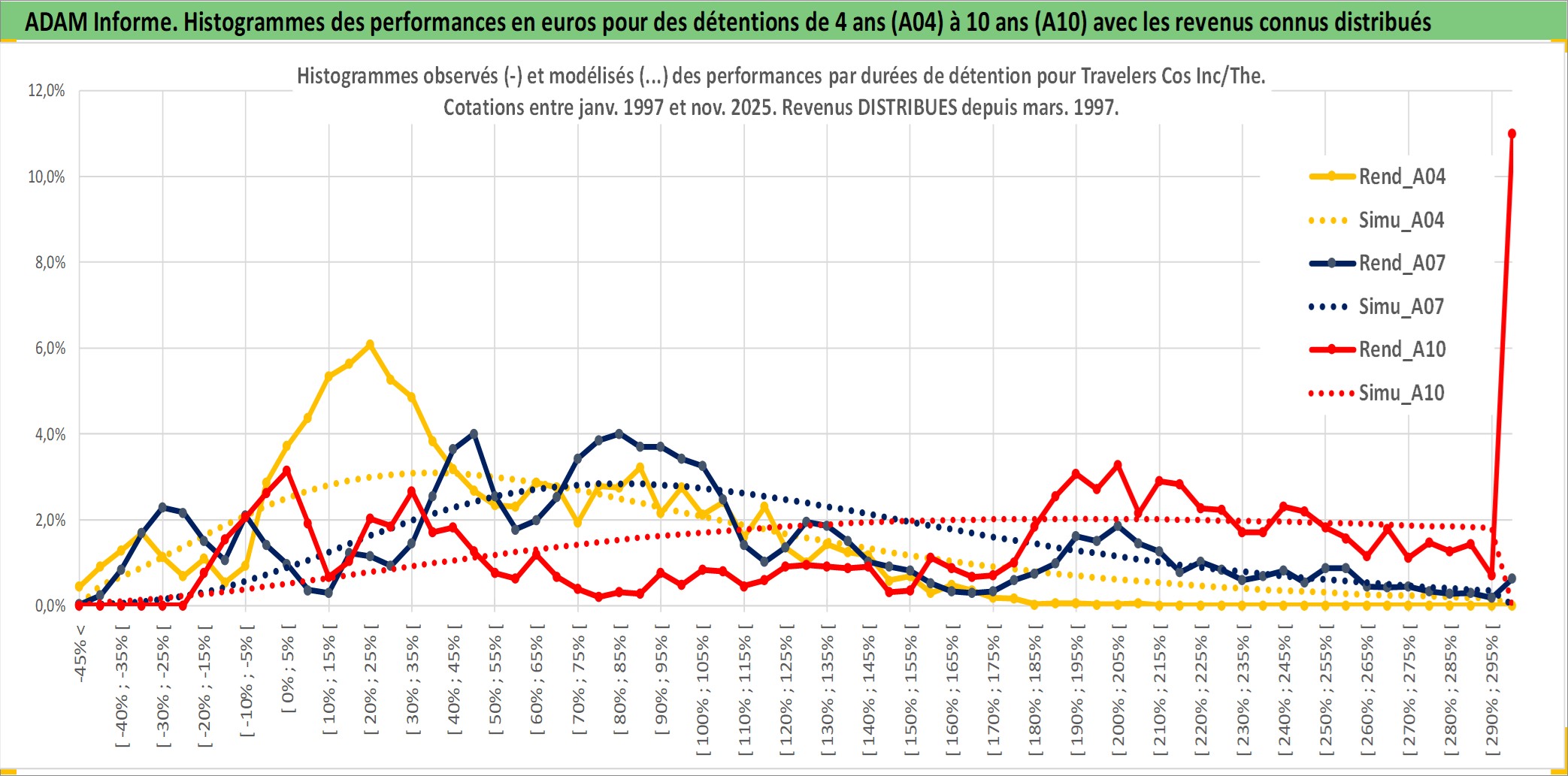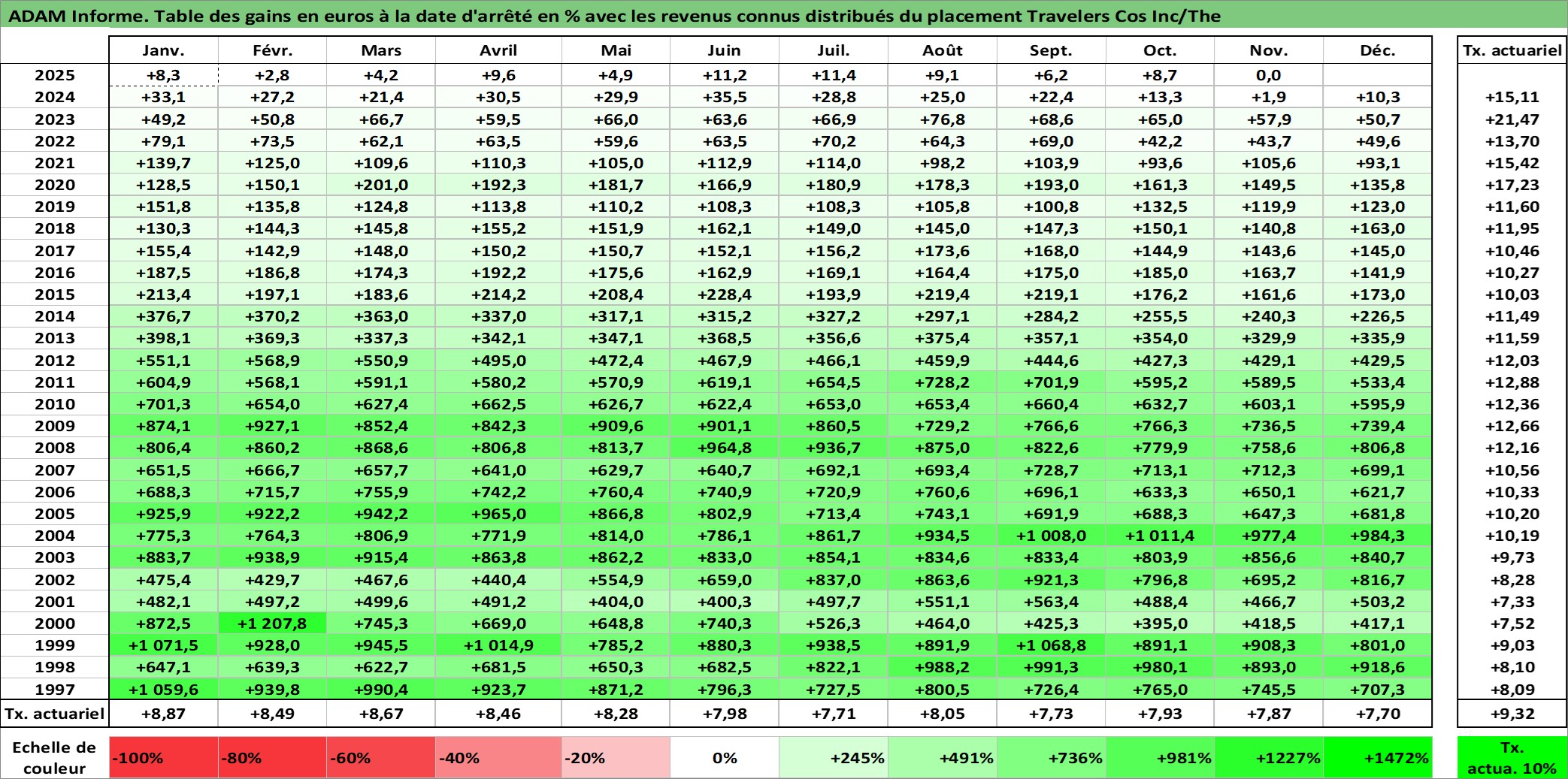 Site dédié aux investisseursPage dédiée sur site financeAnalyse des valorisations hebdomadaires de l'action Travelers Cos Inc/The. Cet actif est cote en USD. Les valorisations sont en contrevaleur EURO et couvrent les semaines 1997W01 a 2025W48. Les revenus de cet actif financier sont pris en compte depuis la semaine 1997W13. La note globale ESG de cet actif est estimee a 10.0 (apres rebasage entre 0 et 20).