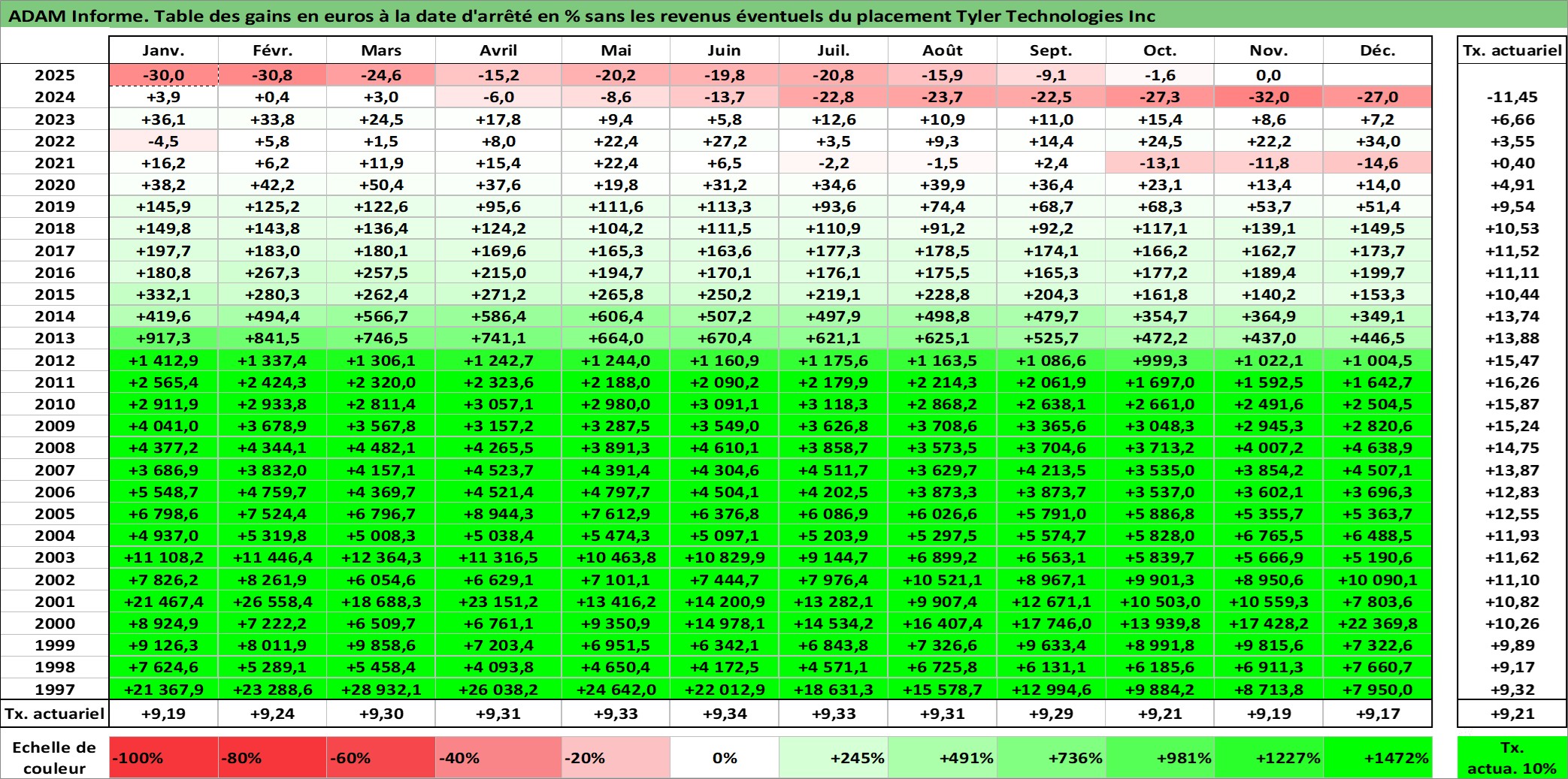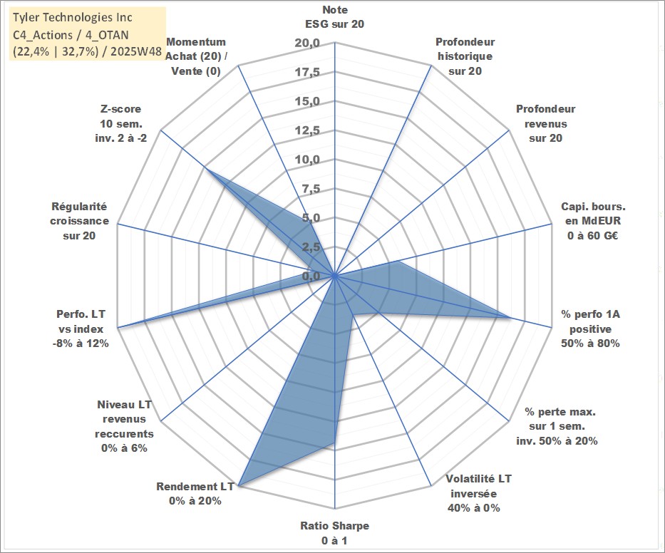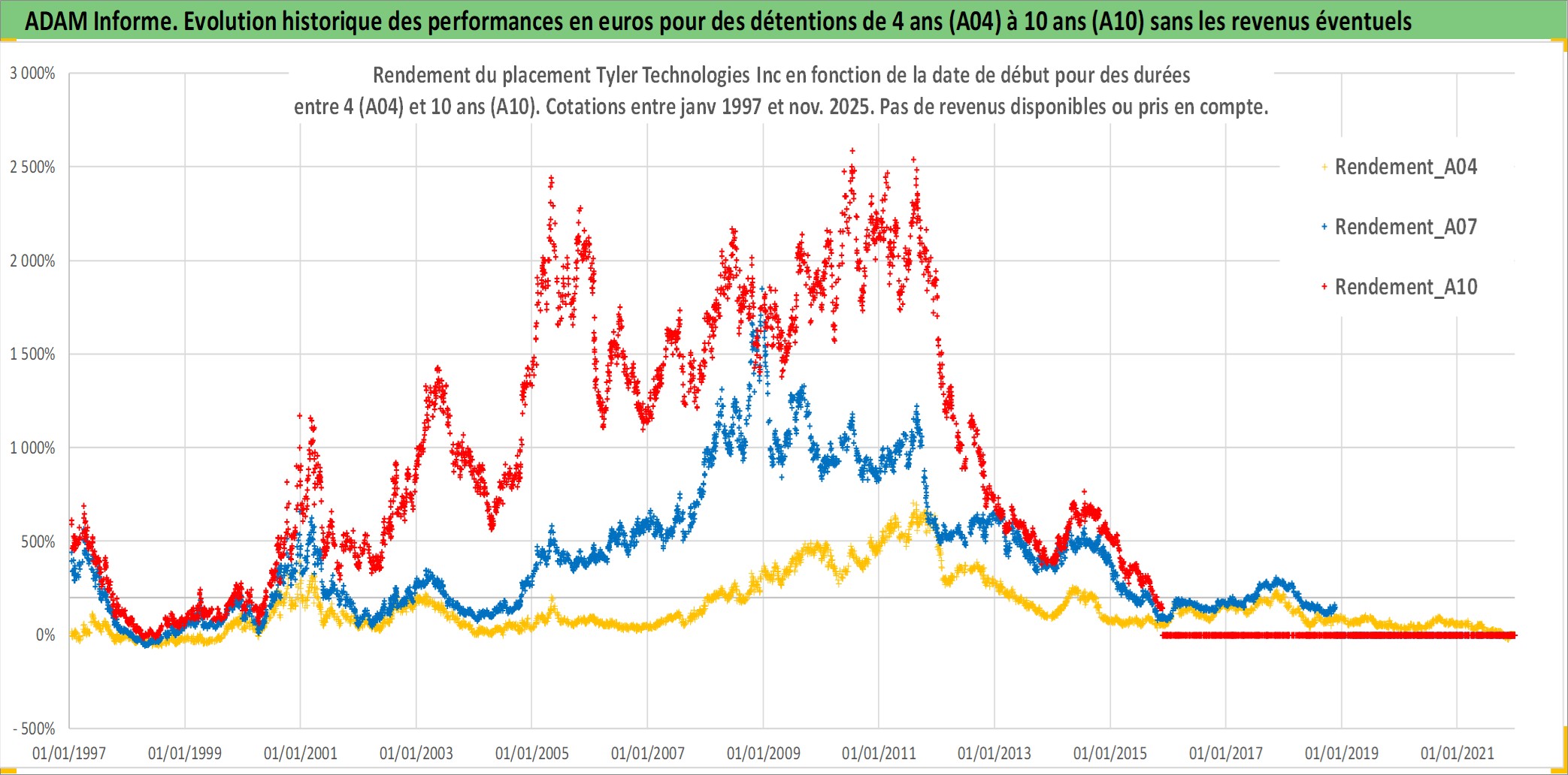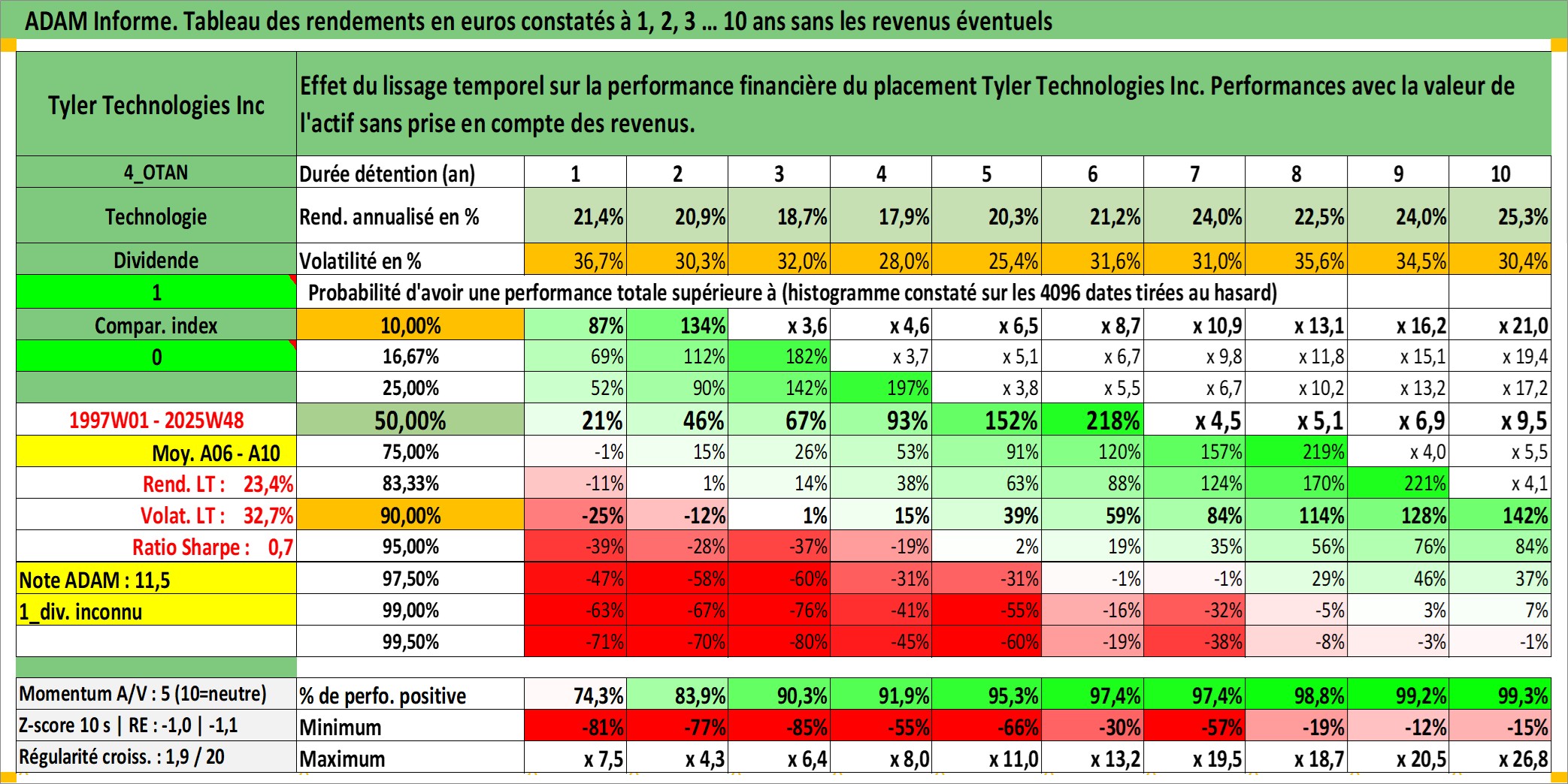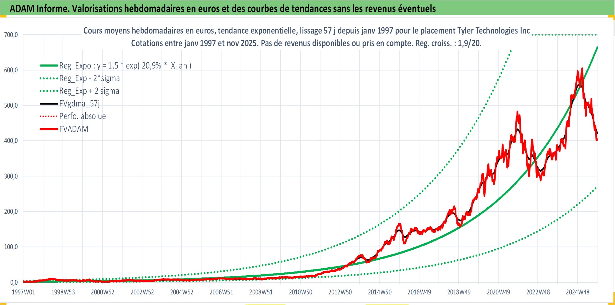 Site dédié aux investisseursPage dédiée sur site financeAnalyse des valorisations hebdomadaires de l'action Tyler Technologies Inc. Cet actif est cote en USD. Les valorisations sont en contrevaleur EURO et couvrent les semaines 1997W01 a 2025W48. Les revenus de cet actif financier ne sont pas connus car non existants ou non disponibles sur le site Yahoo Finance. La note ESG de cet actif n'est pas connue.