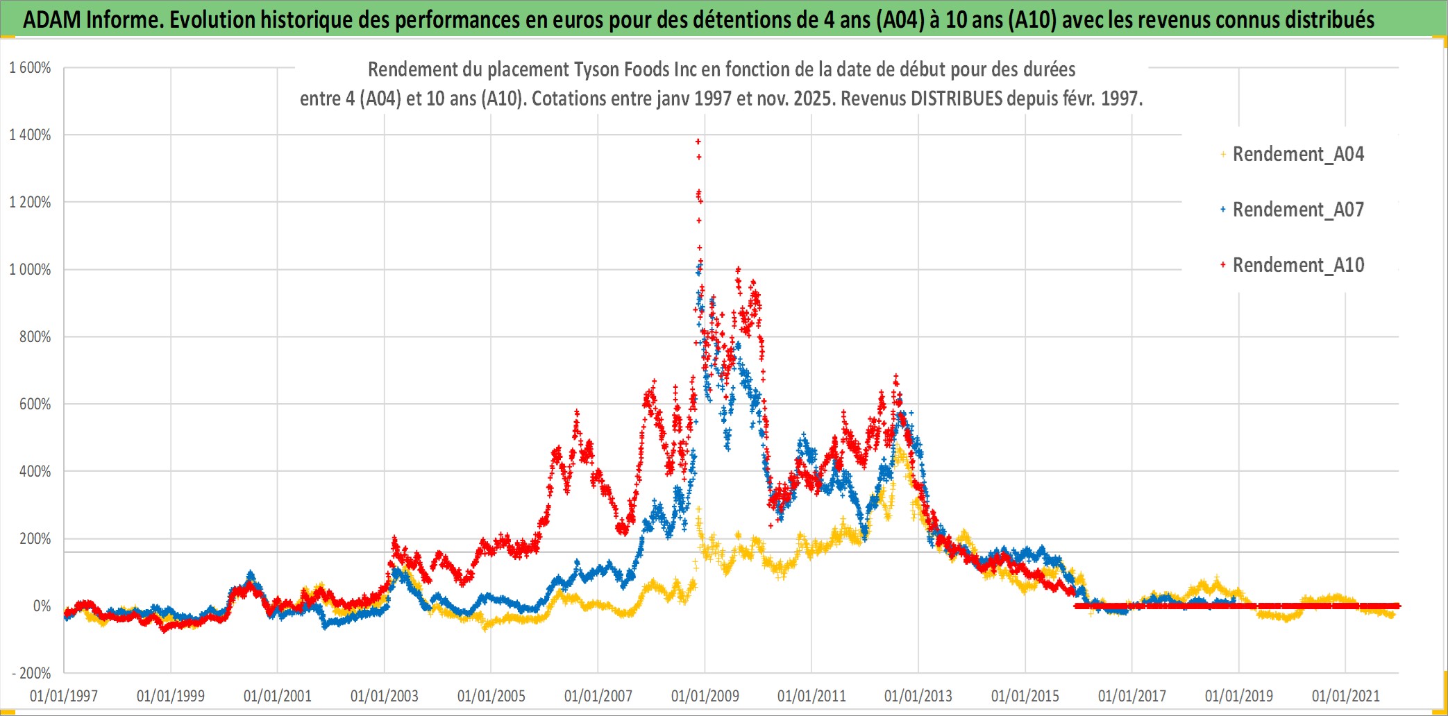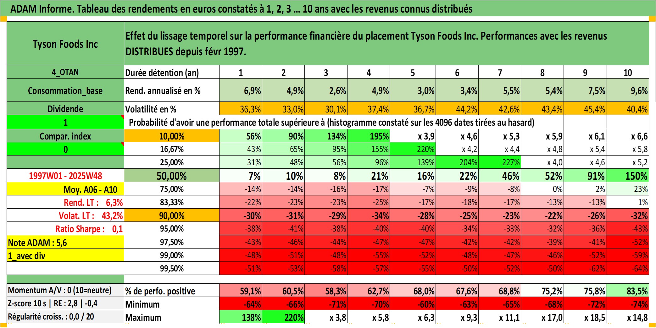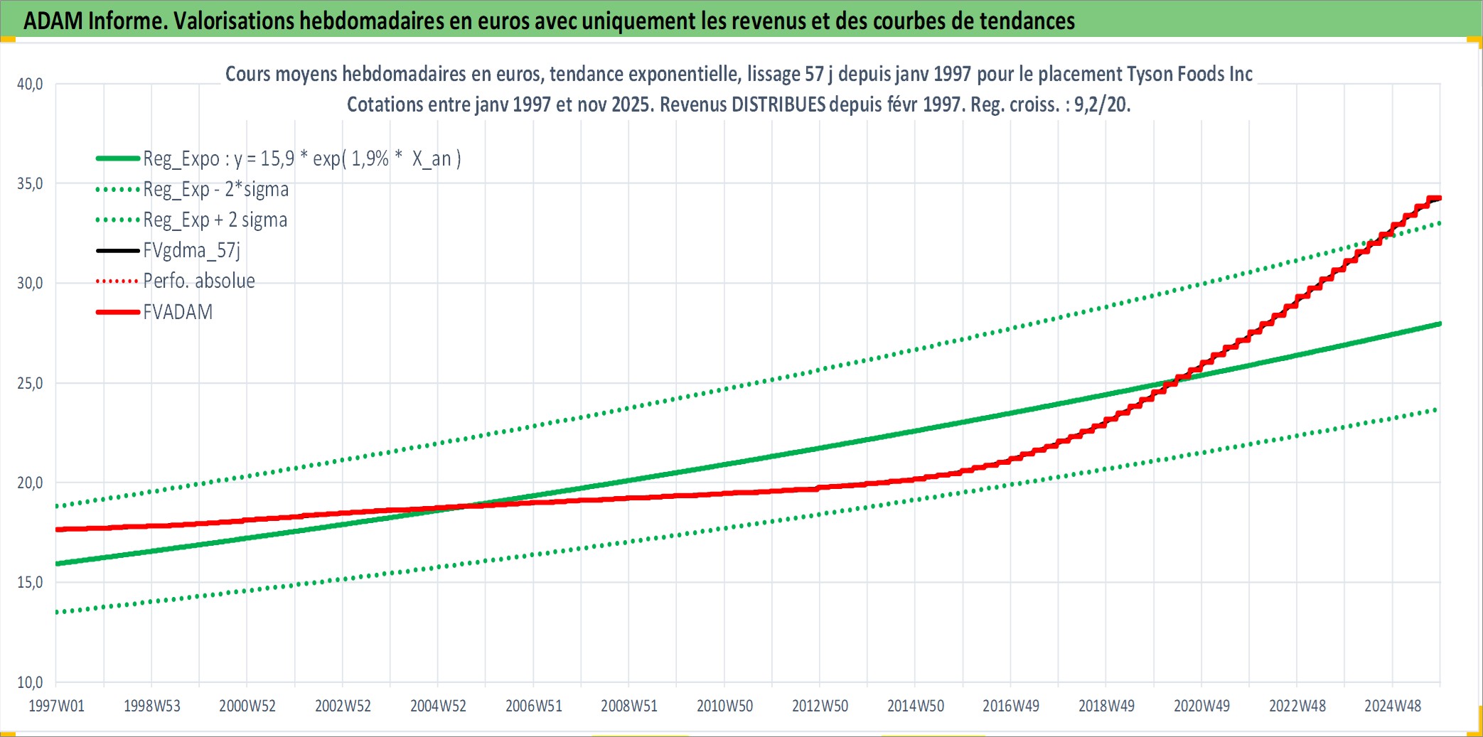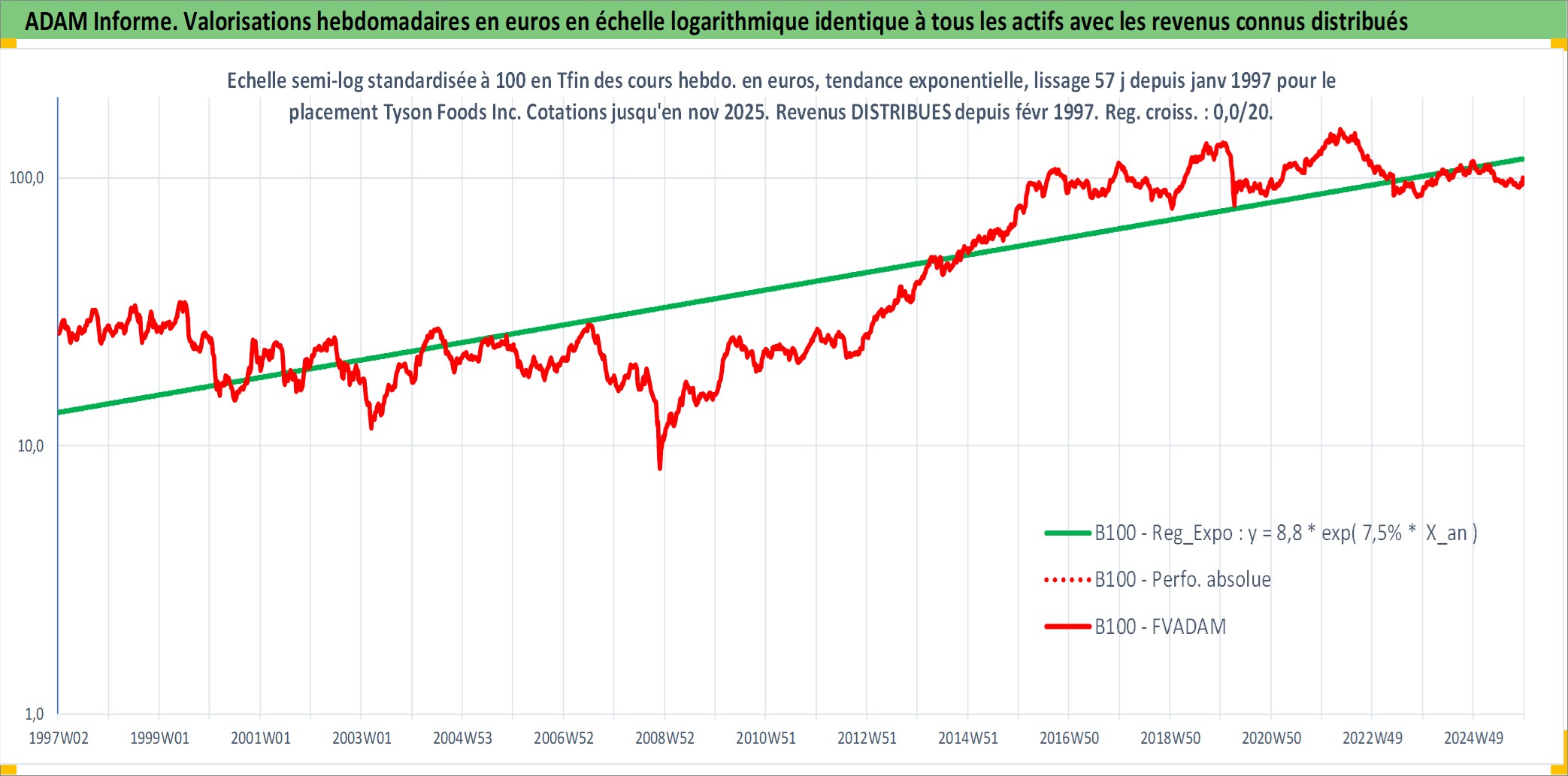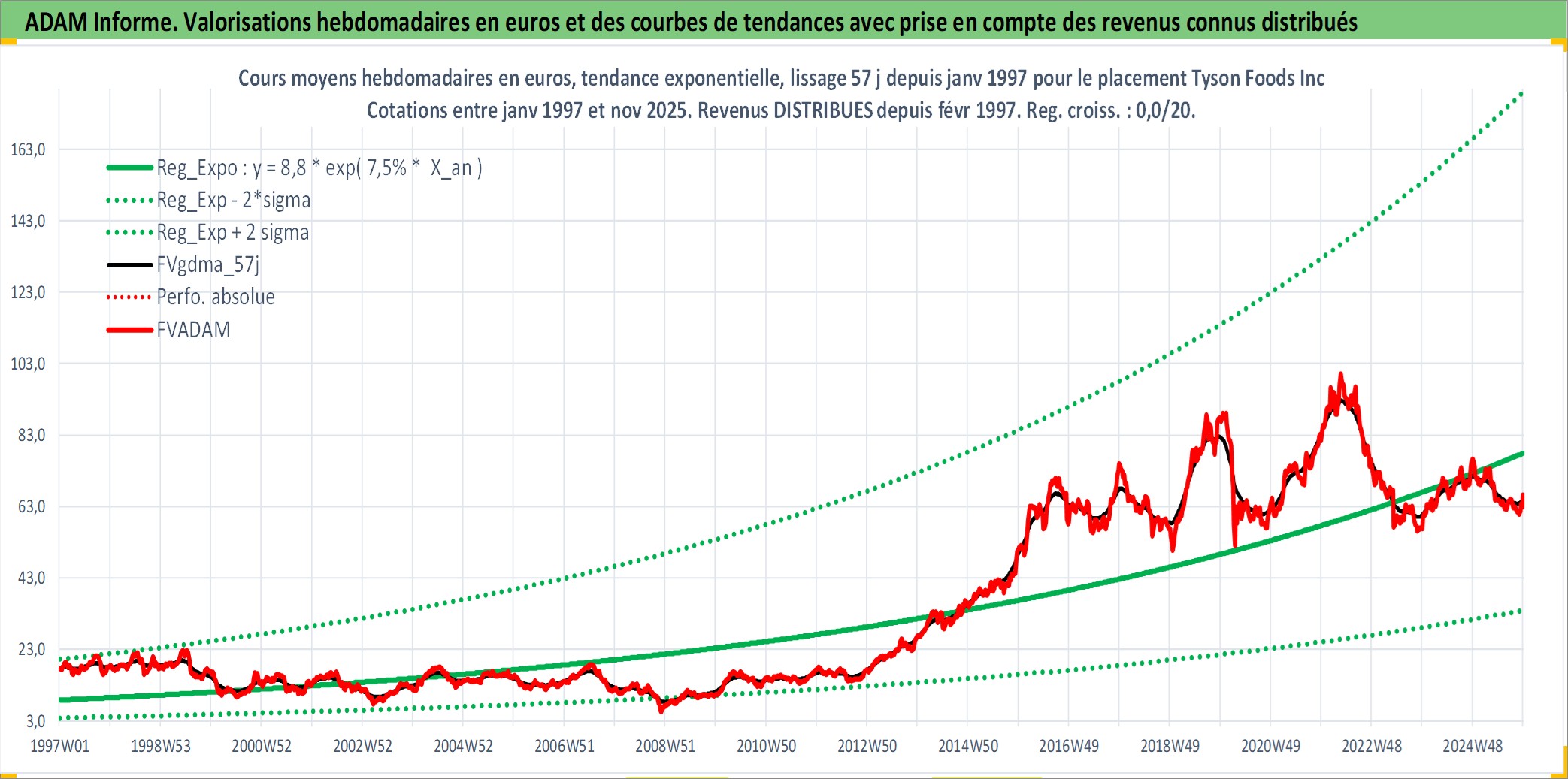 Site dédié aux investisseursPage dédiée sur site financeAnalyse des valorisations hebdomadaires de l'action Tyson Foods Inc. Cet actif est cote en USD. Les valorisations sont en contrevaleur EURO et couvrent les semaines 1997W01 a 2025W48. Les revenus de cet actif financier sont pris en compte depuis la semaine 1997W09. La note globale ESG de cet actif est estimee a 3.0 (apres rebasage entre 0 et 20).