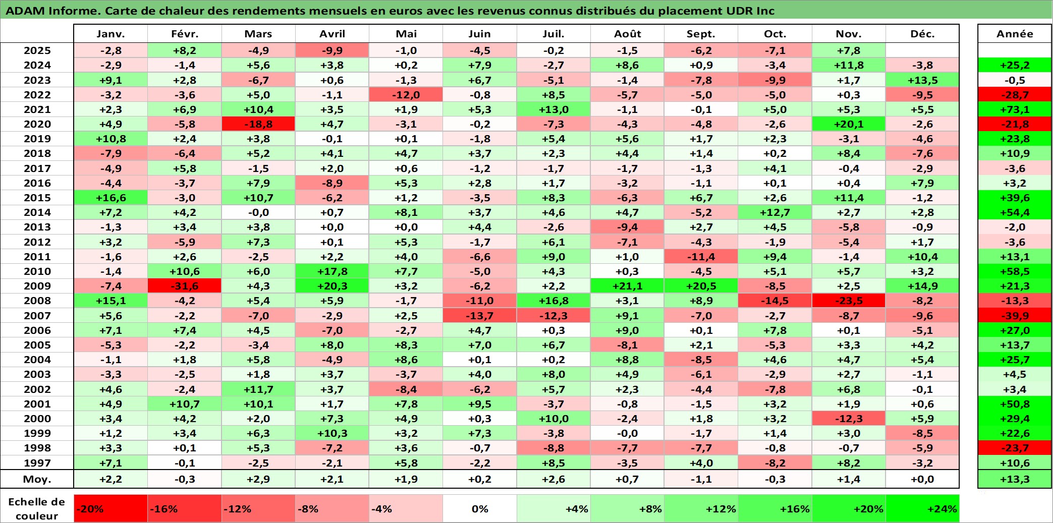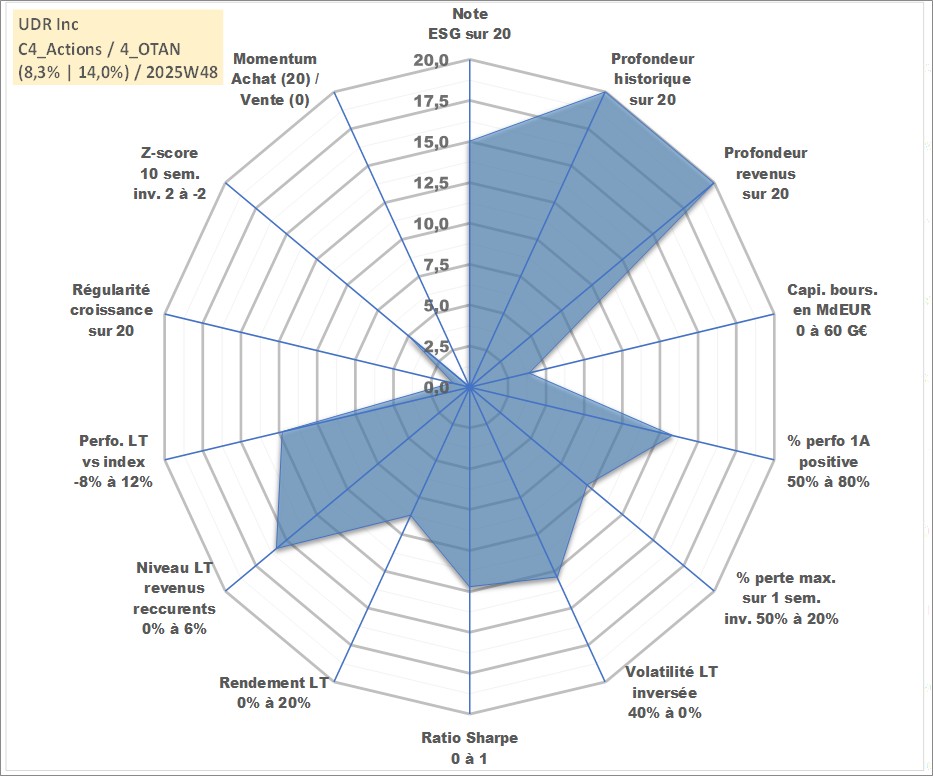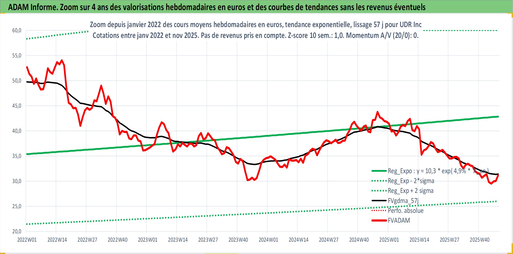 Site dédié aux investisseursPage dédiée sur site financeAnalyse des valorisations hebdomadaires de l'action UDR Inc. Cet actif est cote en USD. Les valorisations sont en contrevaleur EURO et couvrent les semaines 1997W01 a 2025W48. Les revenus de cet actif financier sont pris en compte depuis la semaine 1997W15. La note globale ESG de cet actif est estimee a 15.0 (apres rebasage entre 0 et 20).