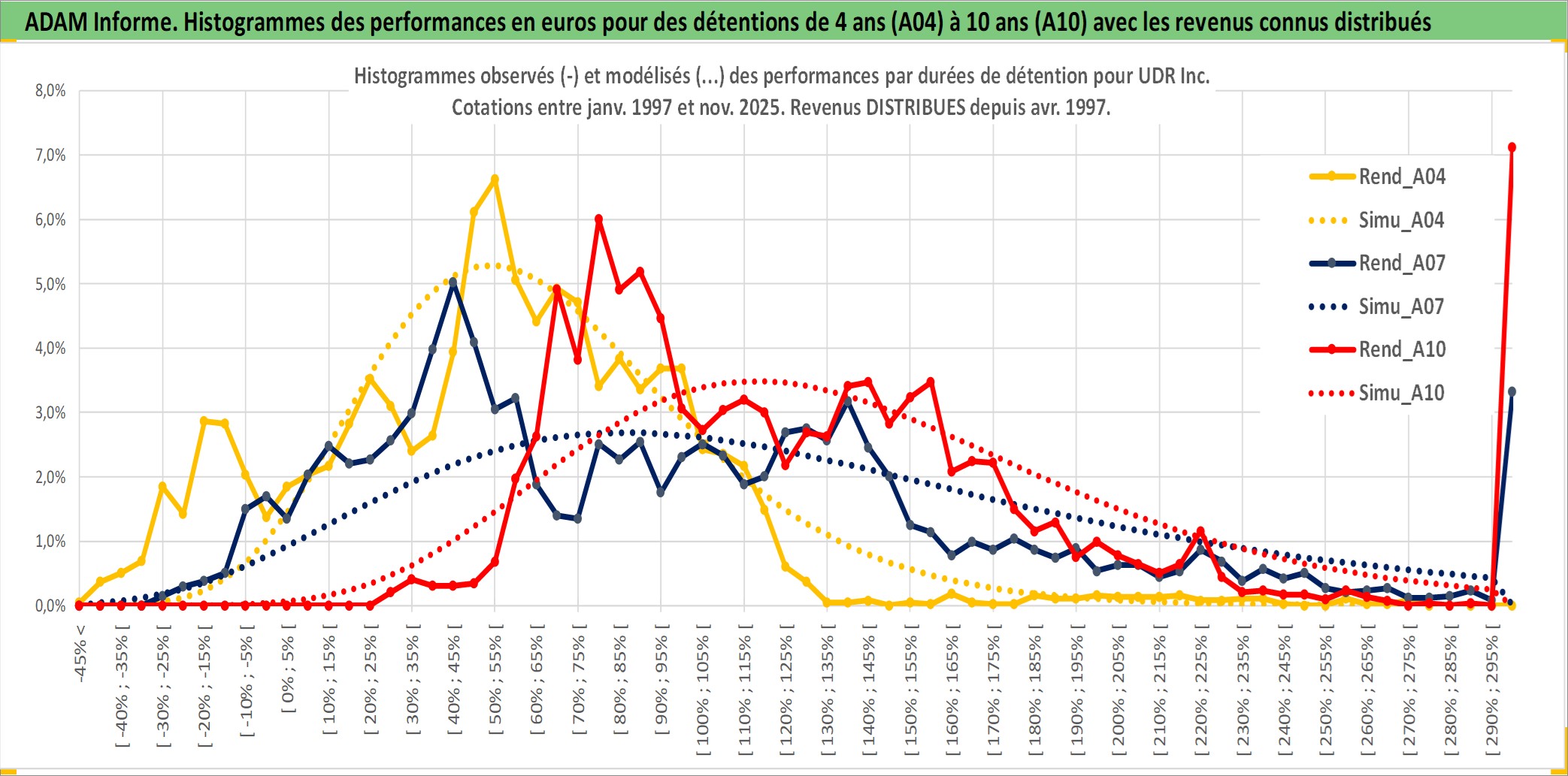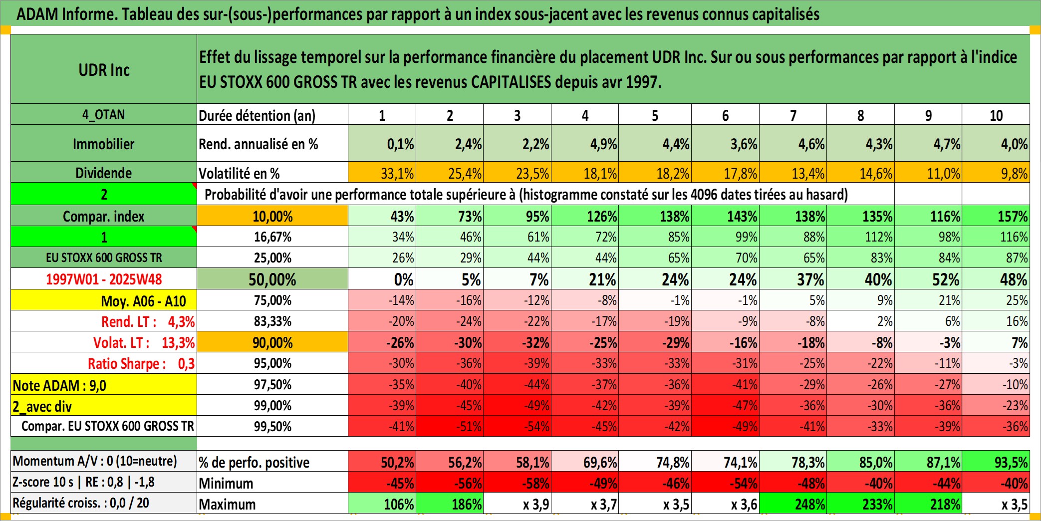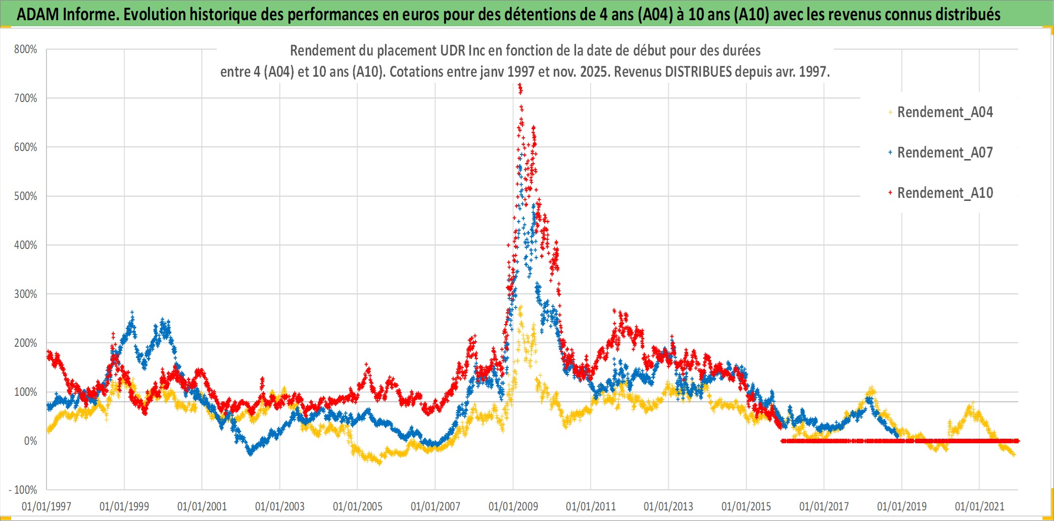 Site dédié aux investisseursPage dédiée sur site financeAnalyse des valorisations hebdomadaires de l'action UDR Inc. Cet actif est cote en USD. Les valorisations sont en contrevaleur EURO et couvrent les semaines 1997W01 a 2025W48. Les revenus de cet actif financier sont pris en compte depuis la semaine 1997W15. La note globale ESG de cet actif est estimee a 15.0 (apres rebasage entre 0 et 20).