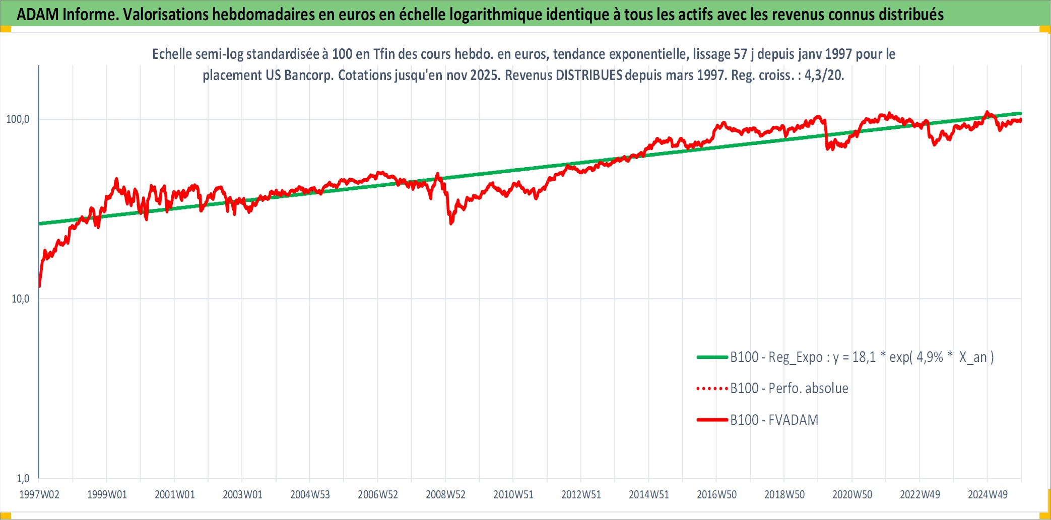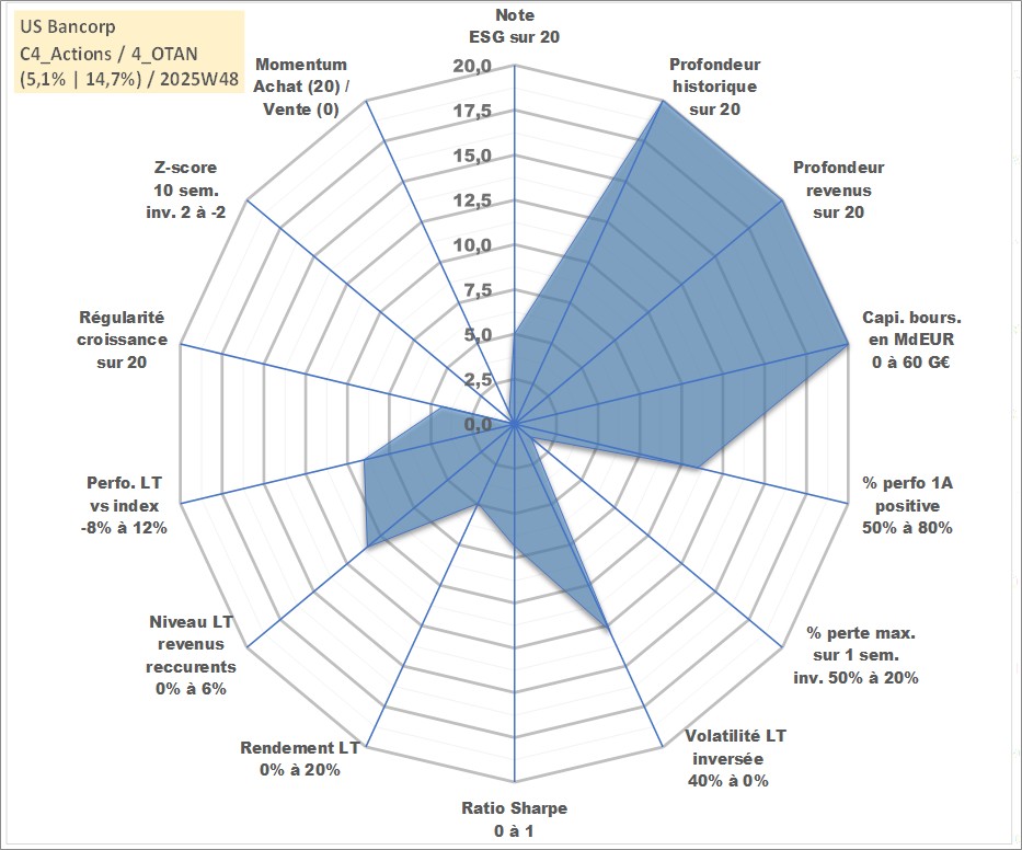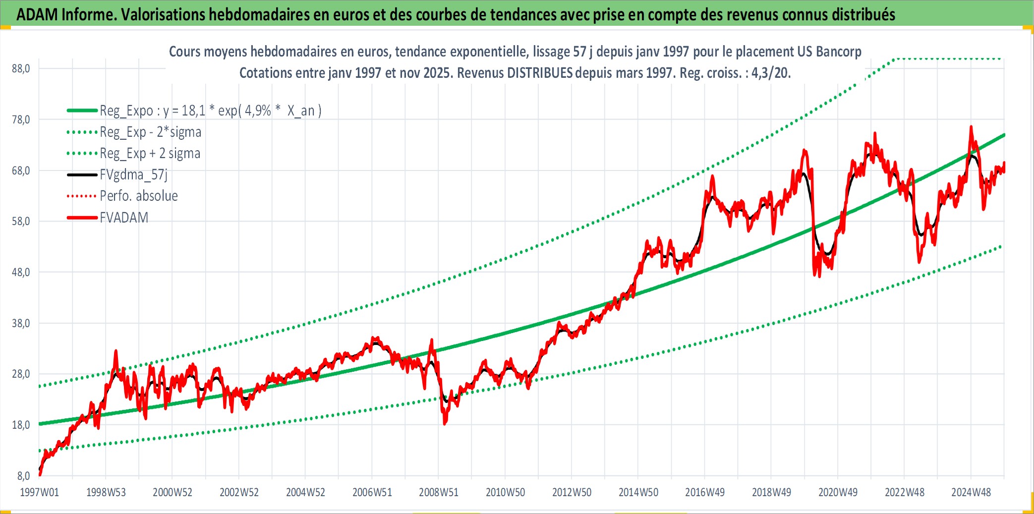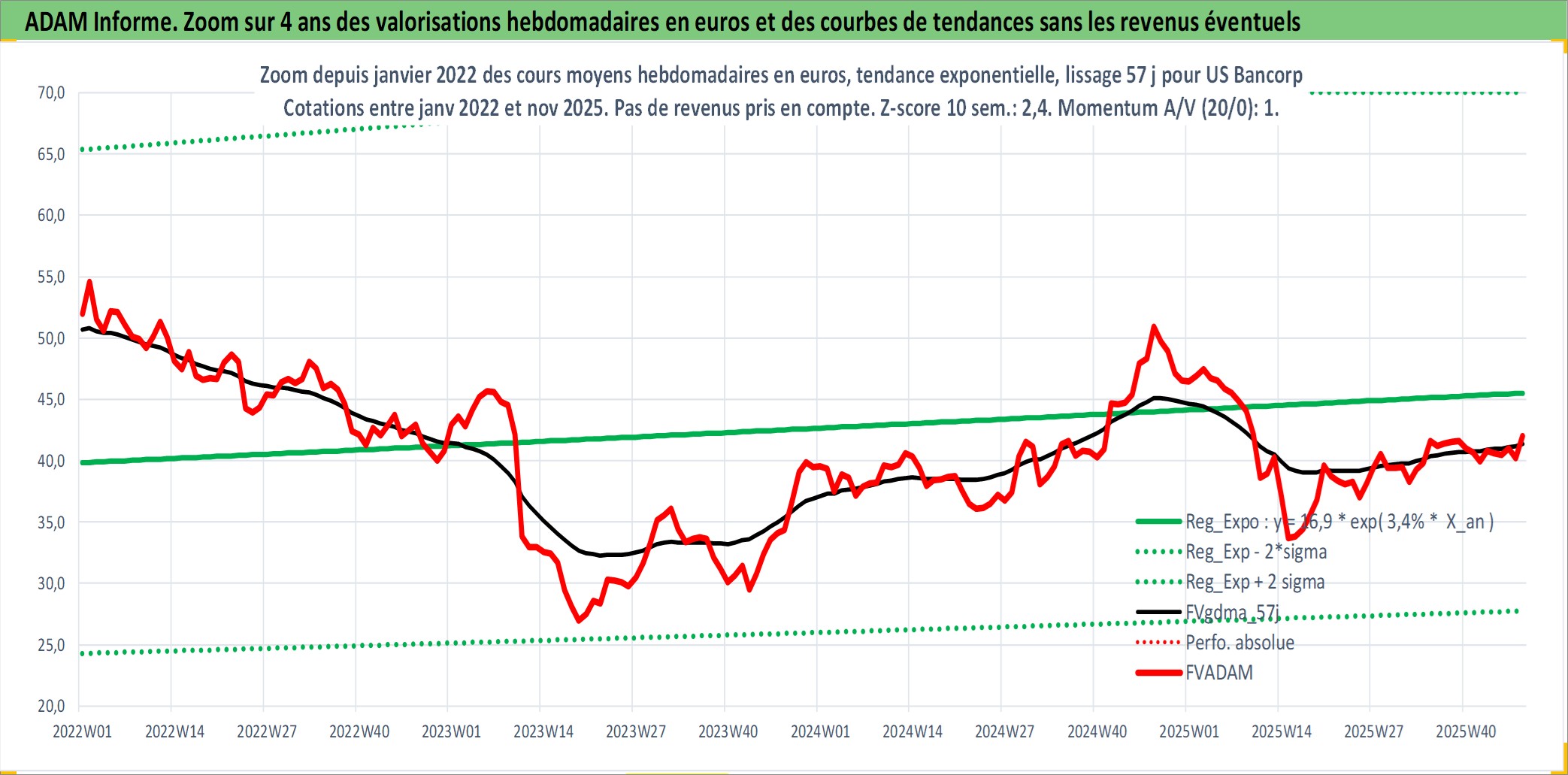 Site dédié aux investisseursPage dédiée sur site financeAnalyse des valorisations hebdomadaires de l'action US Bancorp. Cet actif est cote en USD. Les valorisations sont en contrevaleur EURO et couvrent les semaines 1997W01 a 2025W48. Les revenus de cet actif financier sont pris en compte depuis la semaine 1997W13. La note globale ESG de cet actif est estimee a 5.0 (apres rebasage entre 0 et 20).