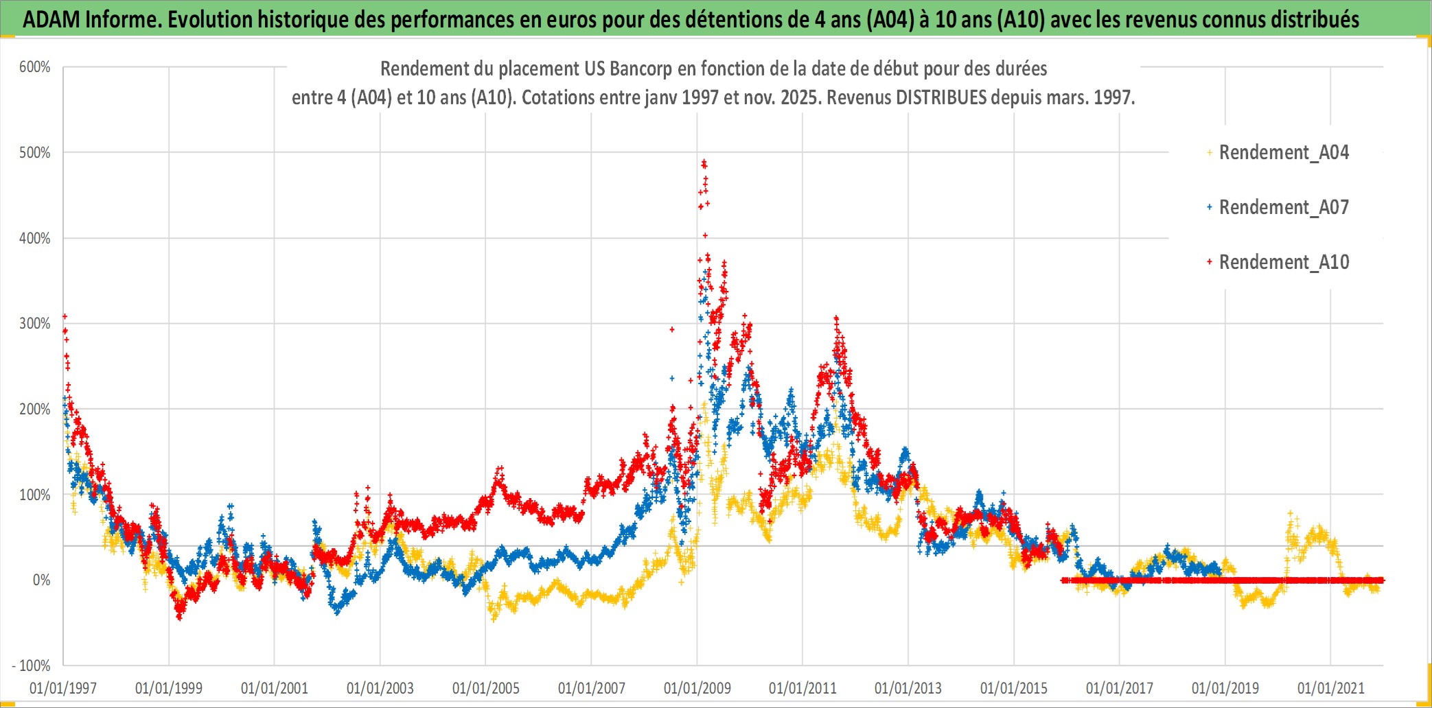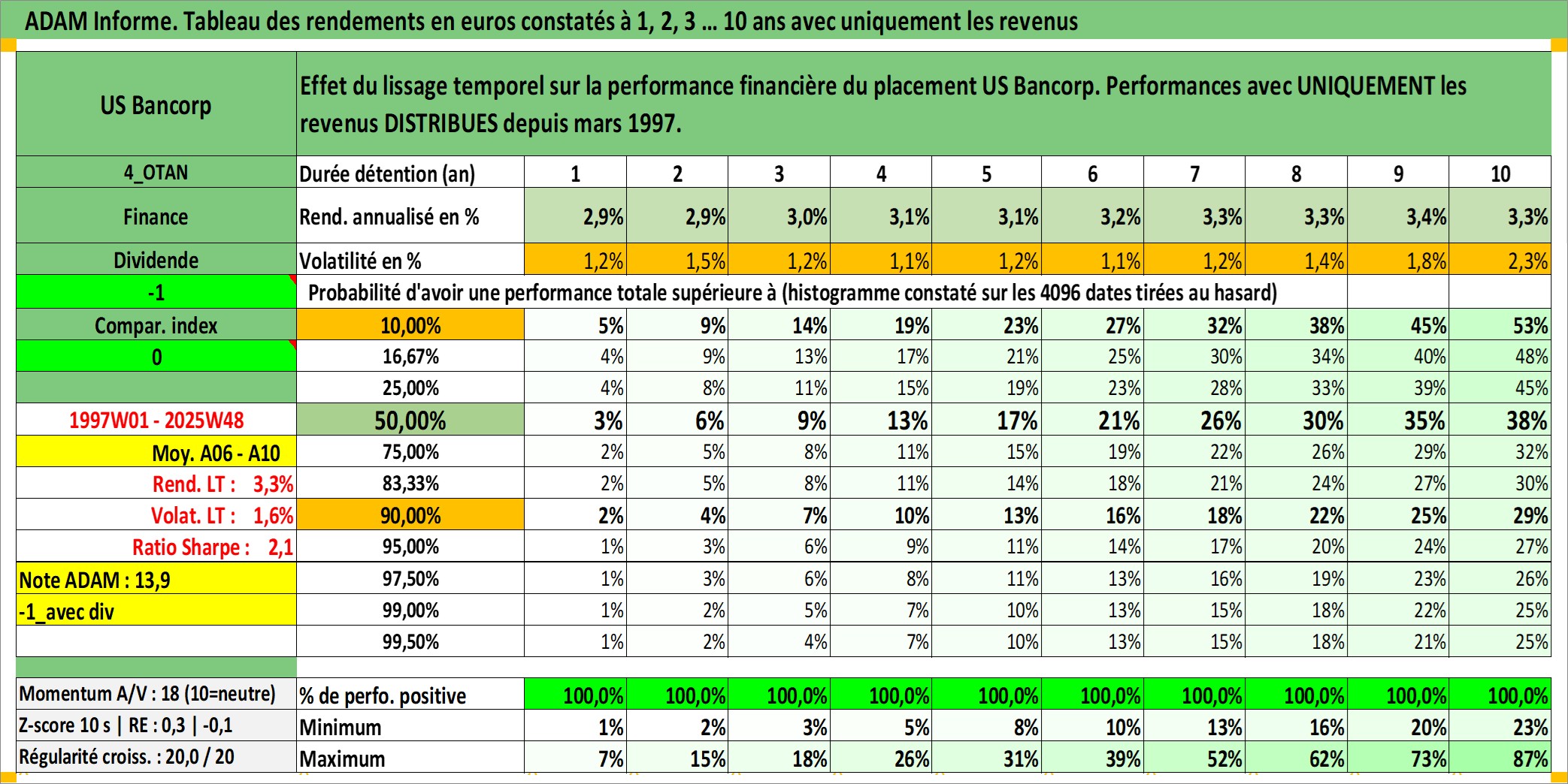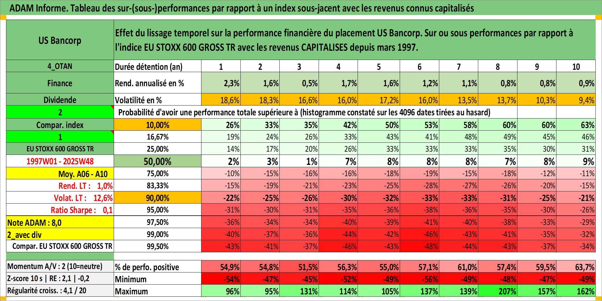 Site dédié aux investisseursPage dédiée sur site financeAnalyse des valorisations hebdomadaires de l'action US Bancorp. Cet actif est cote en USD. Les valorisations sont en contrevaleur EURO et couvrent les semaines 1997W01 a 2025W48. Les revenus de cet actif financier sont pris en compte depuis la semaine 1997W13. La note globale ESG de cet actif est estimee a 5.0 (apres rebasage entre 0 et 20).