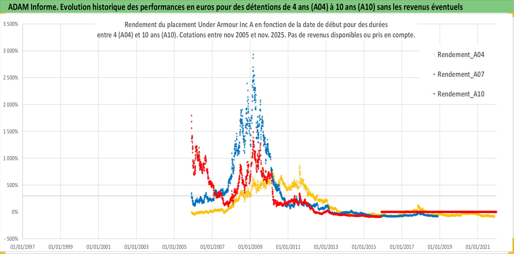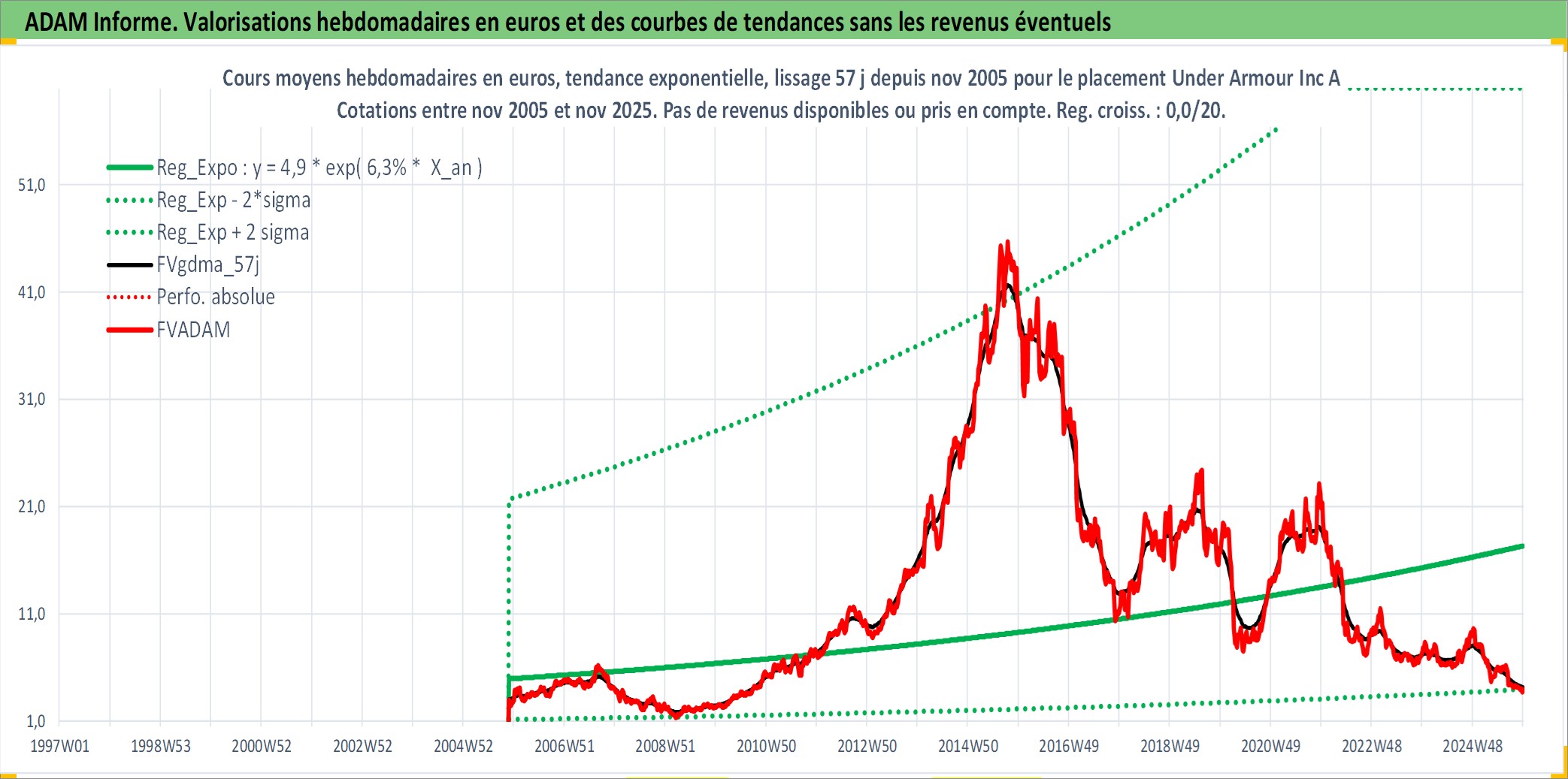 Site dédié aux investisseursPage dédiée sur site financeAnalyse des valorisations hebdomadaires de l'action Under Armour Inc A. Cet actif est cote en USD. Les valorisations sont en contrevaleur EURO et couvrent les semaines 2005W46 a 2025W48. Les revenus de cet actif financier ne sont pas connus car non existants ou non disponibles sur le site Yahoo Finance. La note globale ESG de cet actif est estimee a 13.0 (apres rebasage entre 0 et 20).