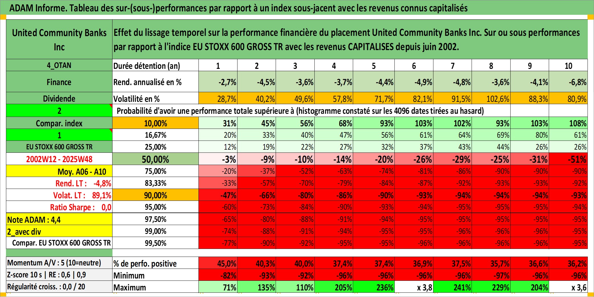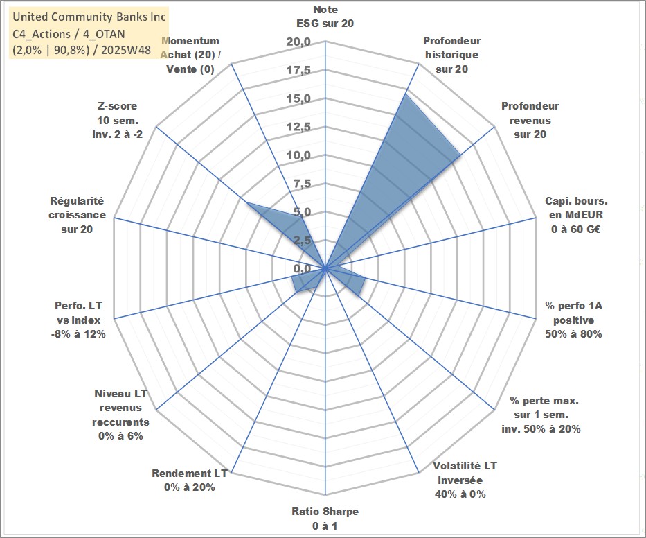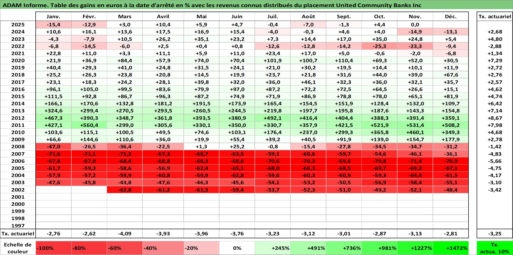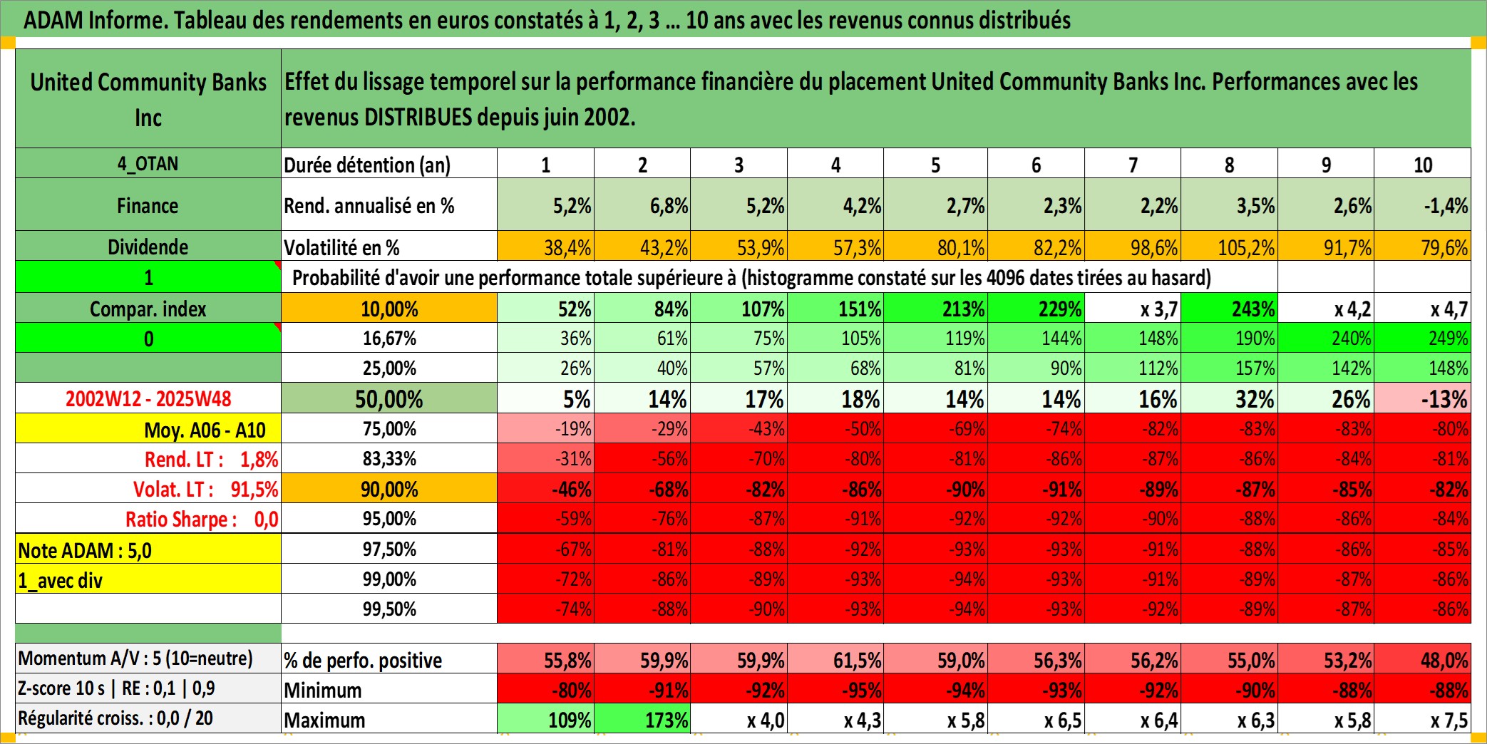 Site dédié aux investisseursPage dédiée sur site financeAnalyse des valorisations hebdomadaires de l'action United Community Banks Inc. Cet actif est cote en USD. Les valorisations sont en contrevaleur EURO et couvrent les semaines 2002W12 a 2025W48. Les revenus de cet actif financier sont pris en compte depuis la semaine 2002W24. La note ESG de cet actif n'est pas connue.