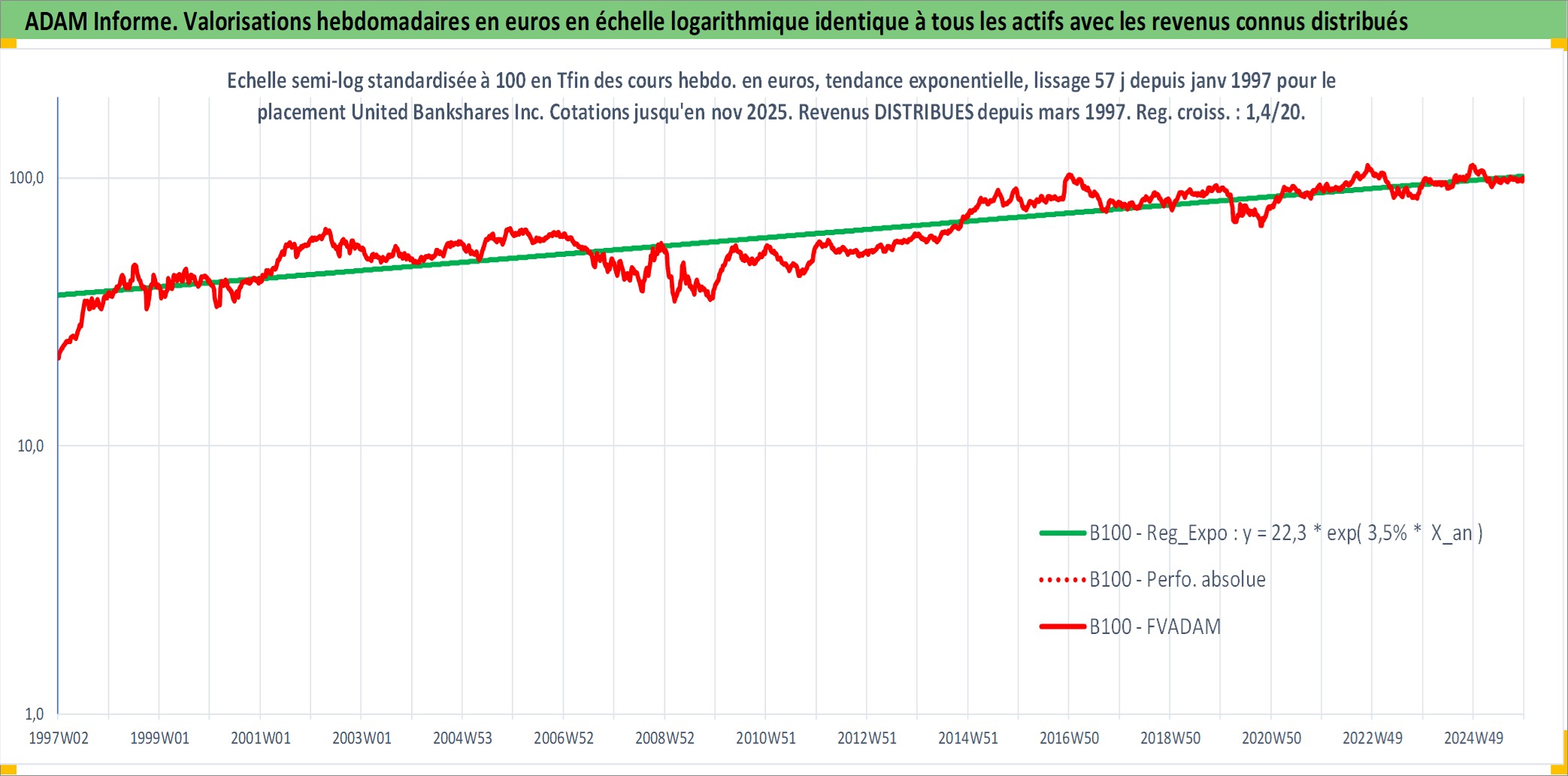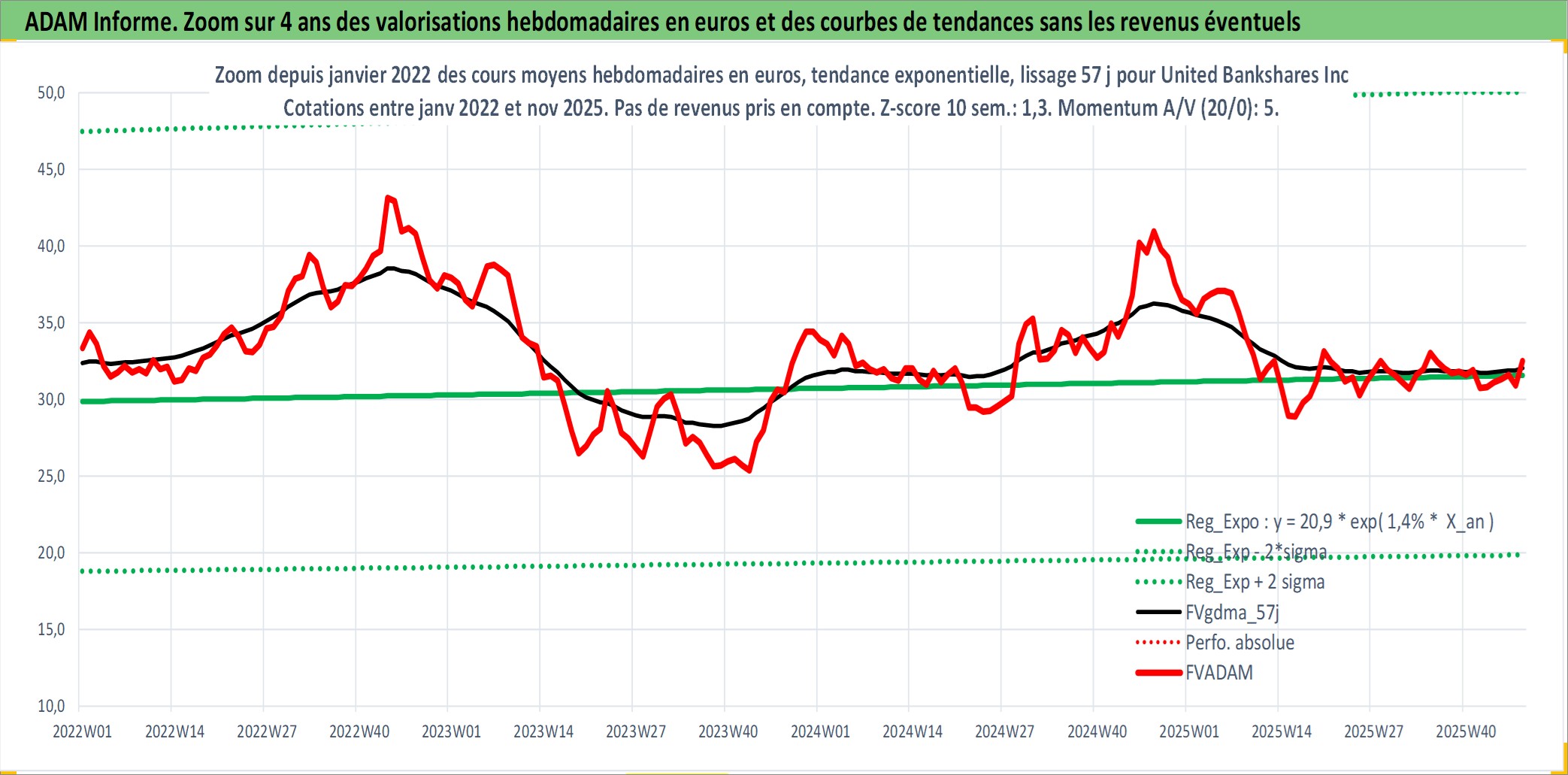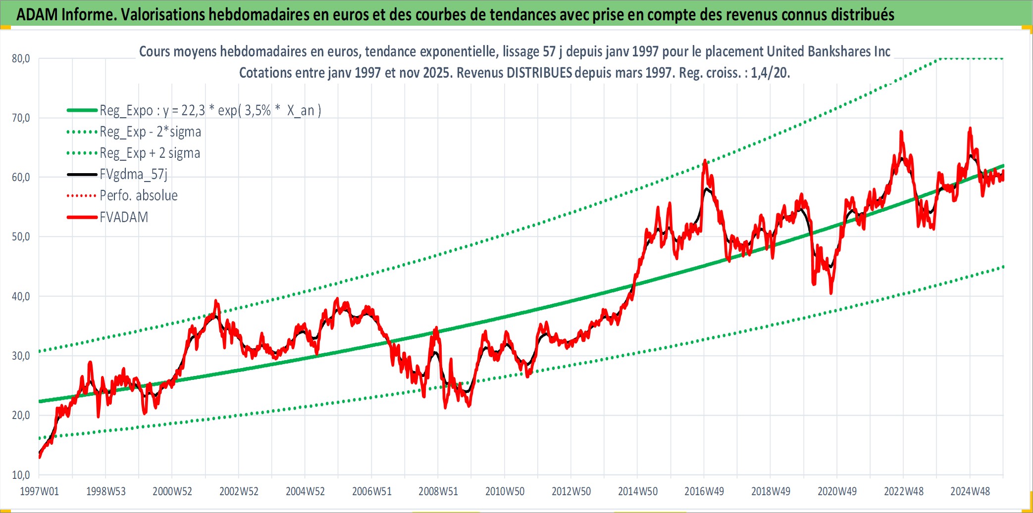 Site dédié aux investisseursPage dédiée sur site financeAnalyse des valorisations hebdomadaires de l'action United Bankshares Inc. Cet actif est cote en USD. Les valorisations sont en contrevaleur EURO et couvrent les semaines 1997W01 a 2025W48. Les revenus de cet actif financier sont pris en compte depuis la semaine 1997W11. La note ESG de cet actif n'est pas connue.