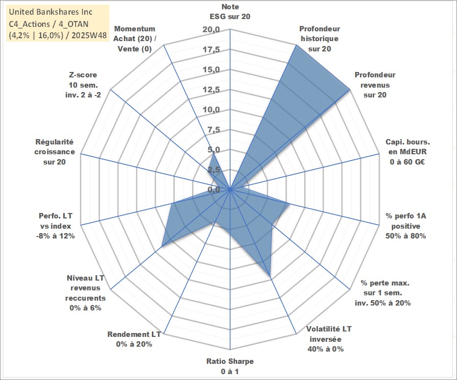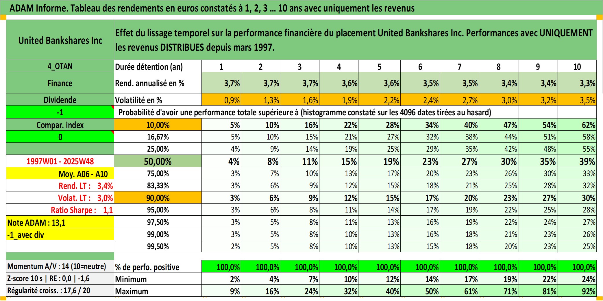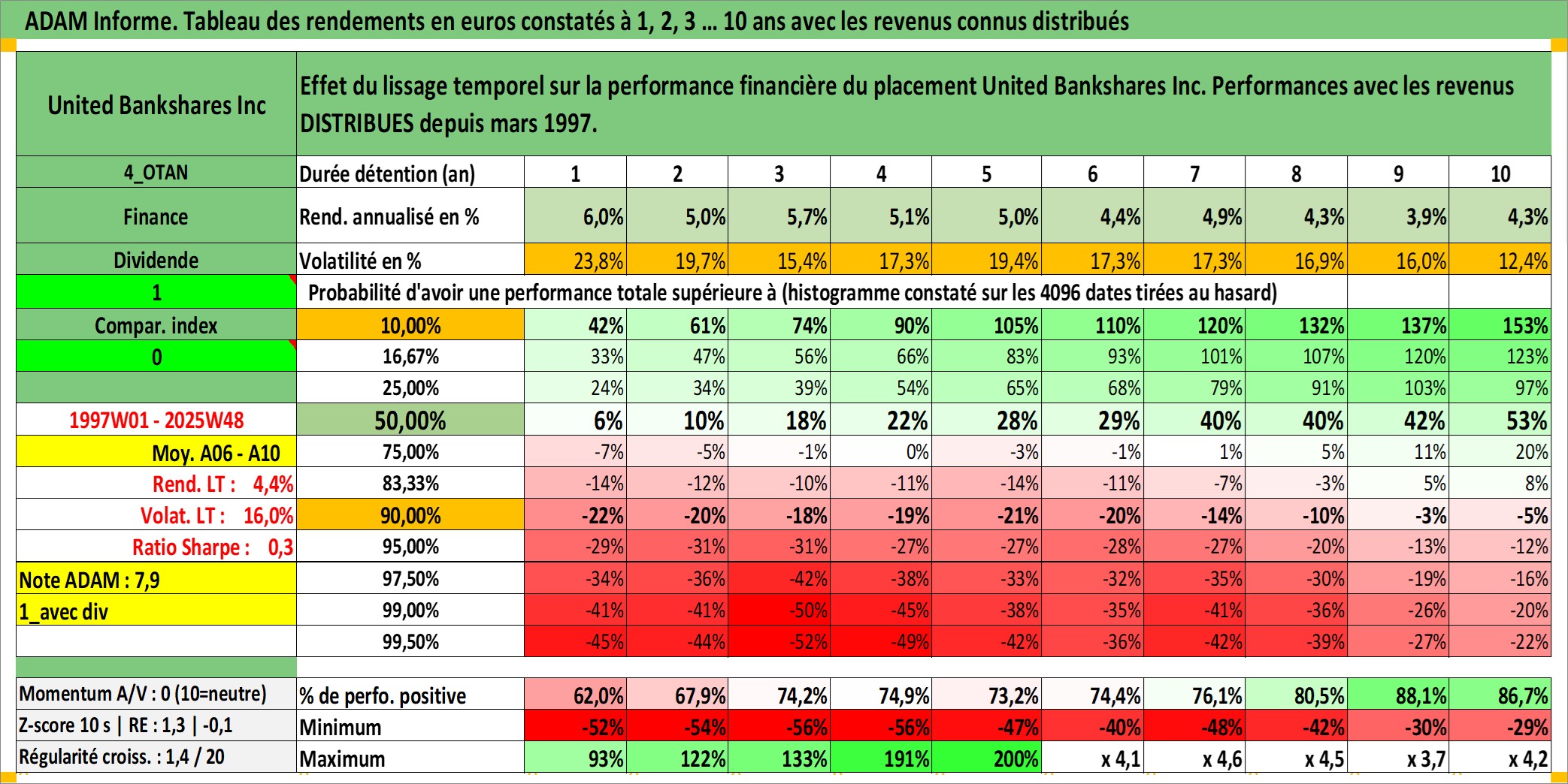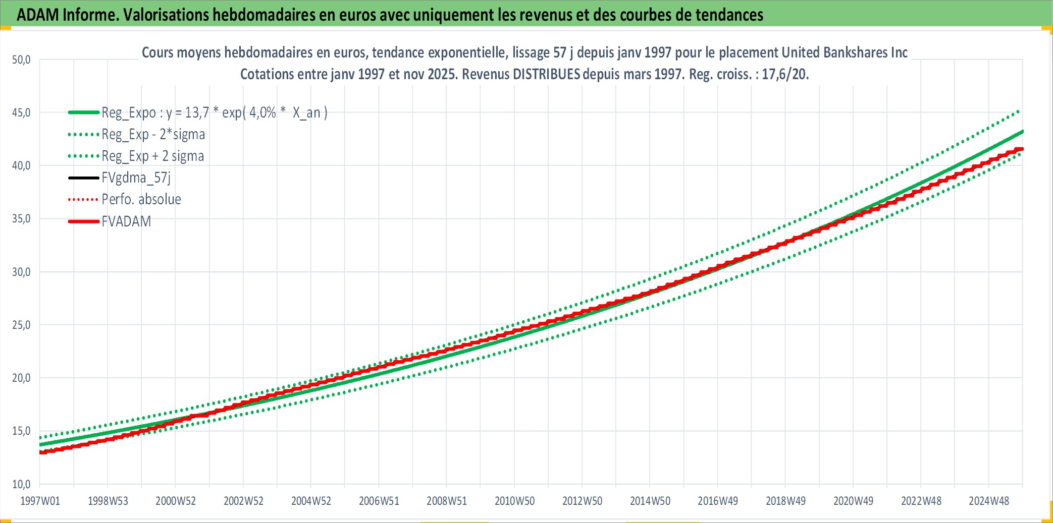 Site dédié aux investisseursPage dédiée sur site financeAnalyse des valorisations hebdomadaires de l'action United Bankshares Inc. Cet actif est cote en USD. Les valorisations sont en contrevaleur EURO et couvrent les semaines 1997W01 a 2025W48. Les revenus de cet actif financier sont pris en compte depuis la semaine 1997W11. La note ESG de cet actif n'est pas connue.