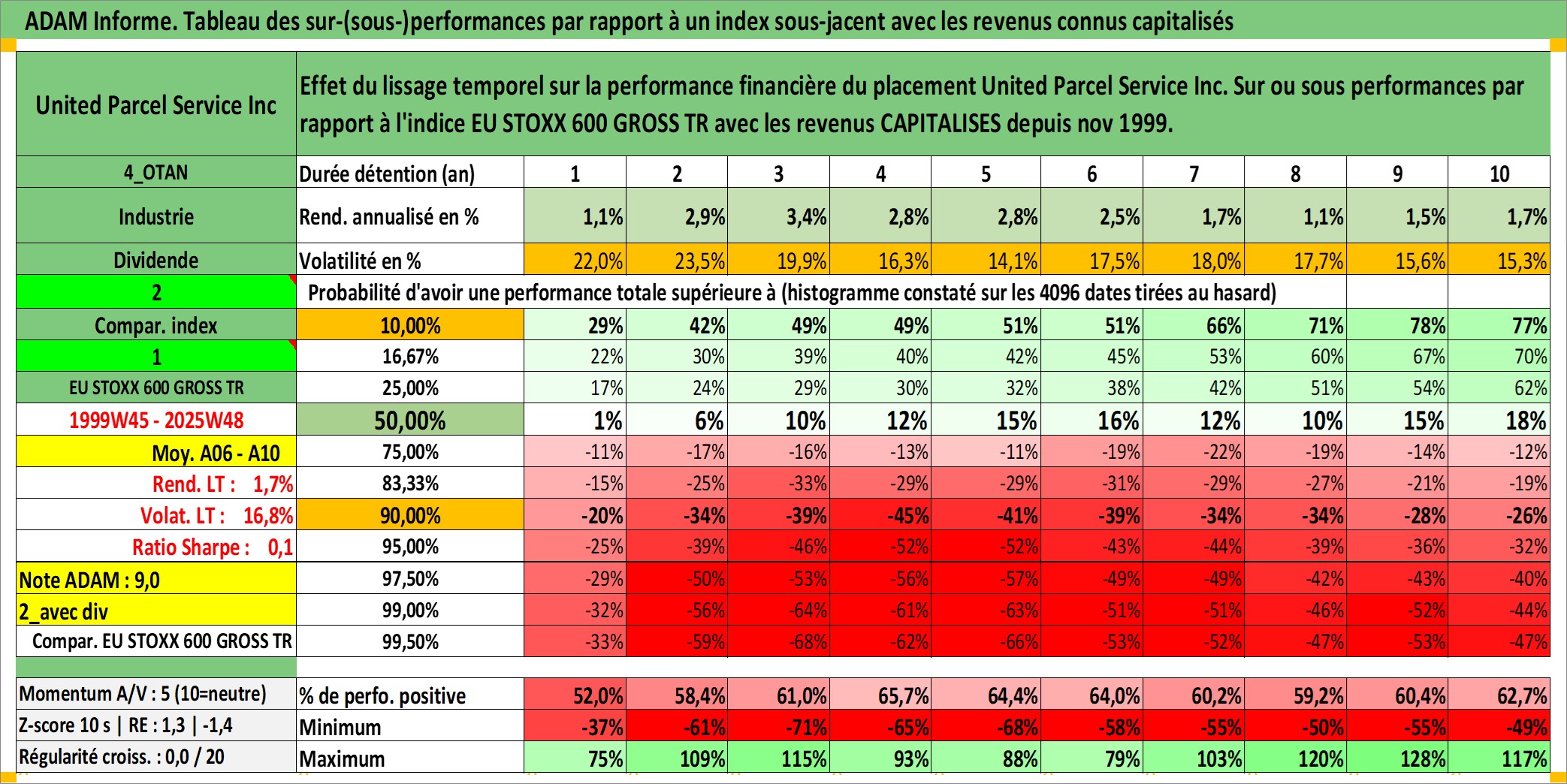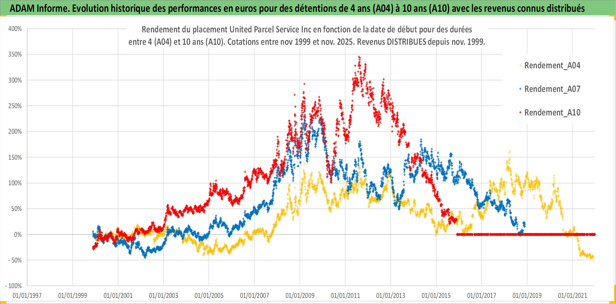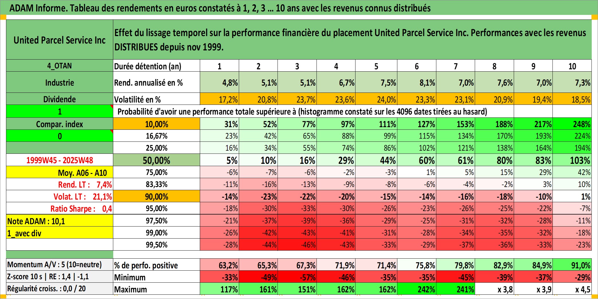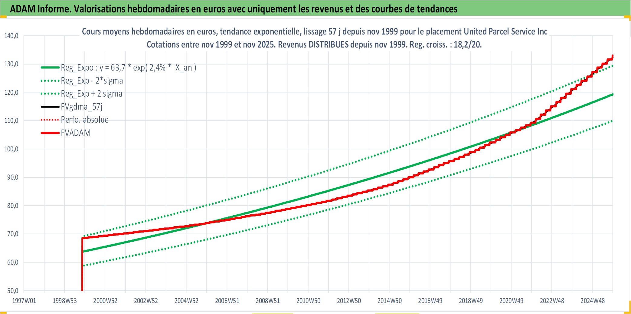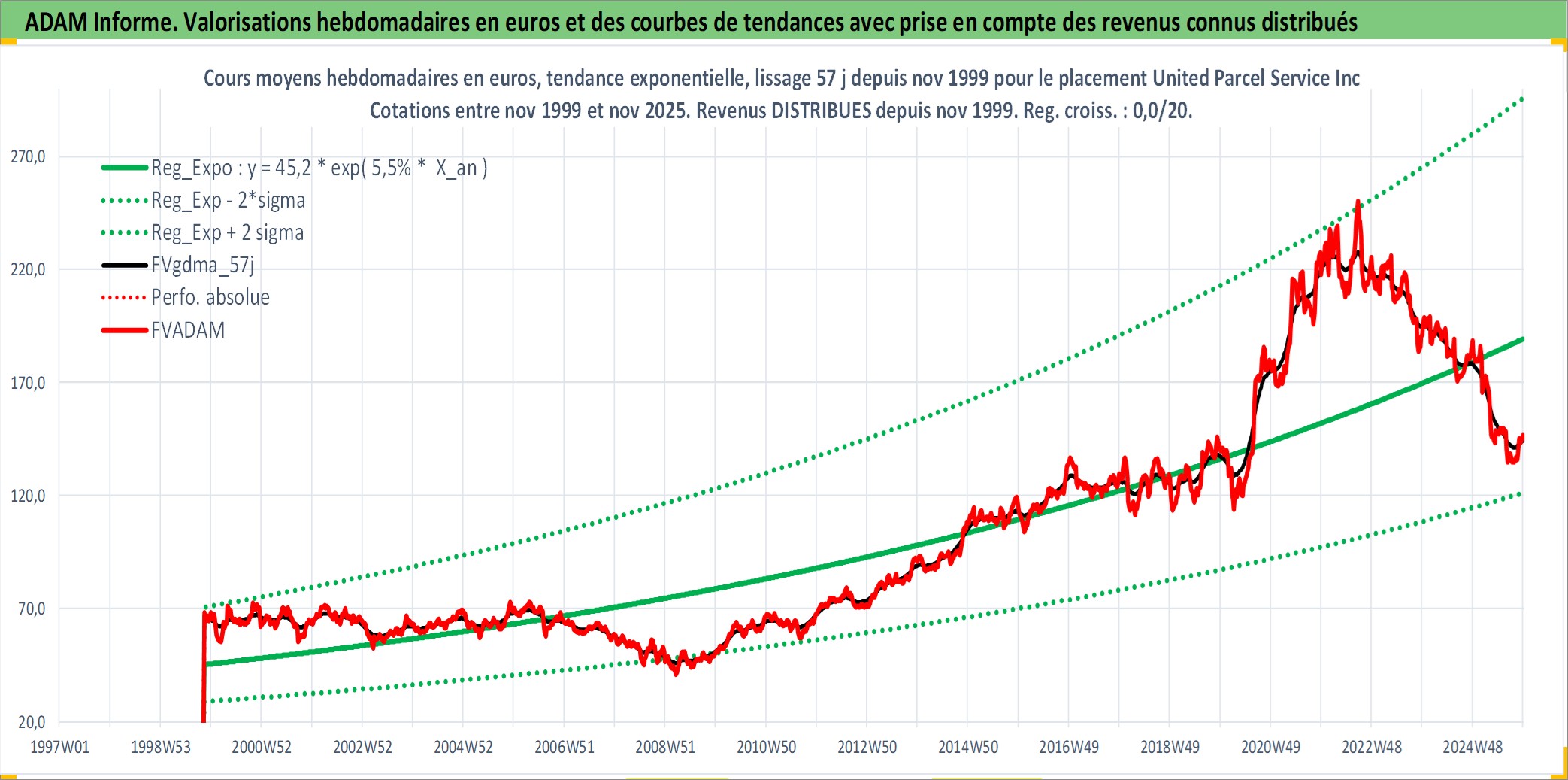 Site dédié aux investisseursPage dédiée sur site financeAnalyse des valorisations hebdomadaires de l'action United Parcel Service Inc. Cet actif est cote en USD. Les valorisations sont en contrevaleur EURO et couvrent les semaines 1999W45 a 2025W48. Les revenus de cet actif financier sont pris en compte depuis la semaine 1999W47. La note globale ESG de cet actif est estimee a 10.0 (apres rebasage entre 0 et 20).