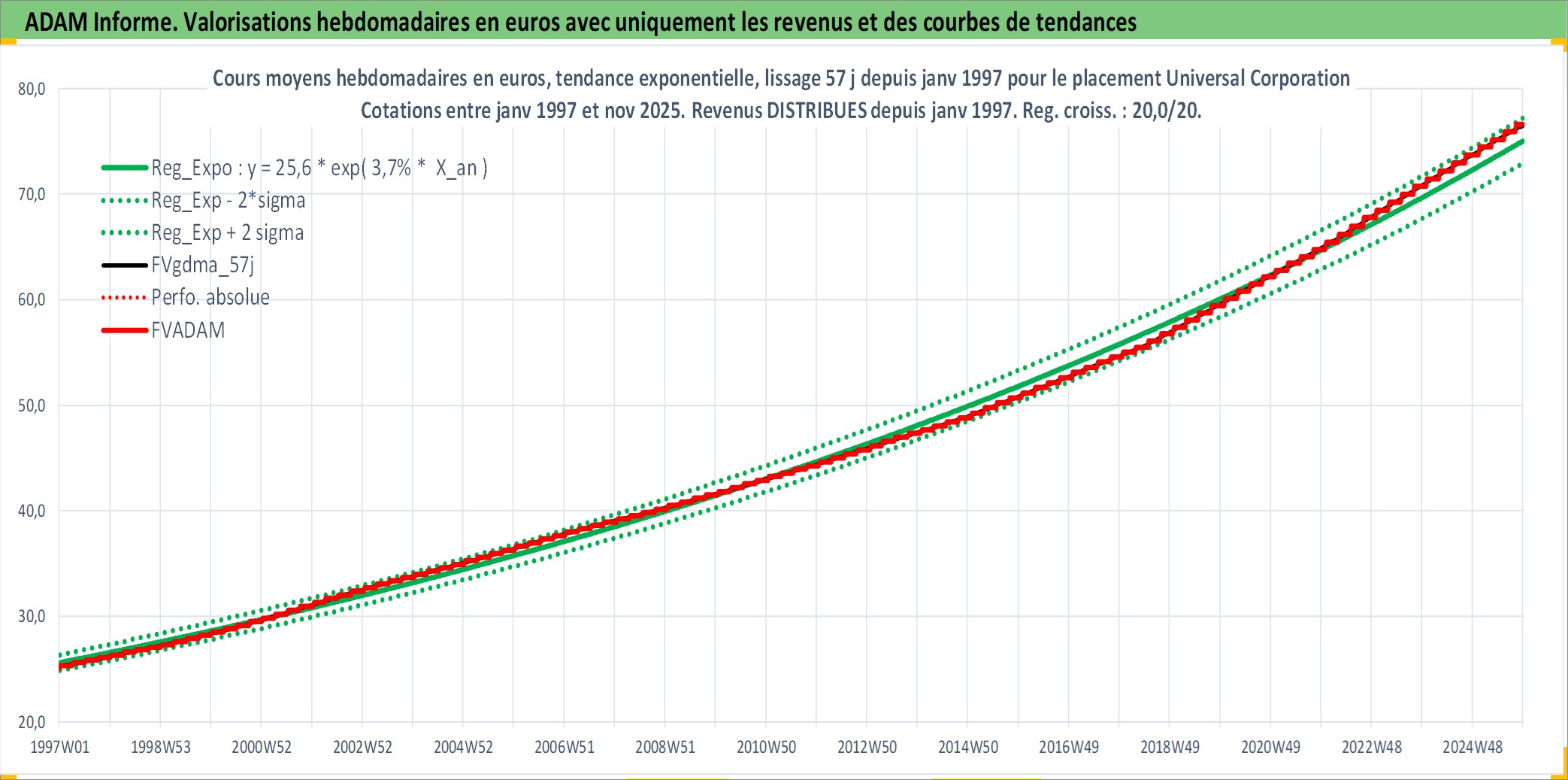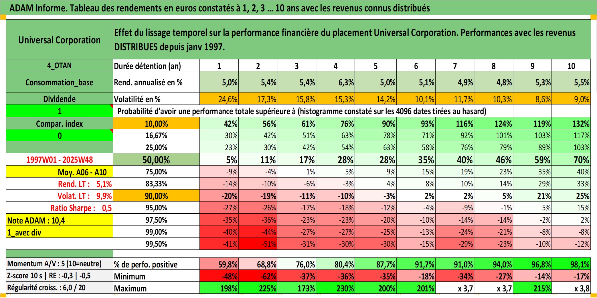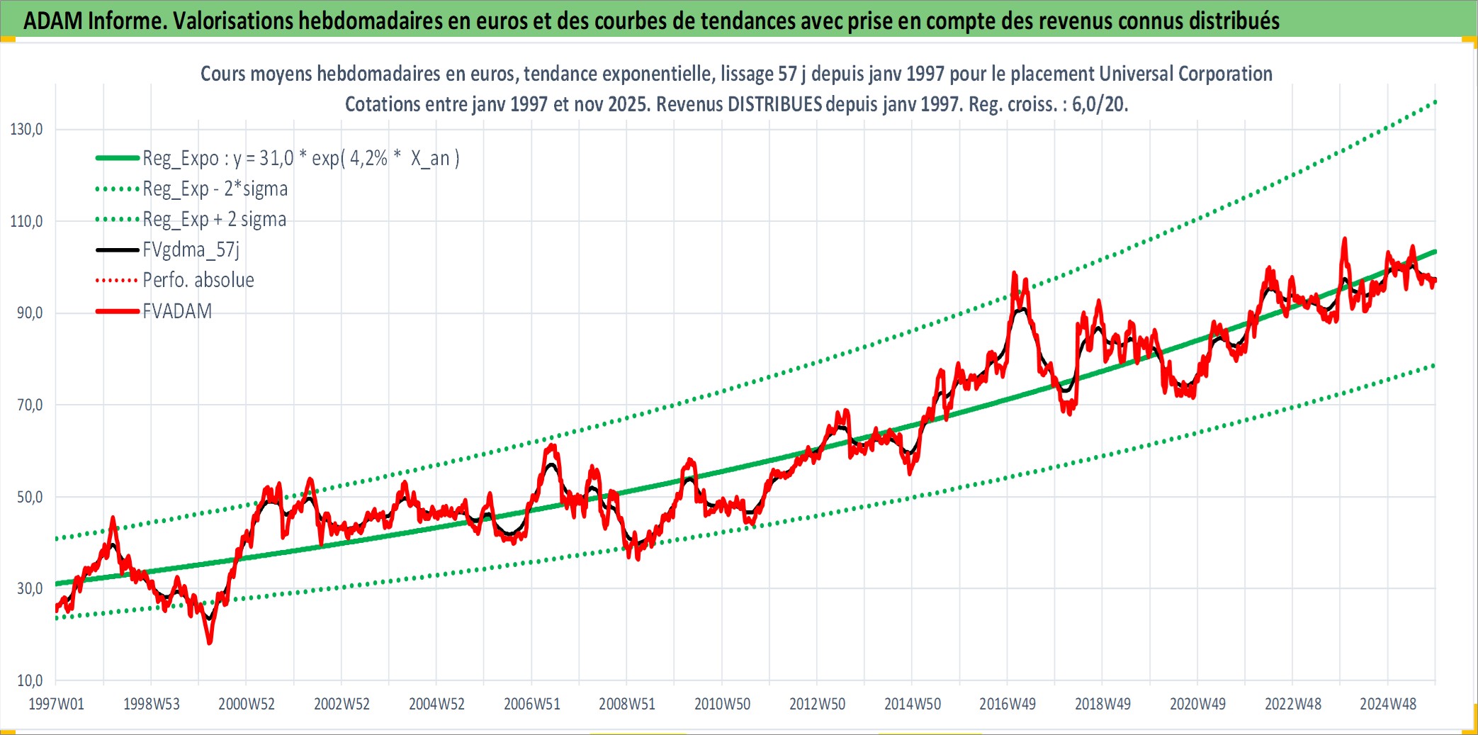 Site dédié aux investisseursPage dédiée sur site financeAnalyse des valorisations hebdomadaires de l'action Universal Corporation. Cet actif est cote en USD. Les valorisations sont en contrevaleur EURO et couvrent les semaines 1997W01 a 2025W48. Les revenus de cet actif financier sont pris en compte depuis la semaine 1997W02. La note ESG de cet actif n'est pas connue.