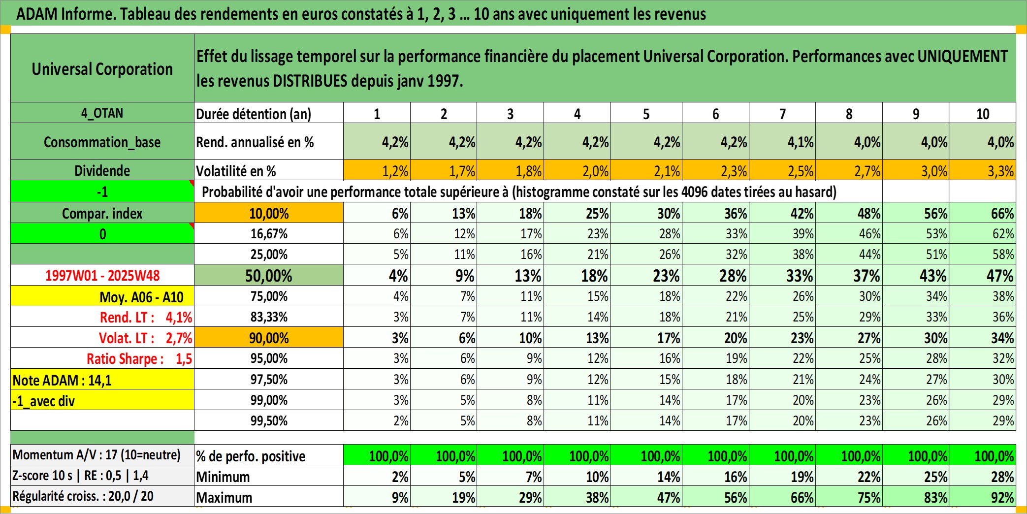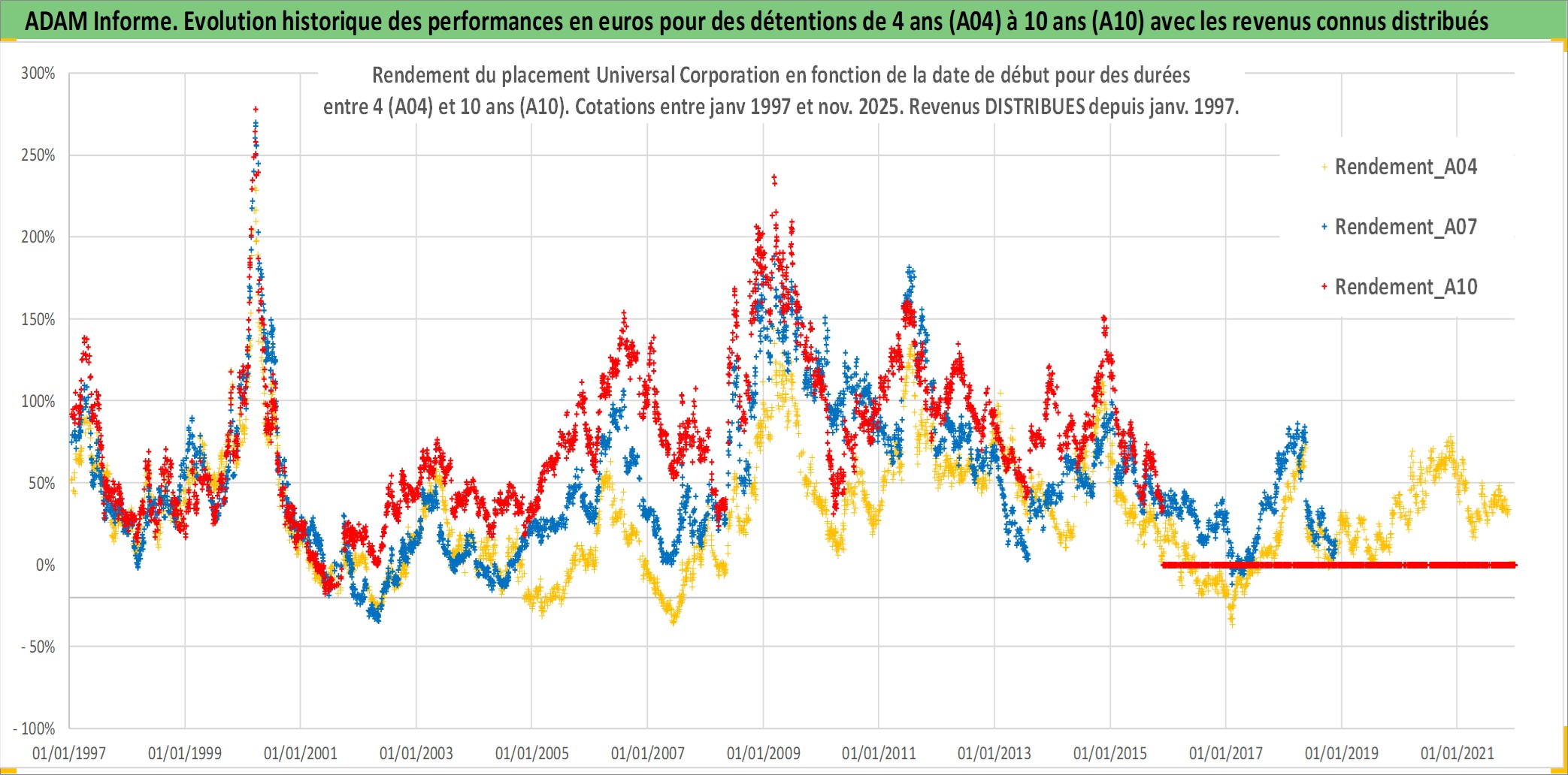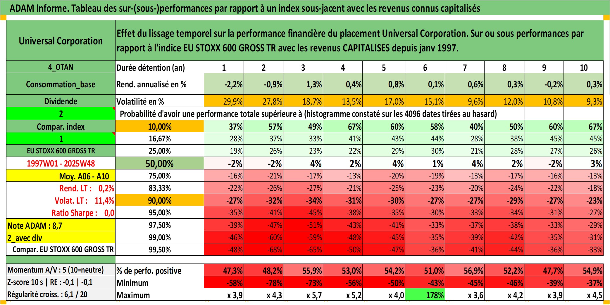 Site dédié aux investisseursPage dédiée sur site financeAnalyse des valorisations hebdomadaires de l'action Universal Corporation. Cet actif est cote en USD. Les valorisations sont en contrevaleur EURO et couvrent les semaines 1997W01 a 2025W48. Les revenus de cet actif financier sont pris en compte depuis la semaine 1997W02. La note ESG de cet actif n'est pas connue.