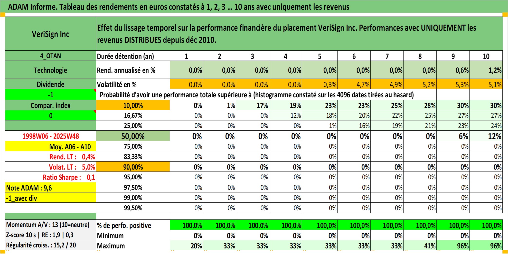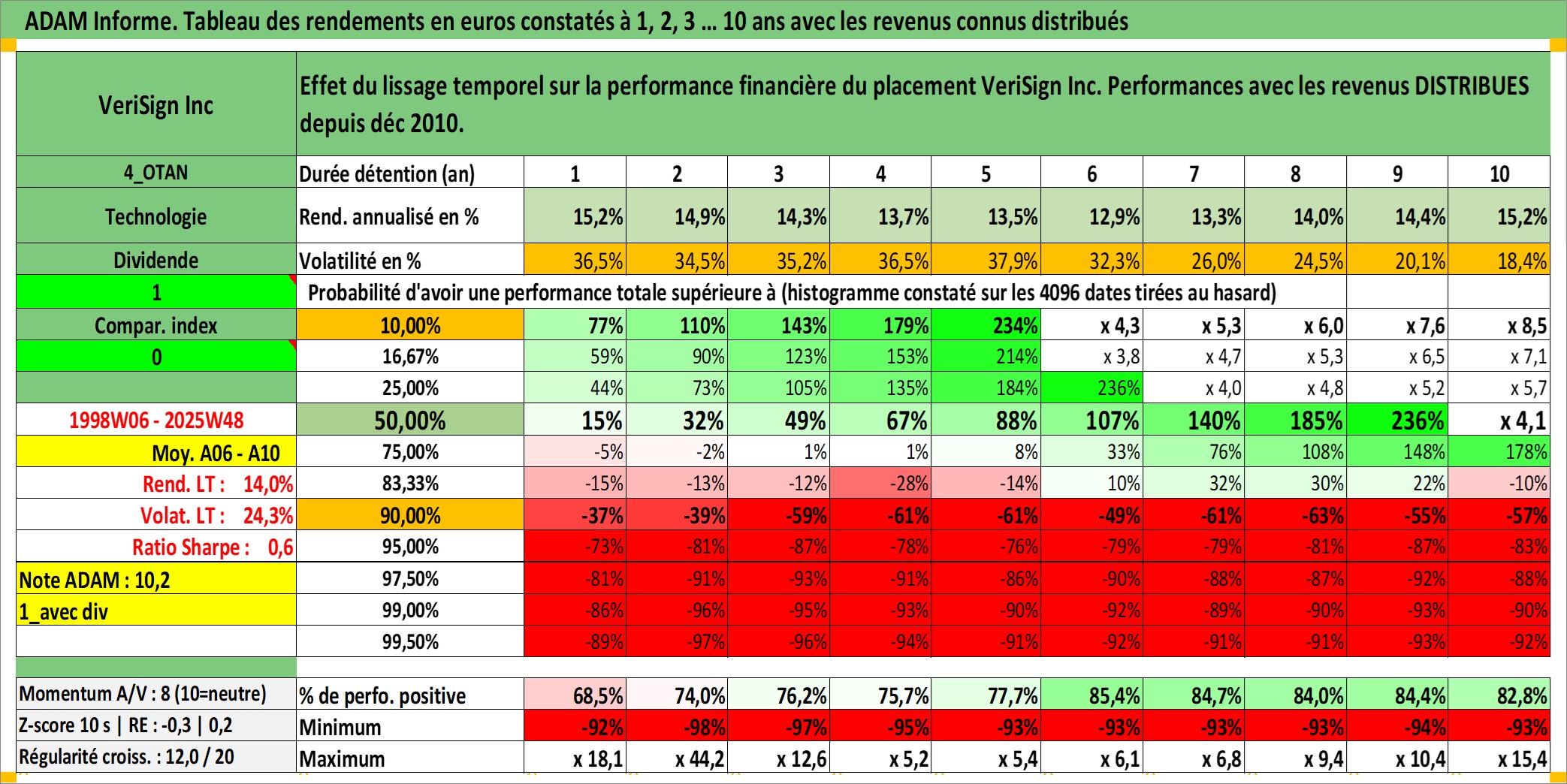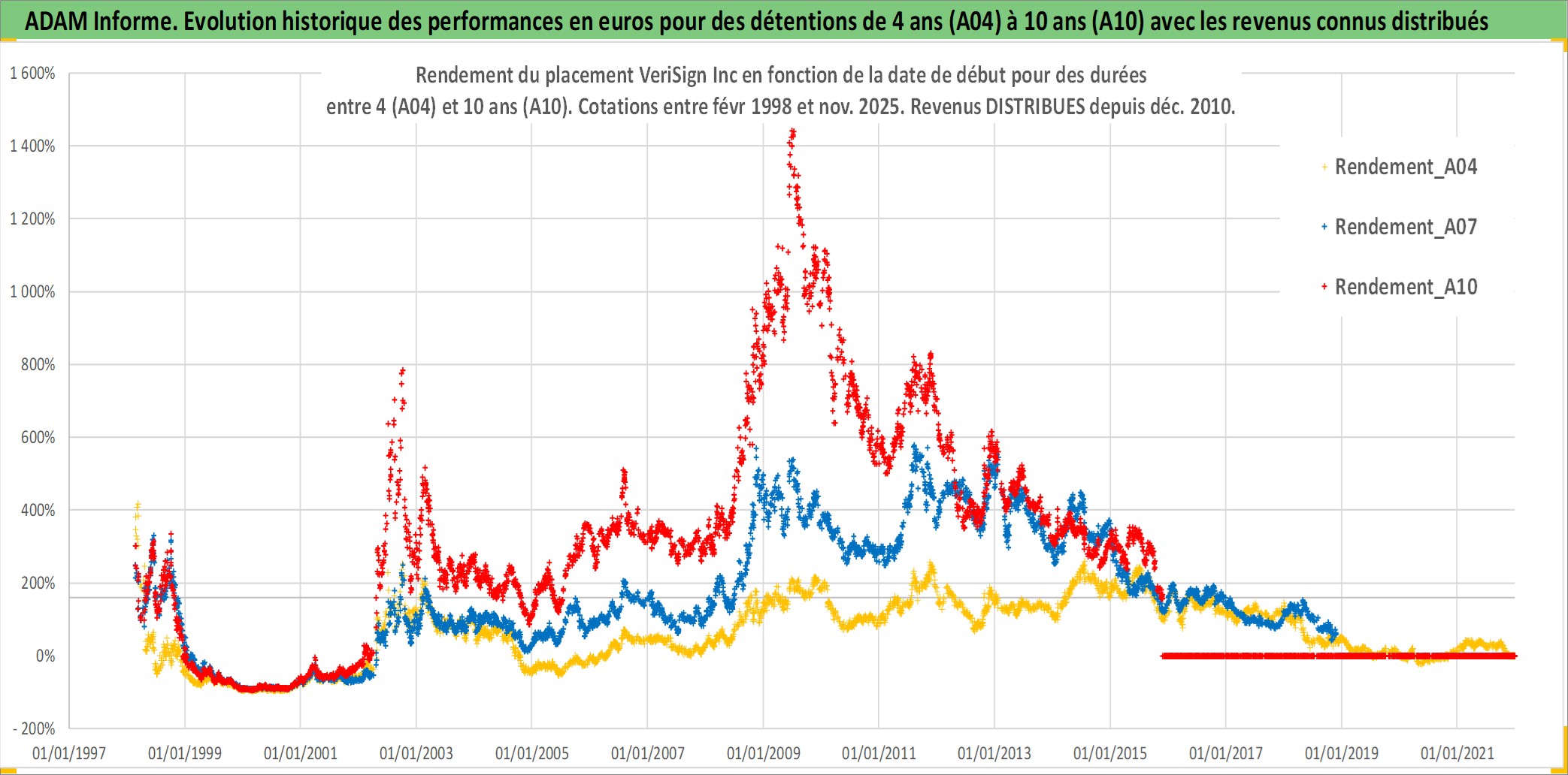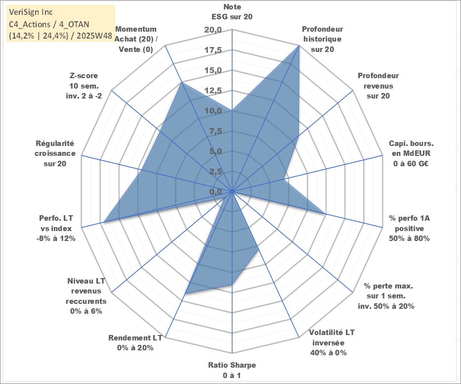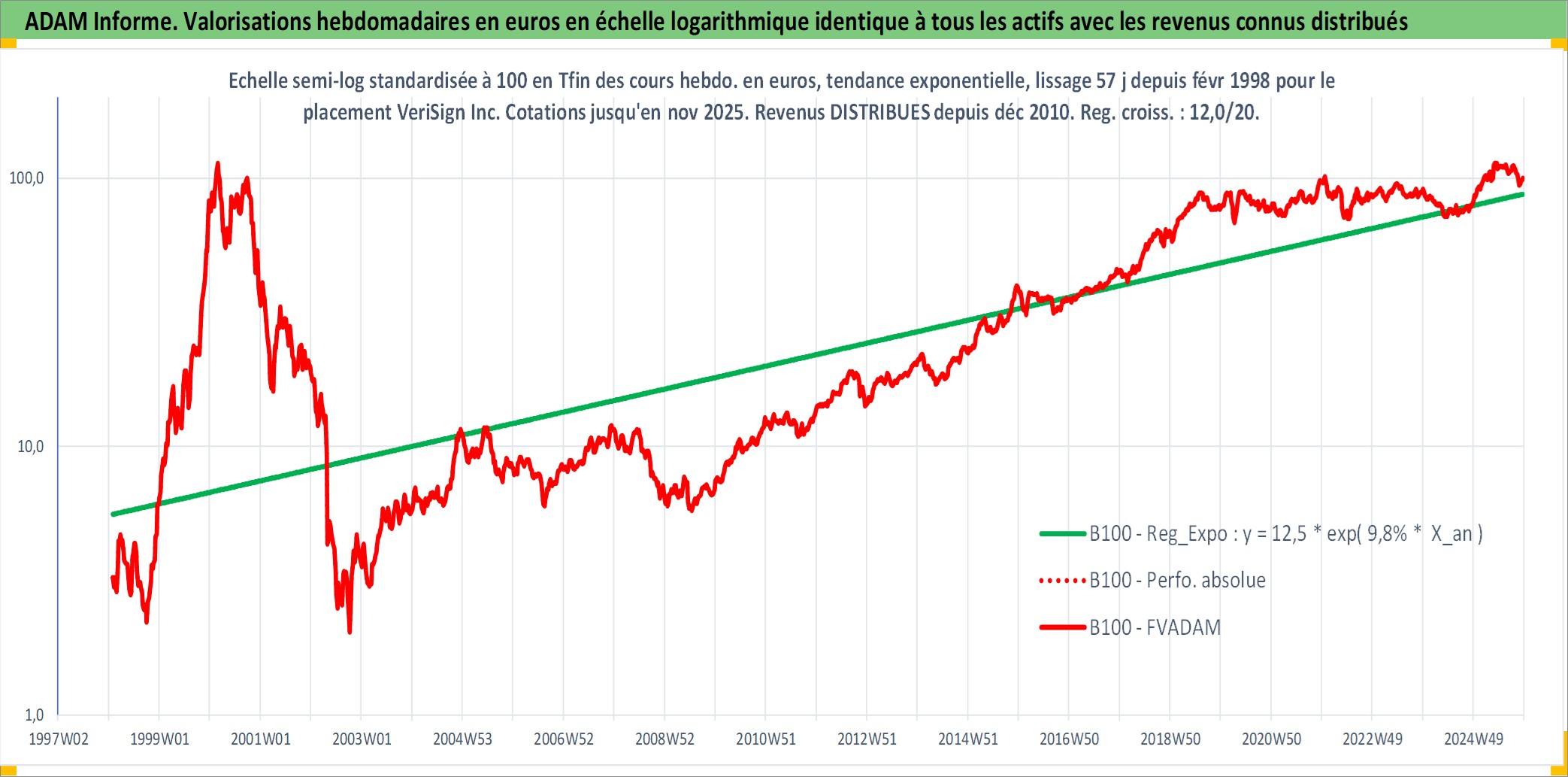 Site dédié aux investisseursPage dédiée sur site financeAnalyse des valorisations hebdomadaires de l'action VeriSign Inc. Cet actif est cote en USD. Les valorisations sont en contrevaleur EURO et couvrent les semaines 1998W06 a 2025W48. Les revenus de cet actif financier sont pris en compte depuis la semaine 2010W50. La note globale ESG de cet actif est estimee a 10.0 (apres rebasage entre 0 et 20).