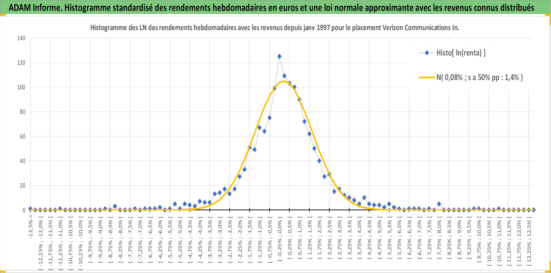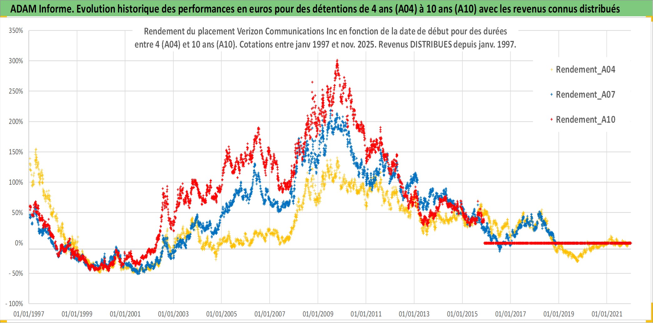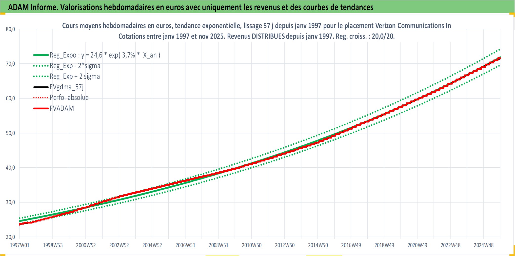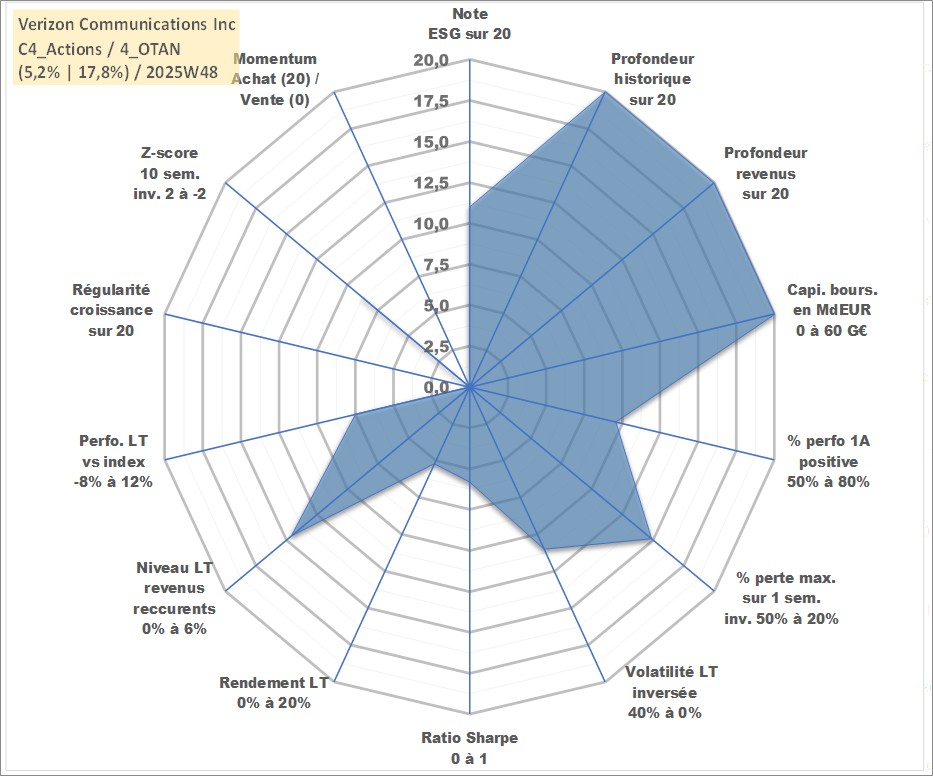 Site dédié aux investisseursPage dédiée sur site financeAnalyse des valorisations hebdomadaires de l'action Verizon Communications Inc. Cet actif est cote en USD. Les valorisations sont en contrevaleur EURO et couvrent les semaines 1997W01 a 2025W48. Les revenus de cet actif financier sont pris en compte depuis la semaine 1997W02. La note globale ESG de cet actif est estimee a 11.0 (apres rebasage entre 0 et 20).