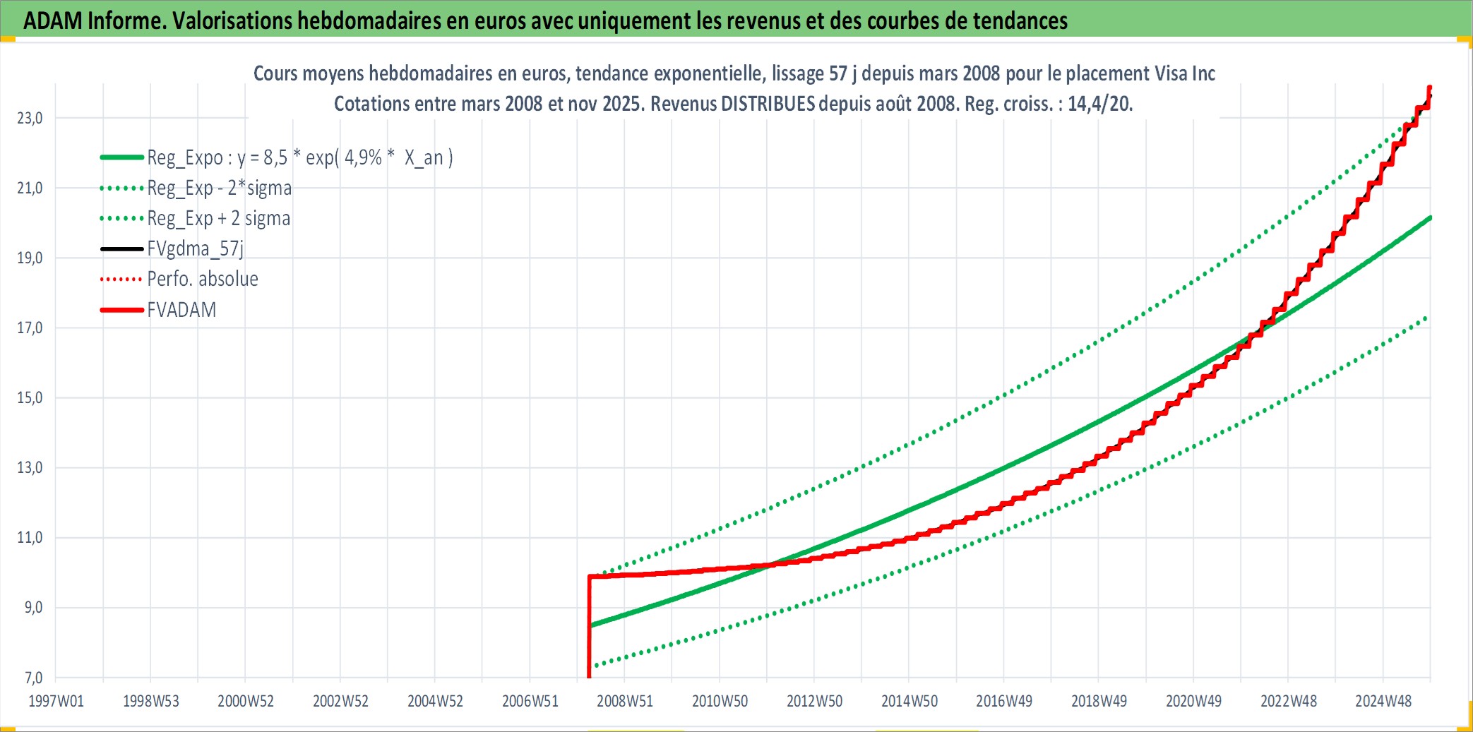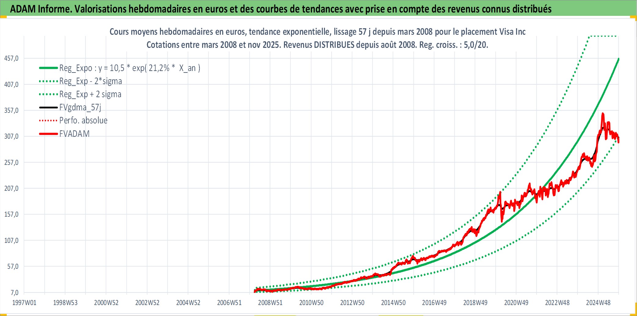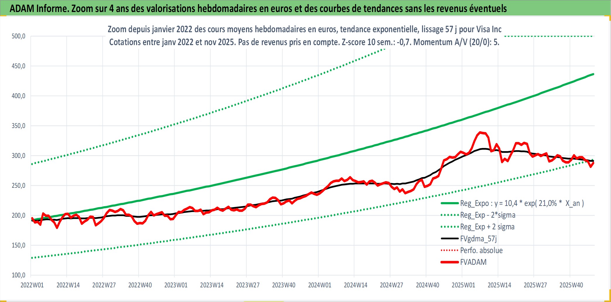 Site dédié aux investisseursPage dédiée sur site financeAnalyse des valorisations hebdomadaires de l'action Visa Inc. Cet actif est cote en USD. Les valorisations sont en contrevaleur EURO et couvrent les semaines 2008W12 a 2025W48. Les revenus de cet actif financier sont pris en compte depuis la semaine 2008W33. La note globale ESG de cet actif est estimee a 13.0 (apres rebasage entre 0 et 20).