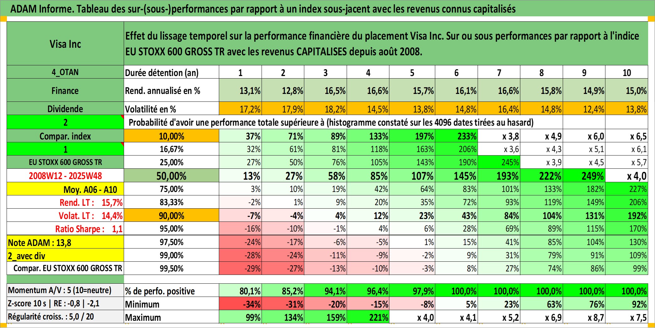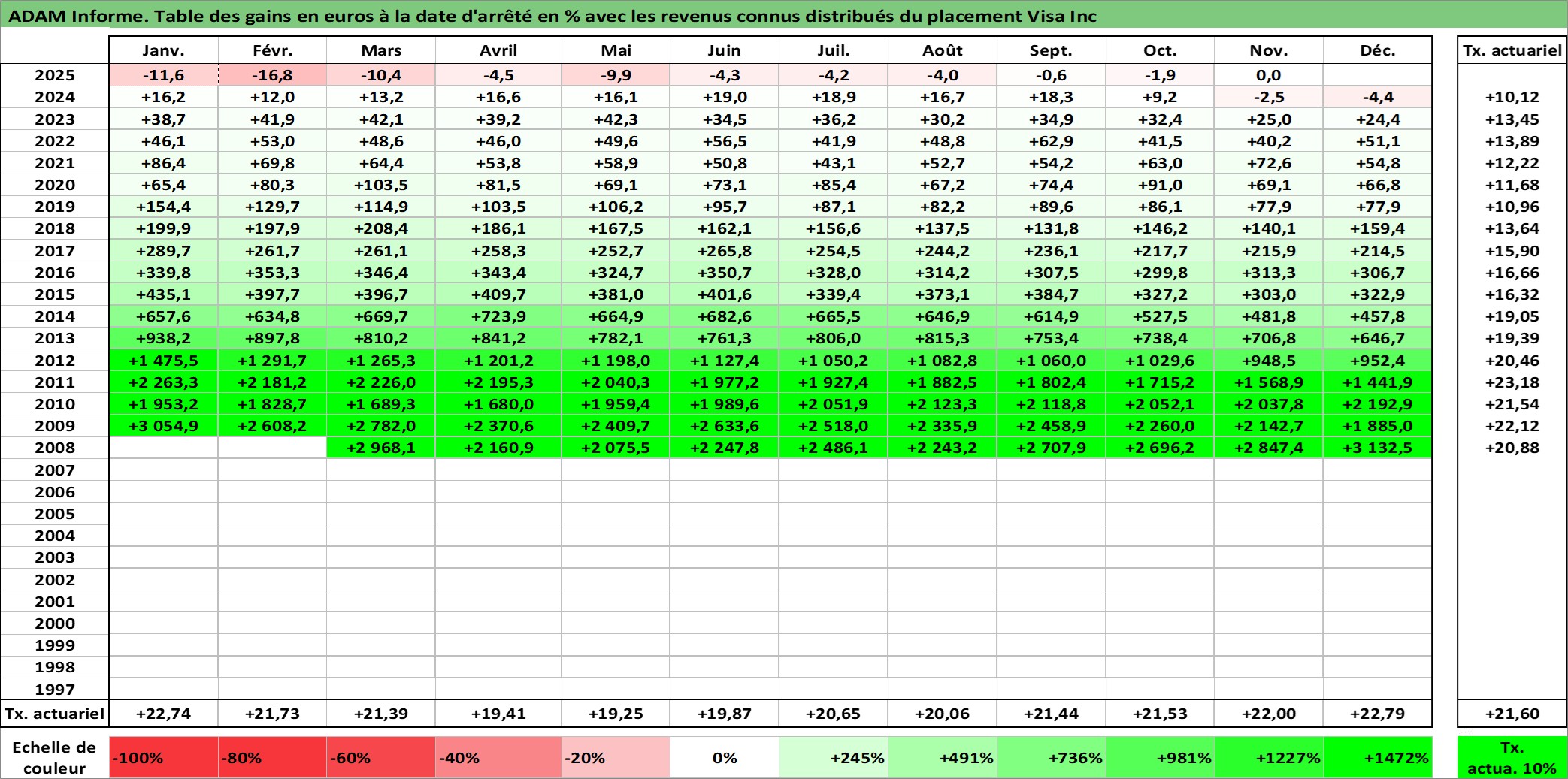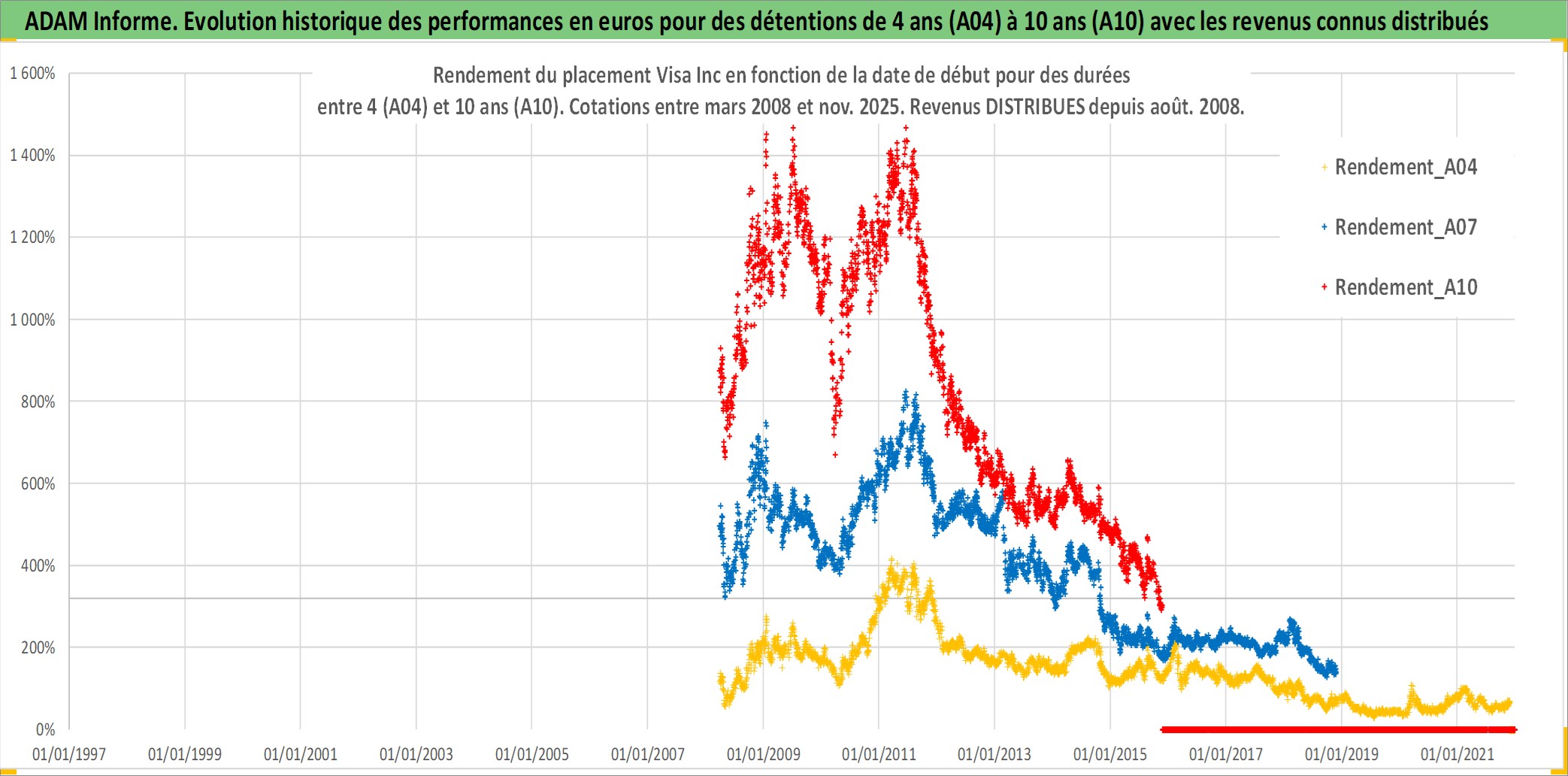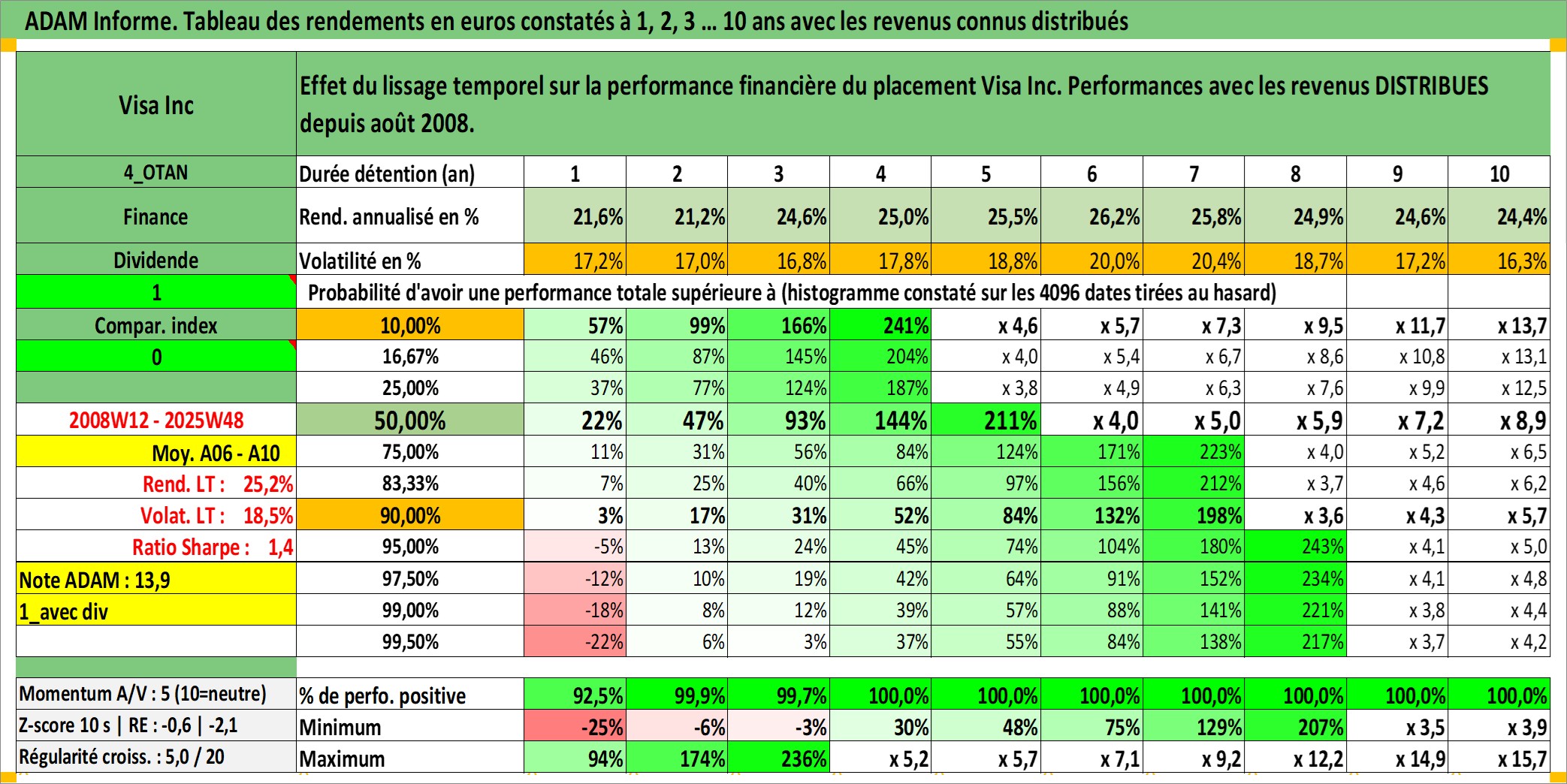 Site dédié aux investisseursPage dédiée sur site financeAnalyse des valorisations hebdomadaires de l'action Visa Inc. Cet actif est cote en USD. Les valorisations sont en contrevaleur EURO et couvrent les semaines 2008W12 a 2025W48. Les revenus de cet actif financier sont pris en compte depuis la semaine 2008W33. La note globale ESG de cet actif est estimee a 13.0 (apres rebasage entre 0 et 20).