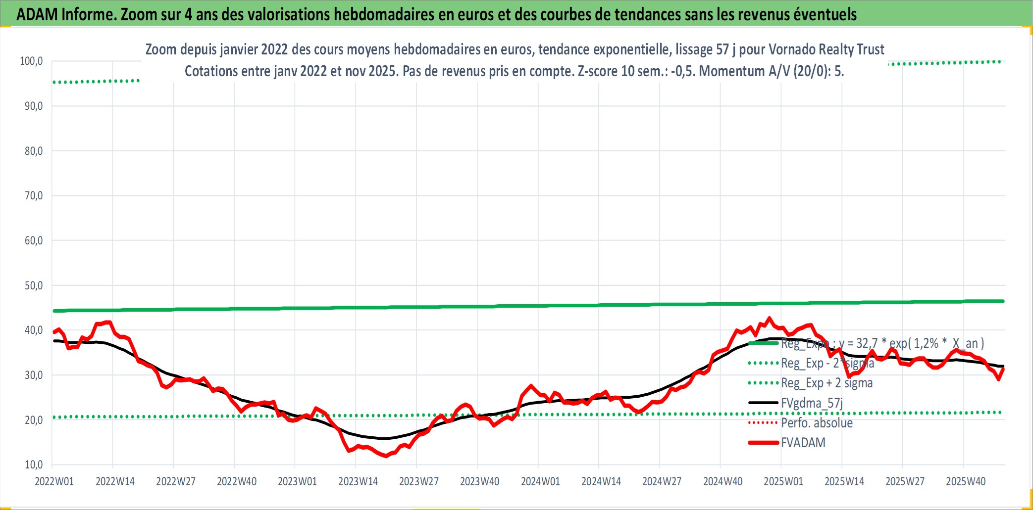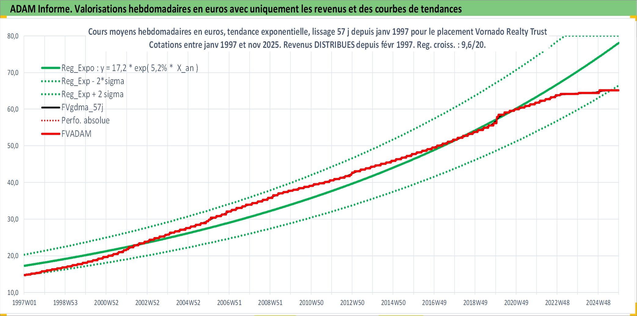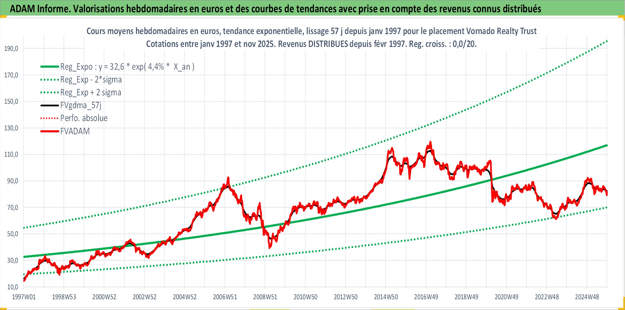 Site dédié aux investisseursPage dédiée sur site financeAnalyse des valorisations hebdomadaires de l'action Vornado Realty Trust. Cet actif est cote en USD. Les valorisations sont en contrevaleur EURO et couvrent les semaines 1997W01 a 2025W48. Les revenus de cet actif financier sont pris en compte depuis la semaine 1997W06. La note globale ESG de cet actif est estimee a 14.0 (apres rebasage entre 0 et 20).