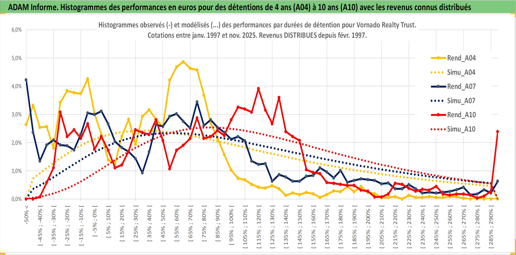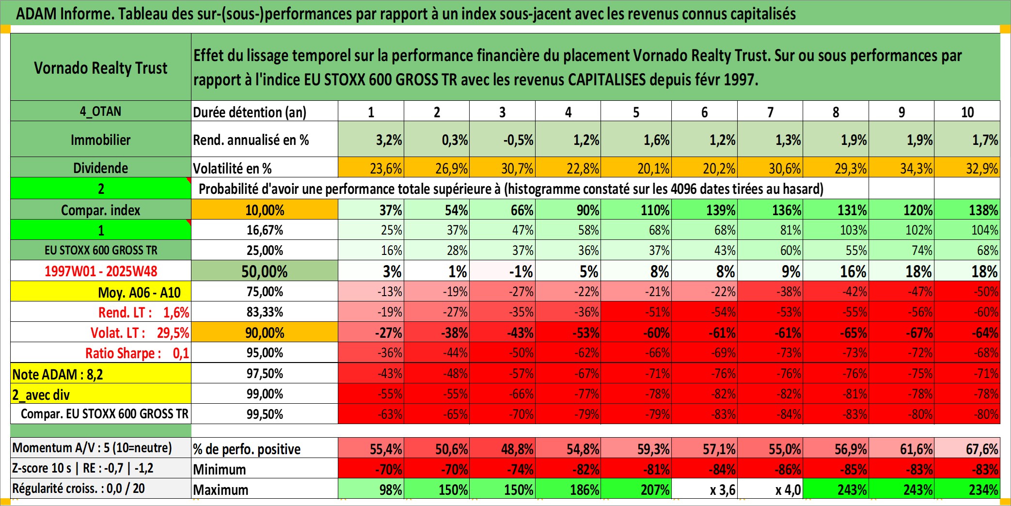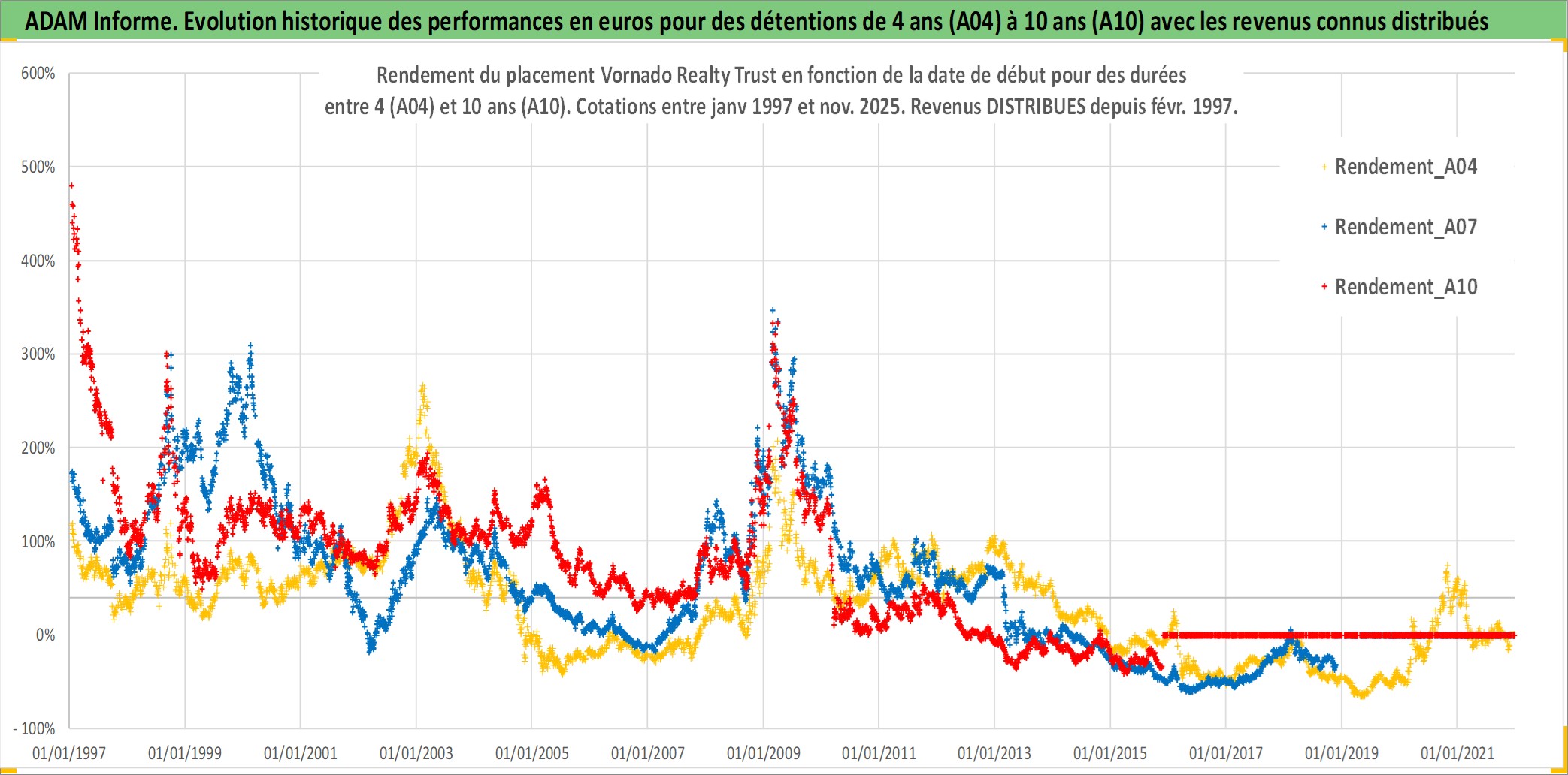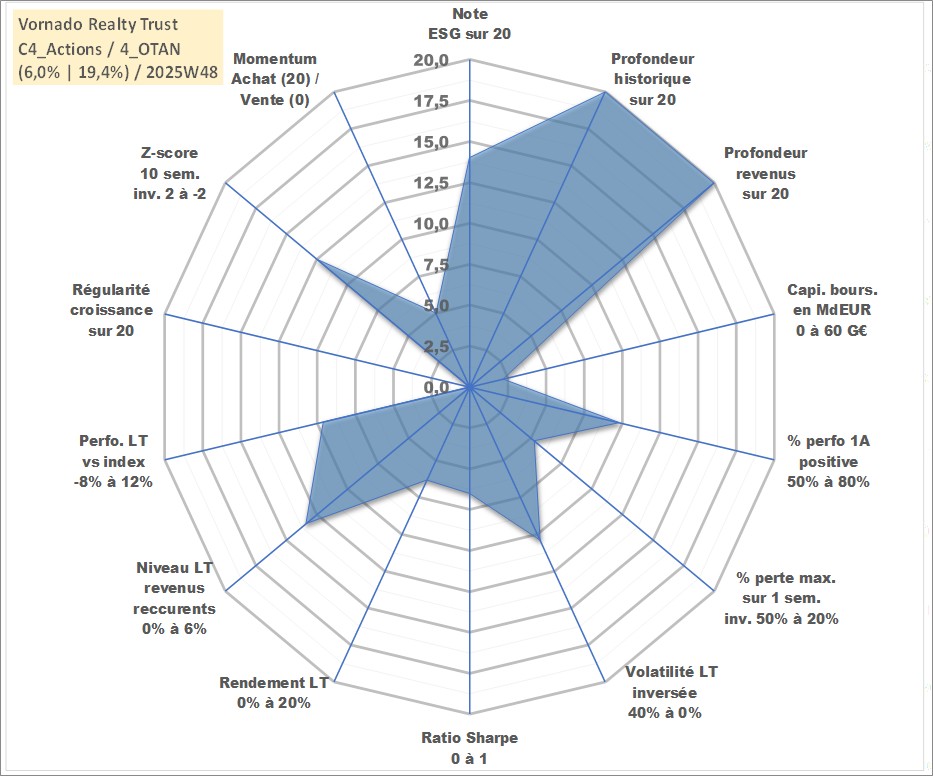 Site dédié aux investisseursPage dédiée sur site financeAnalyse des valorisations hebdomadaires de l'action Vornado Realty Trust. Cet actif est cote en USD. Les valorisations sont en contrevaleur EURO et couvrent les semaines 1997W01 a 2025W48. Les revenus de cet actif financier sont pris en compte depuis la semaine 1997W06. La note globale ESG de cet actif est estimee a 14.0 (apres rebasage entre 0 et 20).