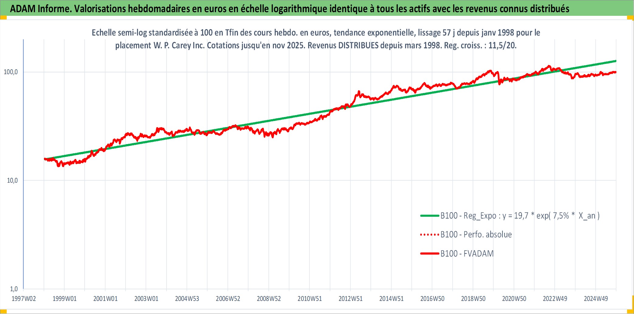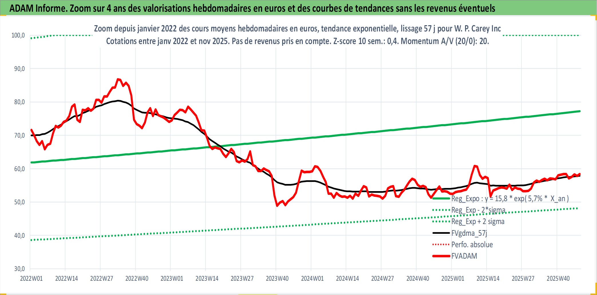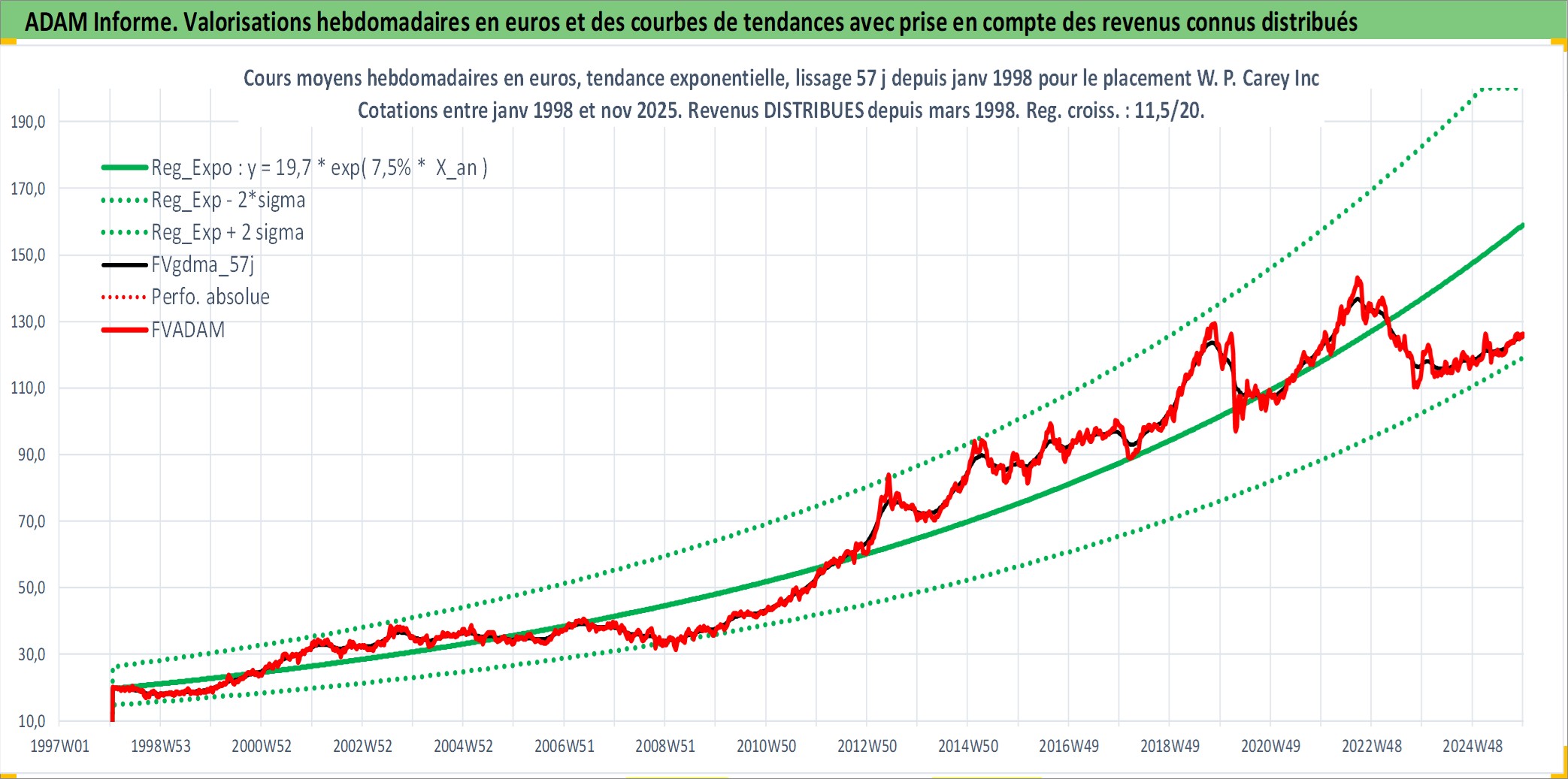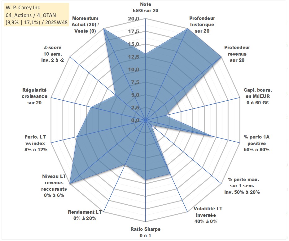 Site dédié aux investisseursPage dédiée sur site financeAnalyse des valorisations hebdomadaires de l'action W. P. Carey Inc. Cet actif est cote en USD. Les valorisations sont en contrevaleur EURO et couvrent les semaines 1998W04 a 2025W48. Les revenus de cet actif financier sont pris en compte depuis la semaine 1998W13. La note globale ESG de cet actif est estimee a 13.0 (apres rebasage entre 0 et 20).