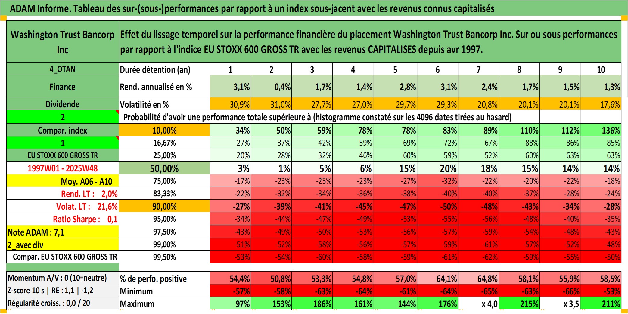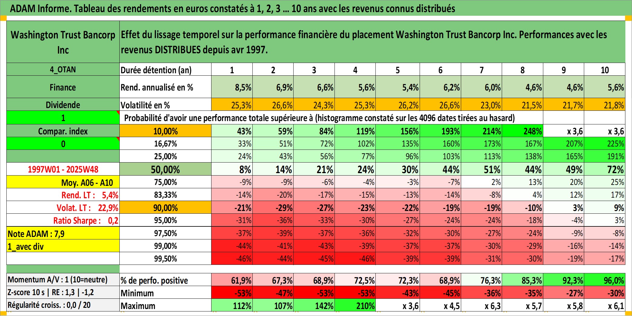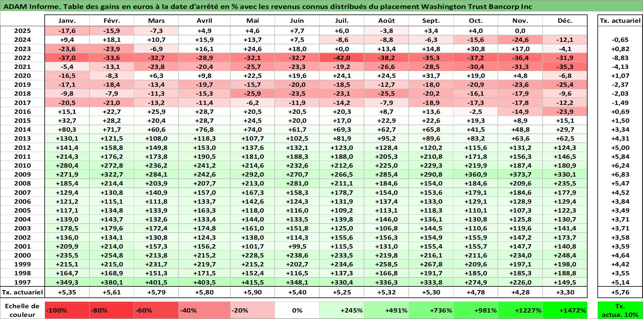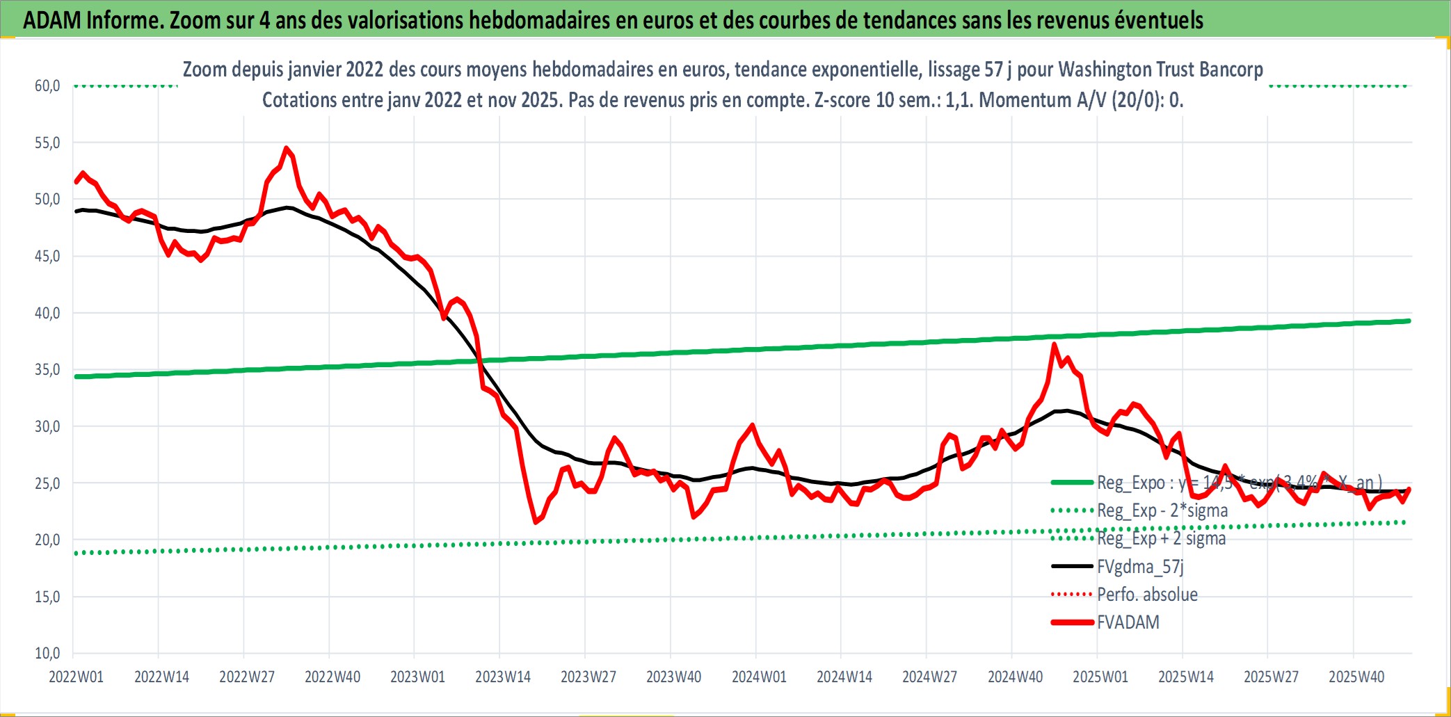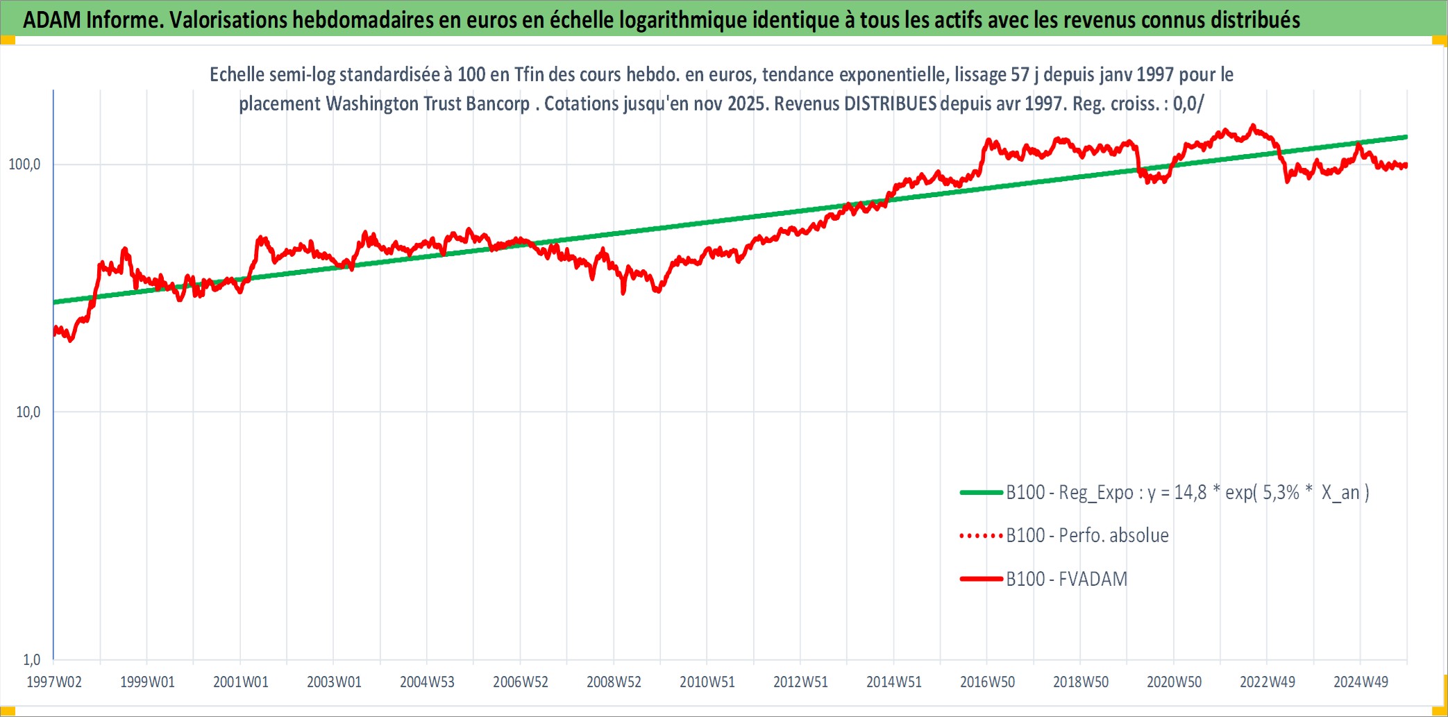 Site dédié aux investisseursPage dédiée sur site financeAnalyse des valorisations hebdomadaires de l'action Washington Trust Bancorp Inc. Cet actif est cote en USD. Les valorisations sont en contrevaleur EURO et couvrent les semaines 1997W01 a 2025W48. Les revenus de cet actif financier sont pris en compte depuis la semaine 1997W14. La note ESG de cet actif n'est pas connue.