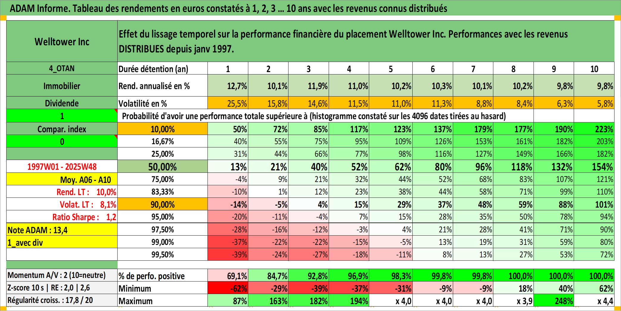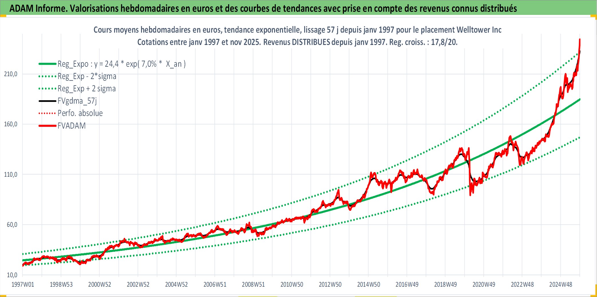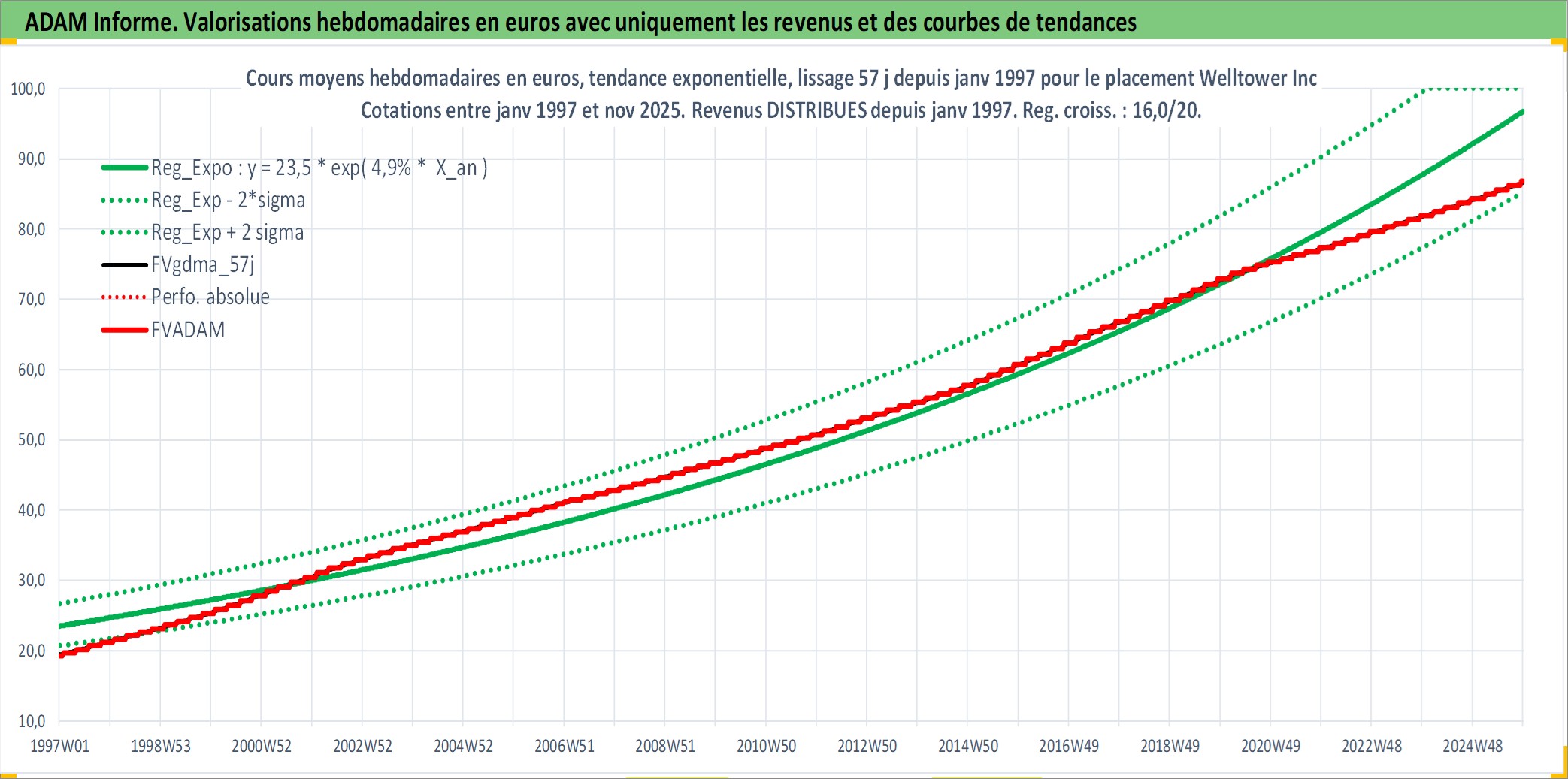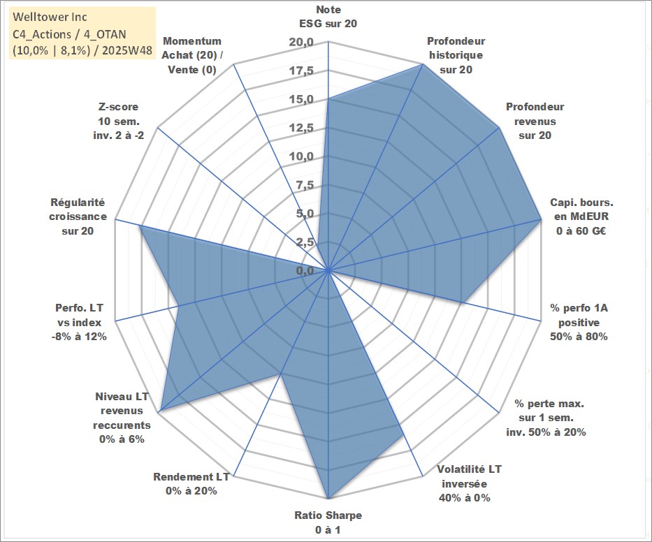 Site dédié aux investisseursPage dédiée sur site financeAnalyse des valorisations hebdomadaires de l'action Welltower Inc. Cet actif est cote en USD. Les valorisations sont en contrevaleur EURO et couvrent les semaines 1997W01 a 2025W48. Les revenus de cet actif financier sont pris en compte depuis la semaine 1997W05. La note globale ESG de cet actif est estimee a 15.0 (apres rebasage entre 0 et 20).
