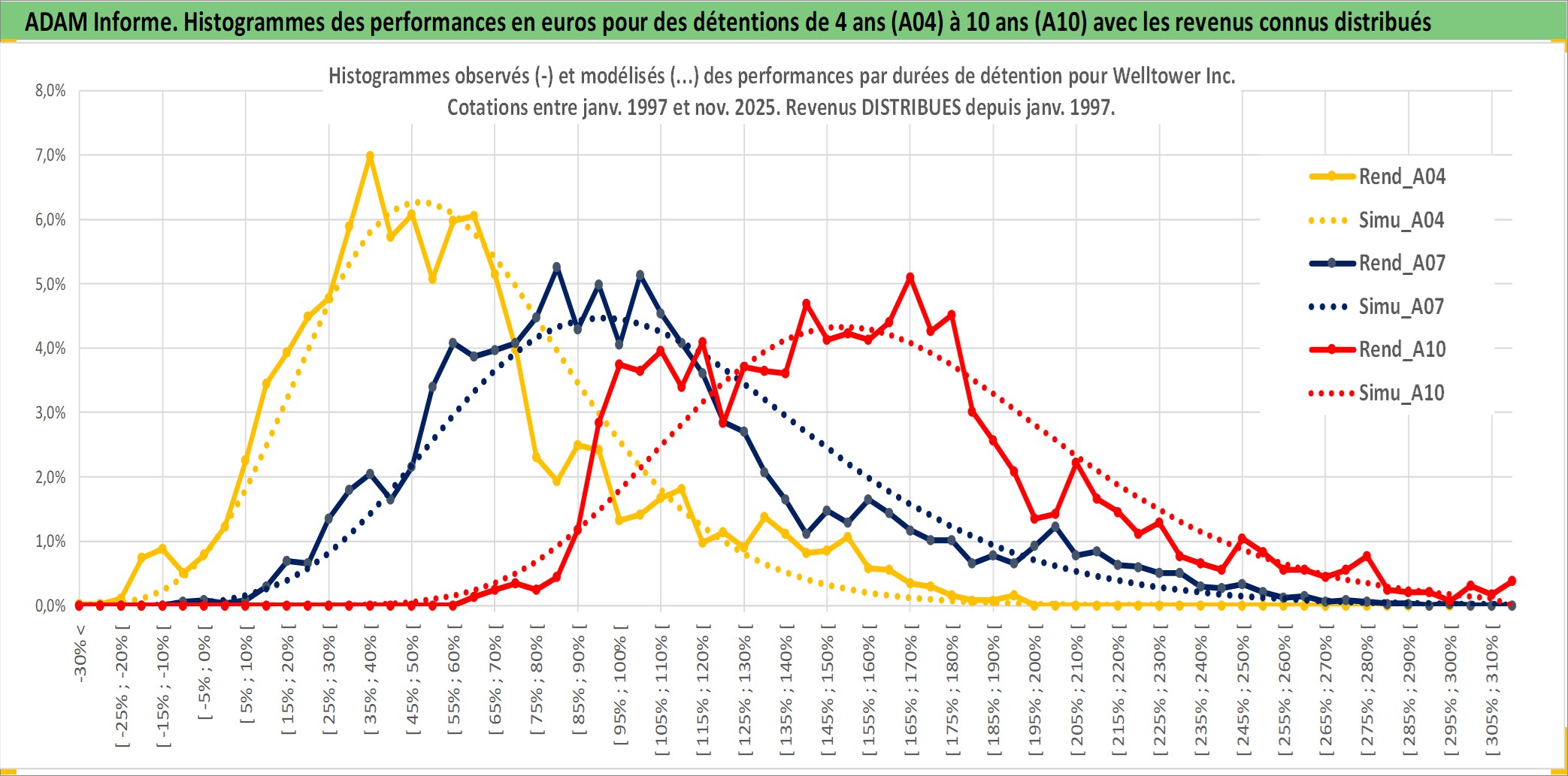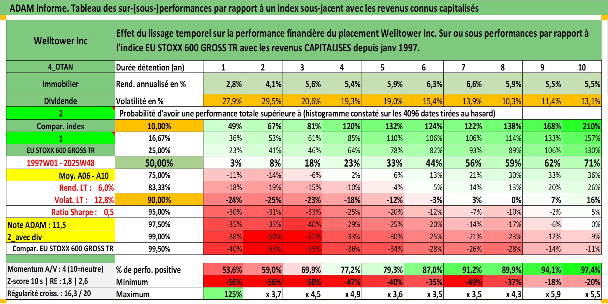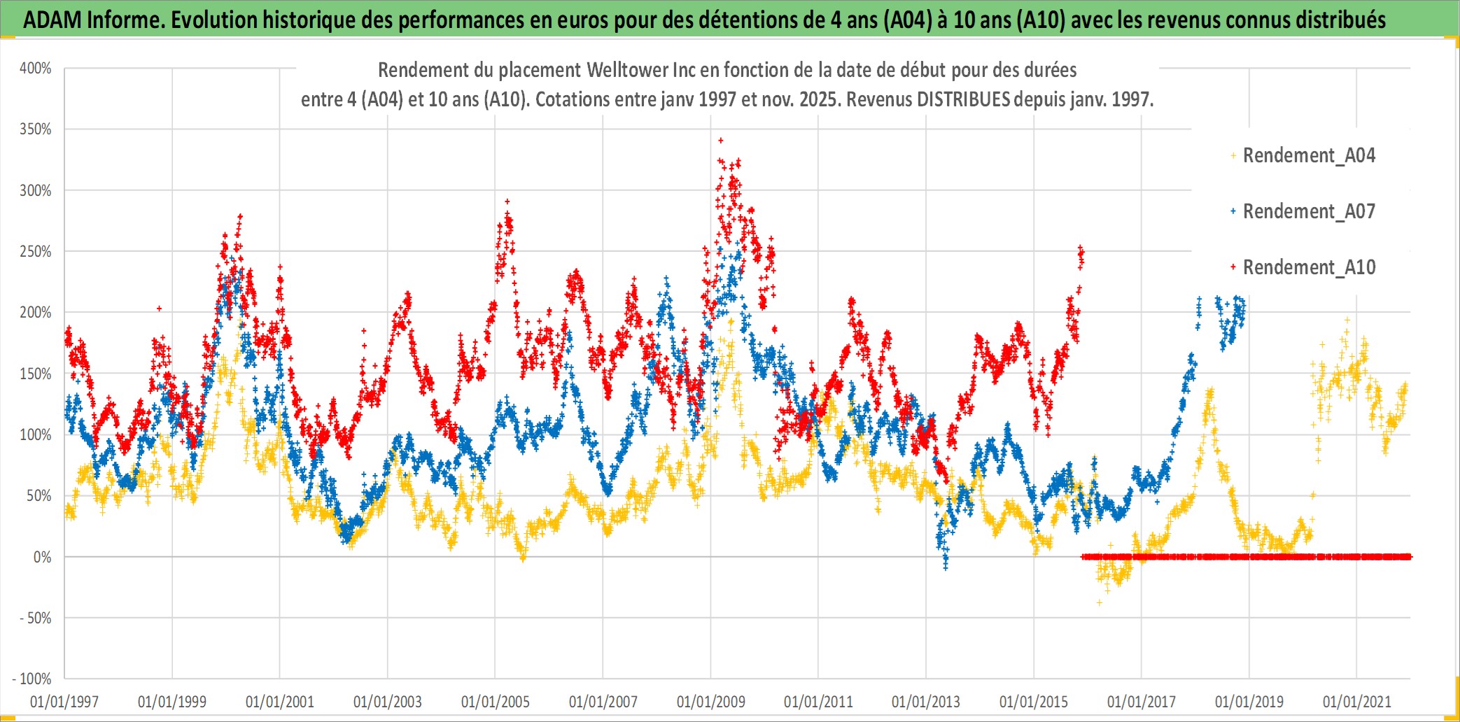 Site dédié aux investisseursPage dédiée sur site financeAnalyse des valorisations hebdomadaires de l'action Welltower Inc. Cet actif est cote en USD. Les valorisations sont en contrevaleur EURO et couvrent les semaines 1997W01 a 2025W48. Les revenus de cet actif financier sont pris en compte depuis la semaine 1997W05. La note globale ESG de cet actif est estimee a 15.0 (apres rebasage entre 0 et 20).