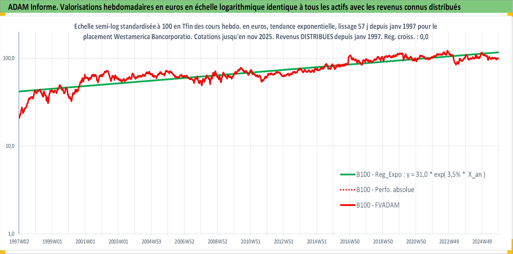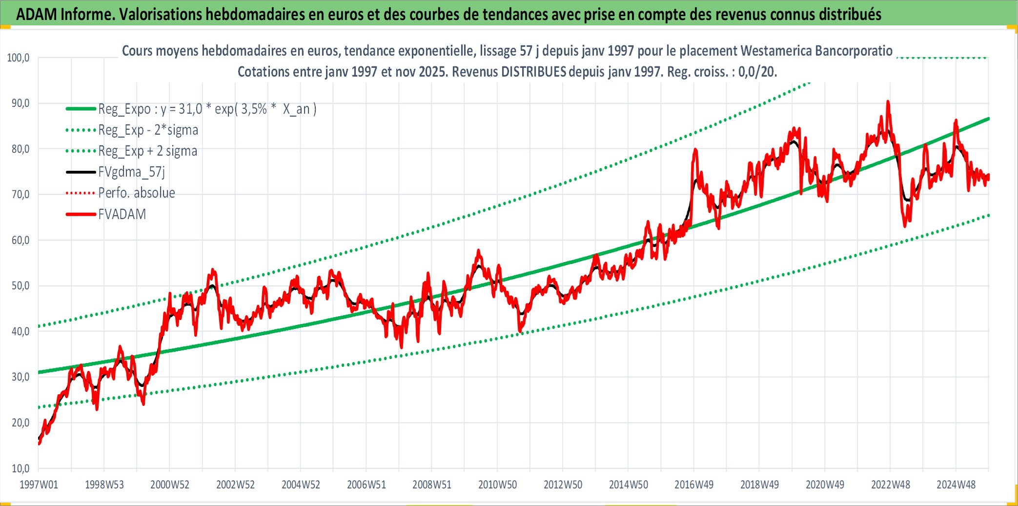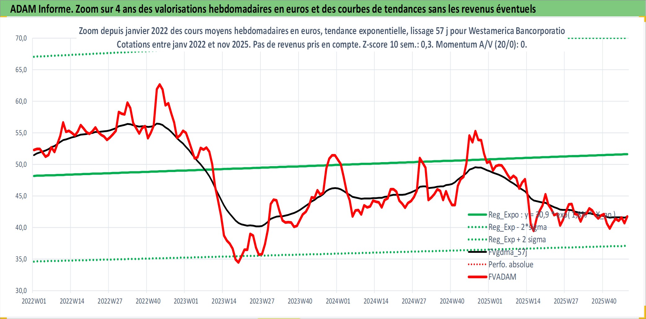 Site dédié aux investisseursPage dédiée sur site financeAnalyse des valorisations hebdomadaires de l'action Westamerica Bancorporation. Cet actif est cote en USD. Les valorisations sont en contrevaleur EURO et couvrent les semaines 1997W01 a 2025W48. Les revenus de cet actif financier sont pris en compte depuis la semaine 1997W03. La note ESG de cet actif n'est pas connue.