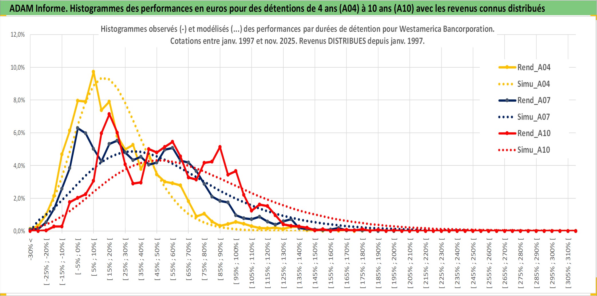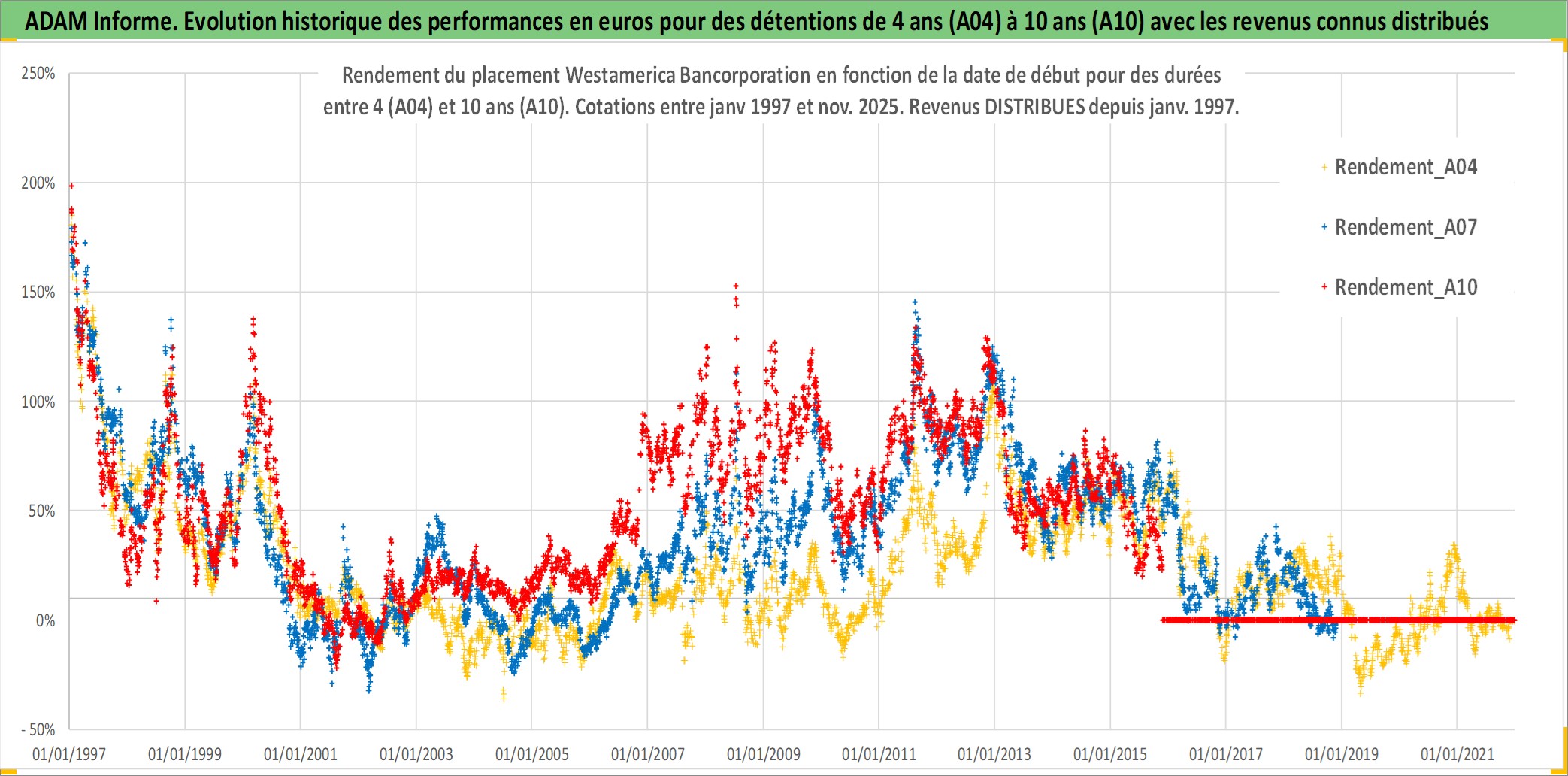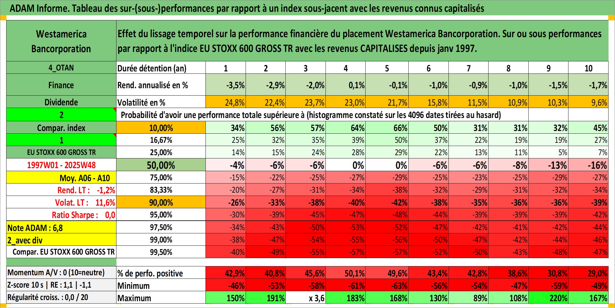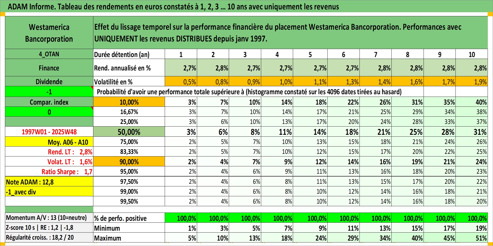 Site dédié aux investisseursPage dédiée sur site financeAnalyse des valorisations hebdomadaires de l'action Westamerica Bancorporation. Cet actif est cote en USD. Les valorisations sont en contrevaleur EURO et couvrent les semaines 1997W01 a 2025W48. Les revenus de cet actif financier sont pris en compte depuis la semaine 1997W03. La note ESG de cet actif n'est pas connue.