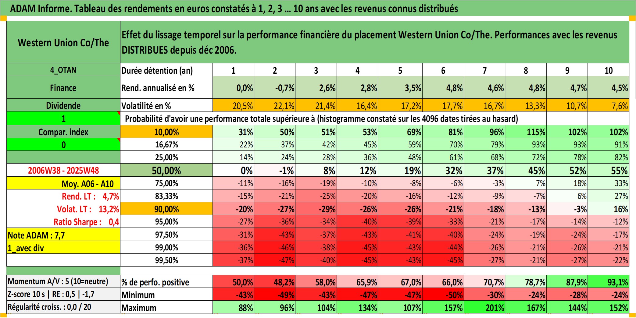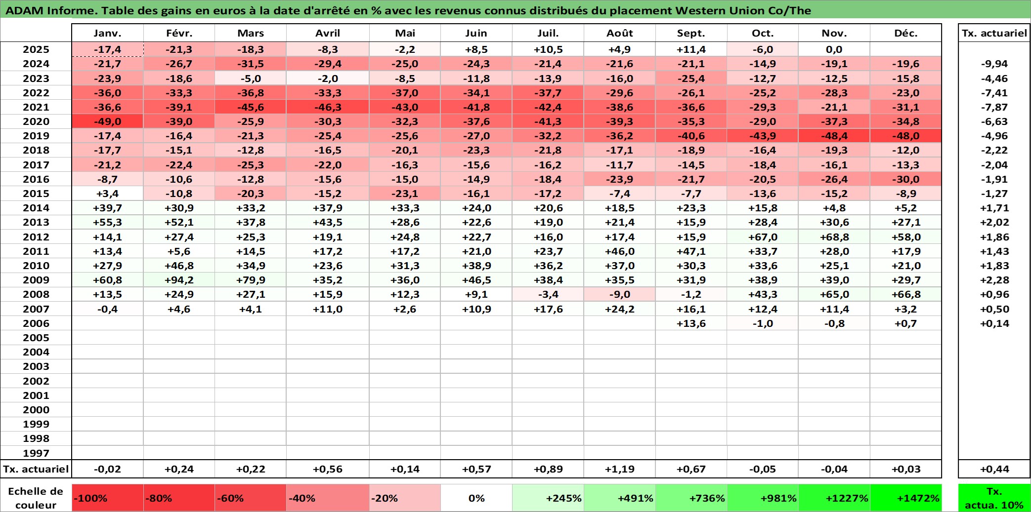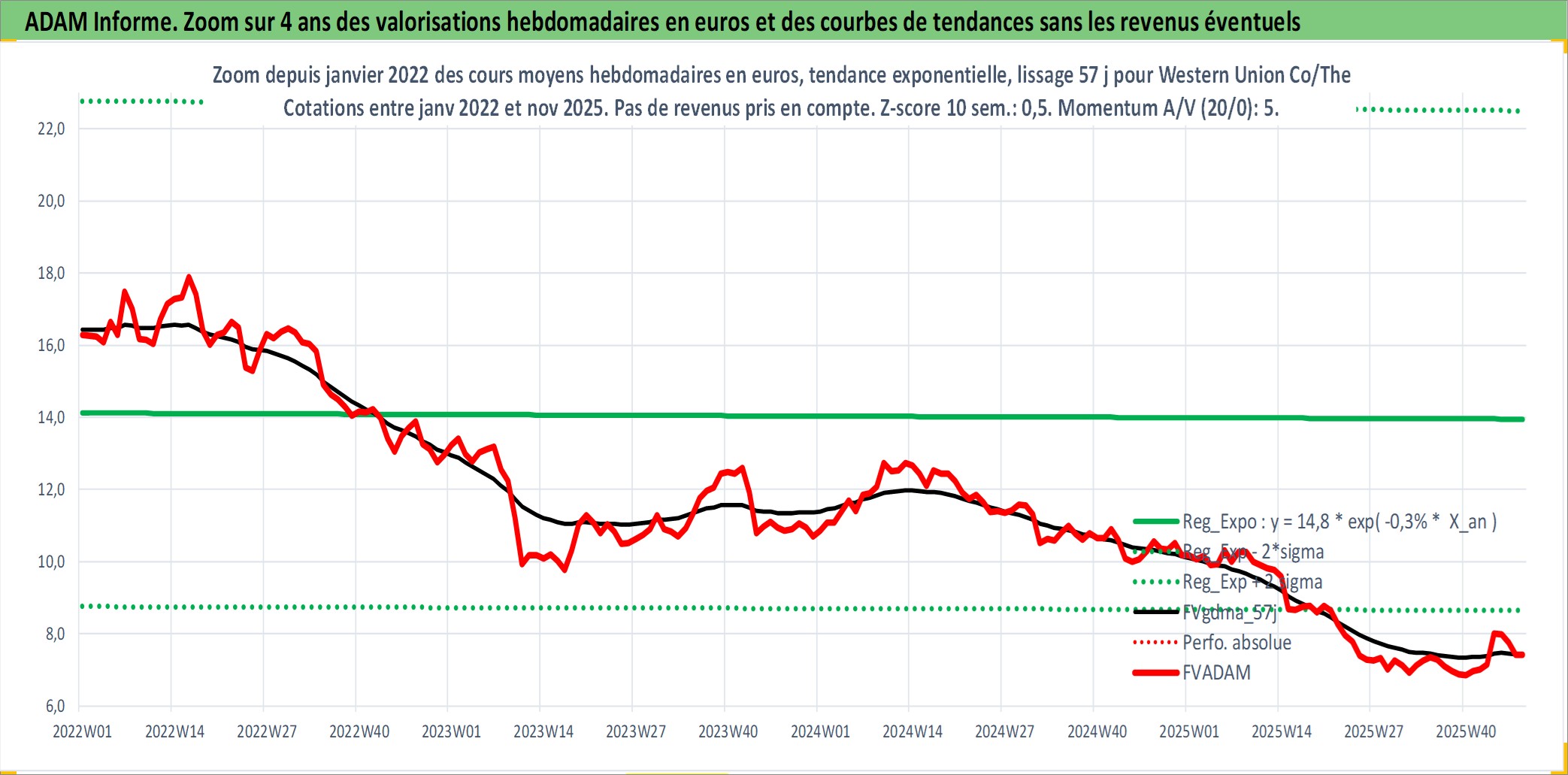 Site dédié aux investisseursPage dédiée sur site financeAnalyse des valorisations hebdomadaires de l'action Western Union Co/The. Cet actif est cote en USD. Les valorisations sont en contrevaleur EURO et couvrent les semaines 2006W38 a 2025W48. Les revenus de cet actif financier sont pris en compte depuis la semaine 2006W50. La note globale ESG de cet actif est estimee a 15.0 (apres rebasage entre 0 et 20).