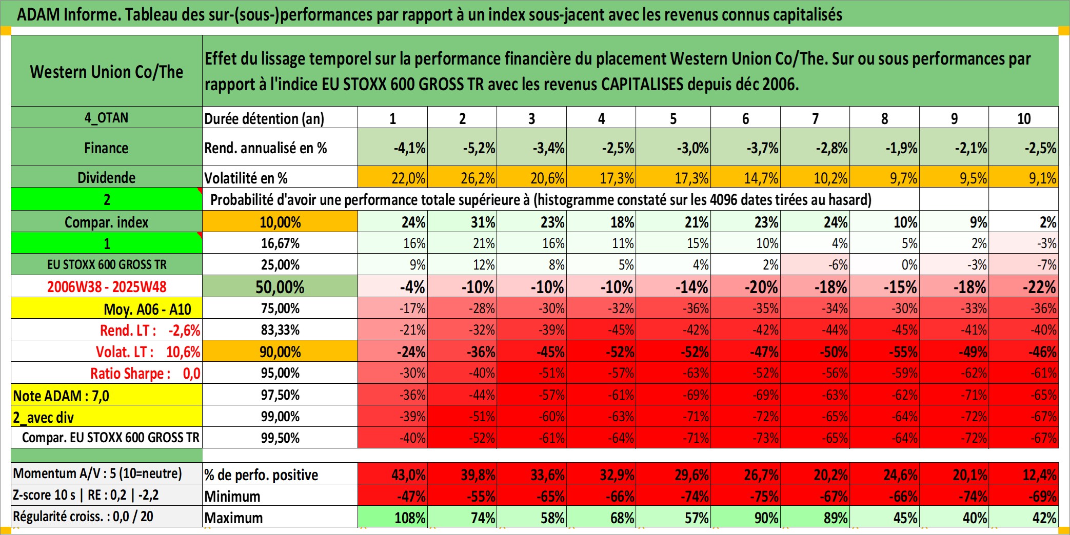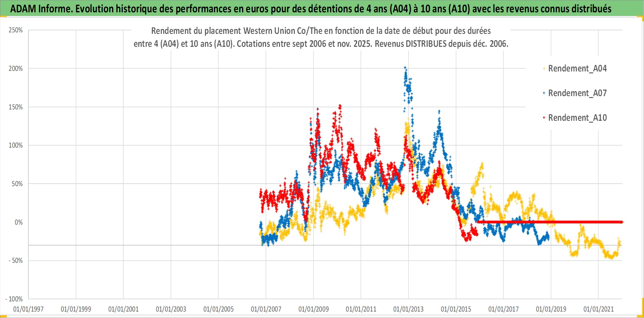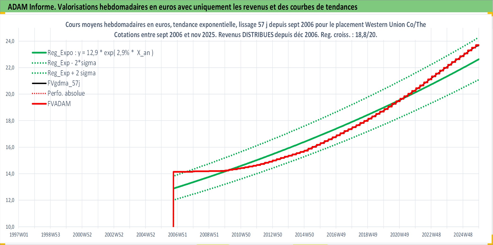 Site dédié aux investisseursPage dédiée sur site financeAnalyse des valorisations hebdomadaires de l'action Western Union Co/The. Cet actif est cote en USD. Les valorisations sont en contrevaleur EURO et couvrent les semaines 2006W38 a 2025W48. Les revenus de cet actif financier sont pris en compte depuis la semaine 2006W50. La note globale ESG de cet actif est estimee a 15.0 (apres rebasage entre 0 et 20).