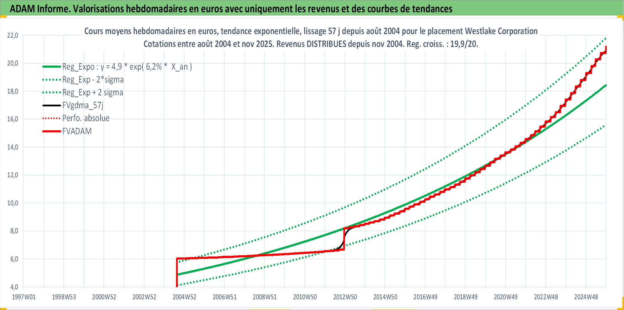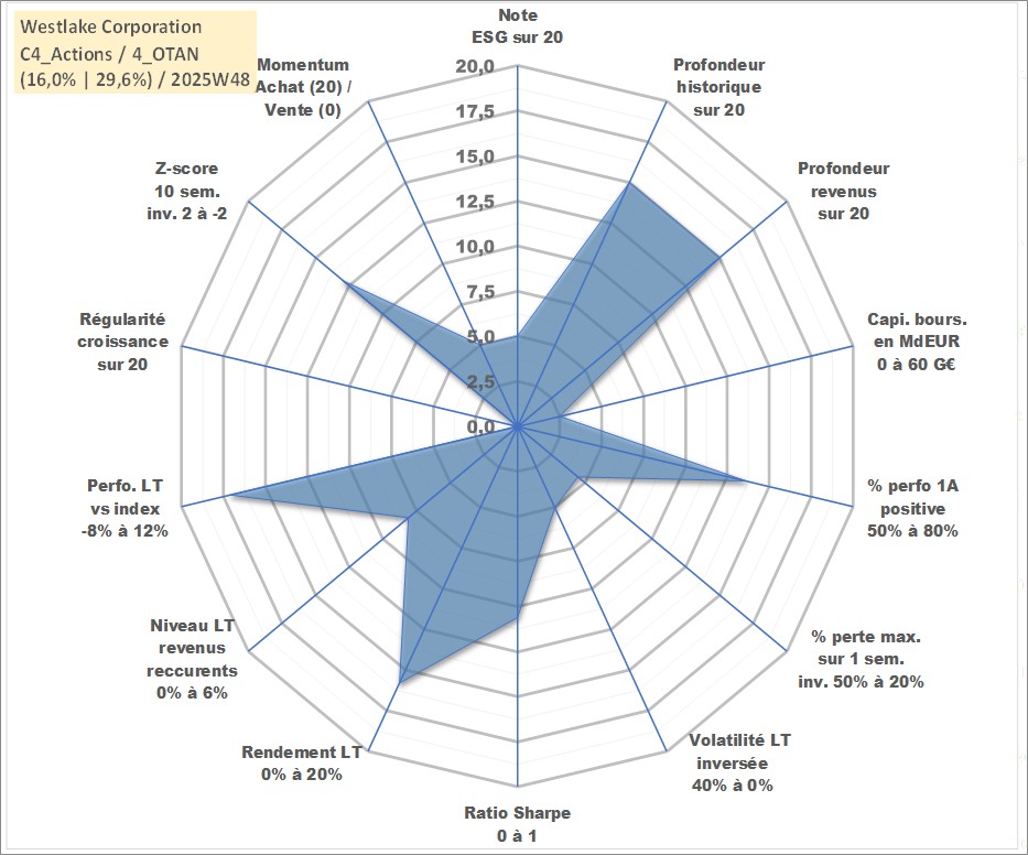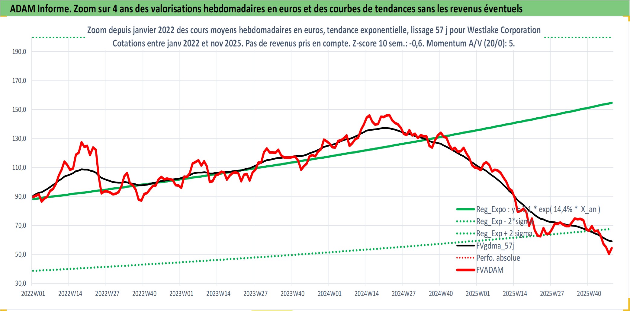 Site dédié aux investisseursPage dédiée sur site financeAnalyse des valorisations hebdomadaires de l'action Westlake Corporation. Cet actif est cote en USD. Les valorisations sont en contrevaleur EURO et couvrent les semaines 2004W33 a 2025W48. Les revenus de cet actif financier sont pris en compte depuis la semaine 2004W47. La note globale ESG de cet actif est estimee a 5.0 (apres rebasage entre 0 et 20).