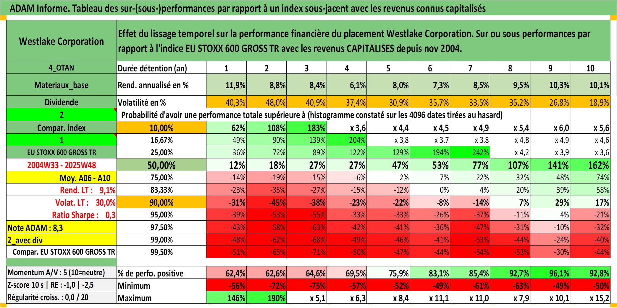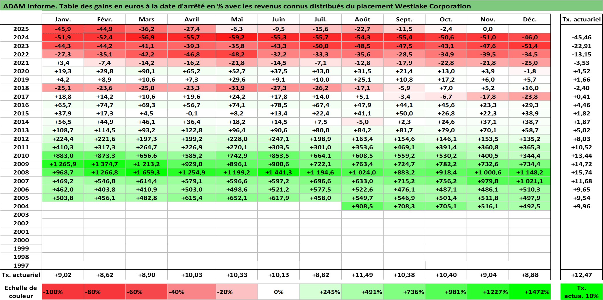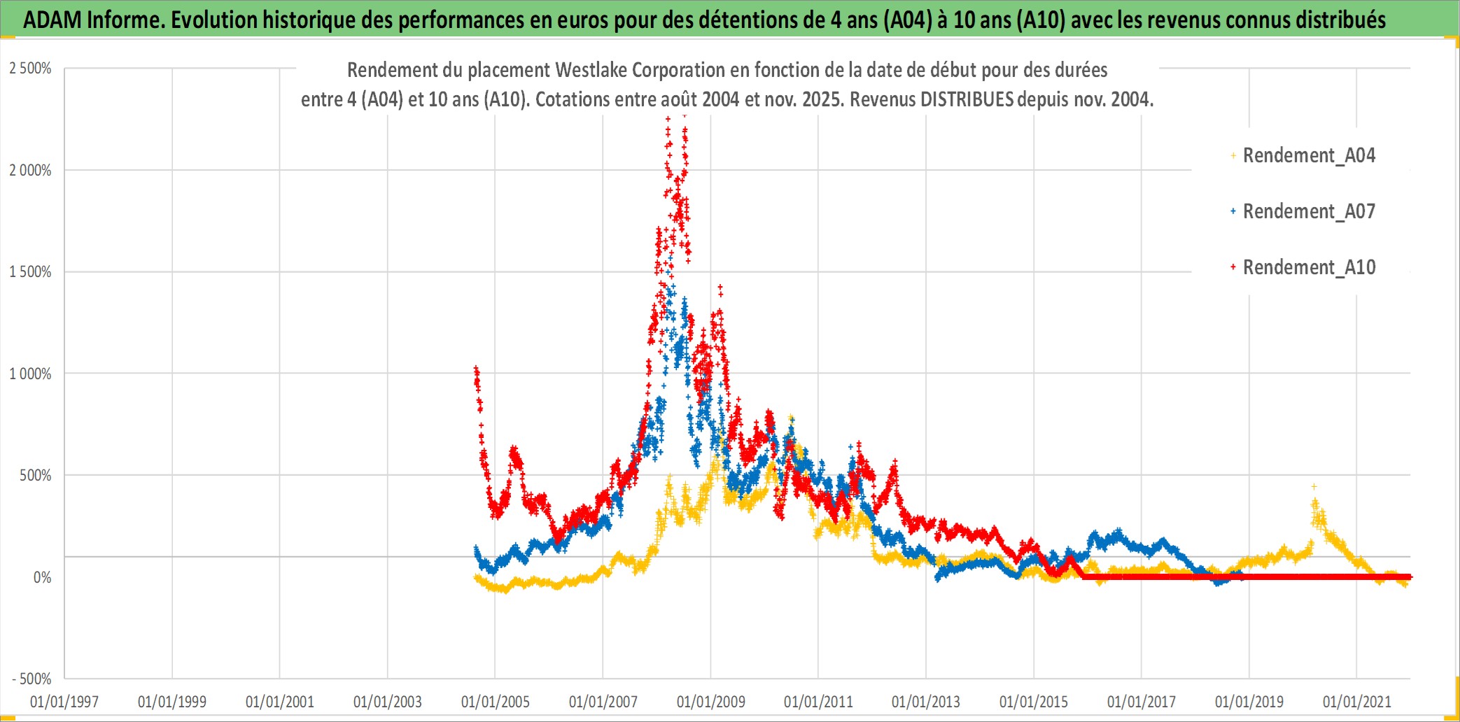 Site dédié aux investisseursPage dédiée sur site financeAnalyse des valorisations hebdomadaires de l'action Westlake Corporation. Cet actif est cote en USD. Les valorisations sont en contrevaleur EURO et couvrent les semaines 2004W33 a 2025W48. Les revenus de cet actif financier sont pris en compte depuis la semaine 2004W47. La note globale ESG de cet actif est estimee a 5.0 (apres rebasage entre 0 et 20).