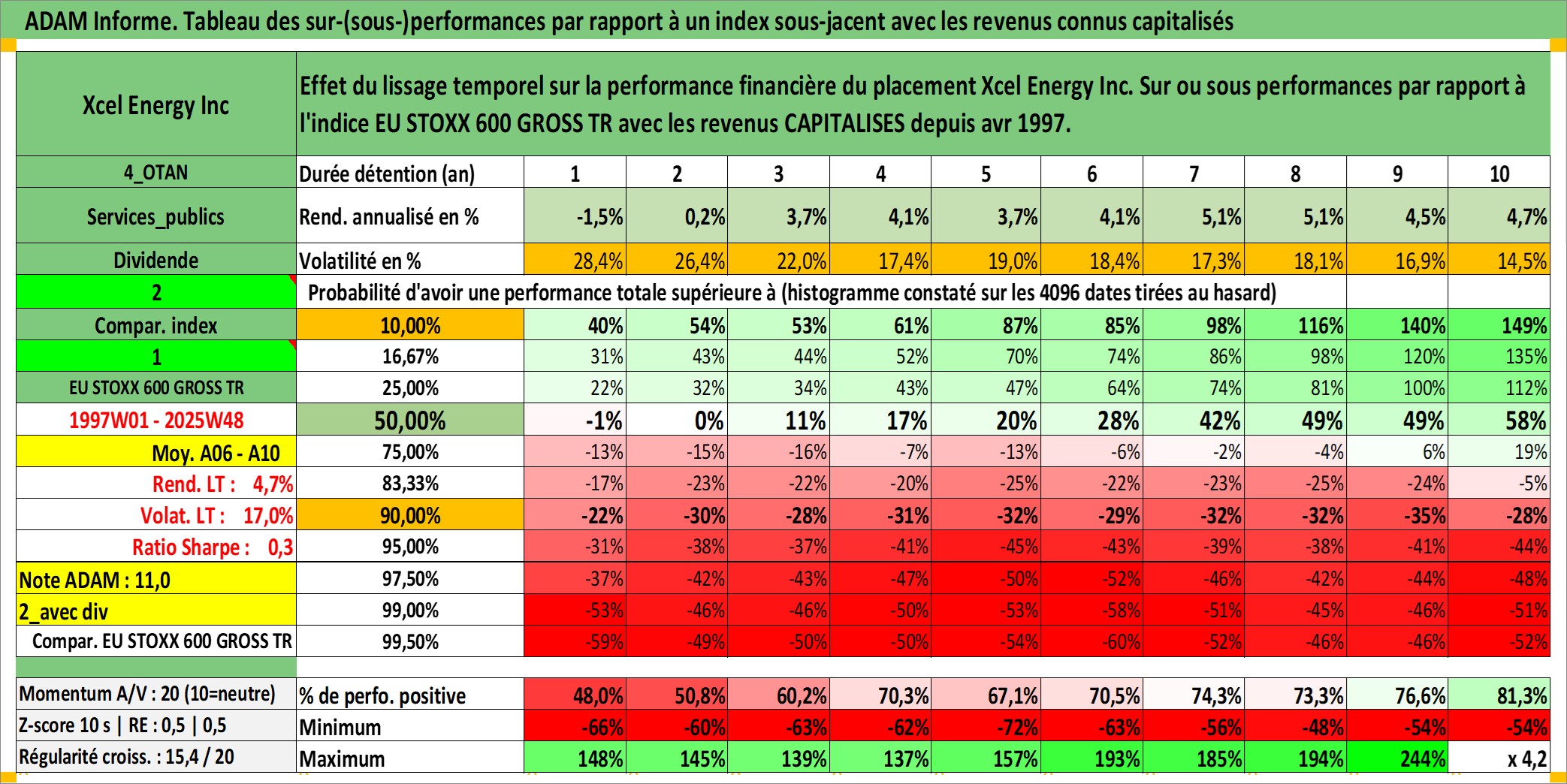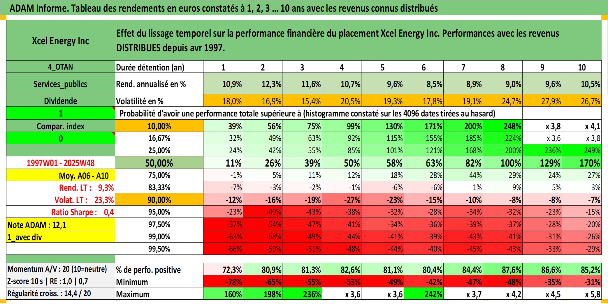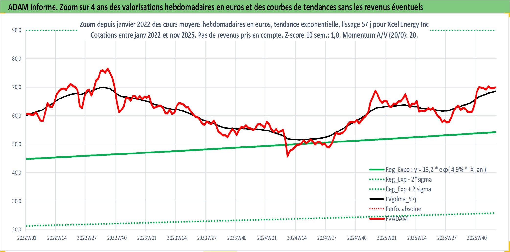 Site dédié aux investisseursPage dédiée sur site financeAnalyse des valorisations hebdomadaires de l'action Xcel Energy Inc. Cet actif est cote en USD. Les valorisations sont en contrevaleur EURO et couvrent les semaines 1997W01 a 2025W48. Les revenus de cet actif financier sont pris en compte depuis la semaine 1997W15. La note globale ESG de cet actif est estimee a 8.0 (apres rebasage entre 0 et 20).