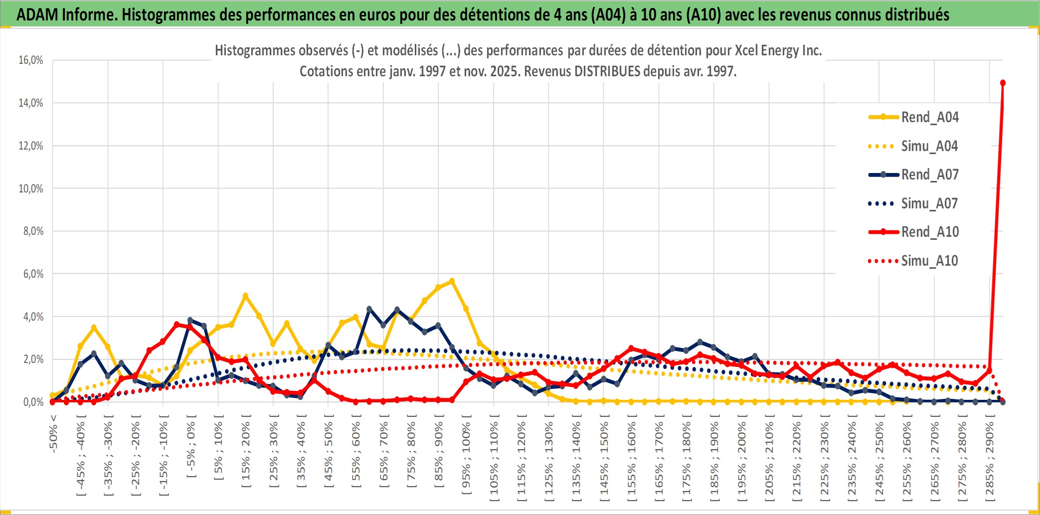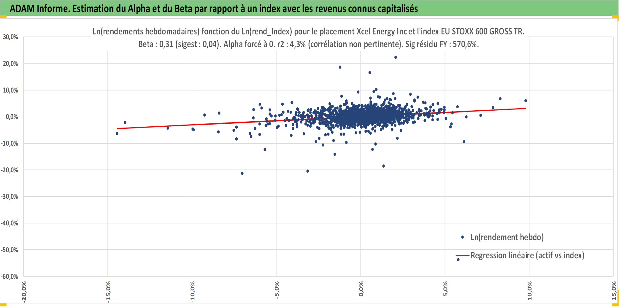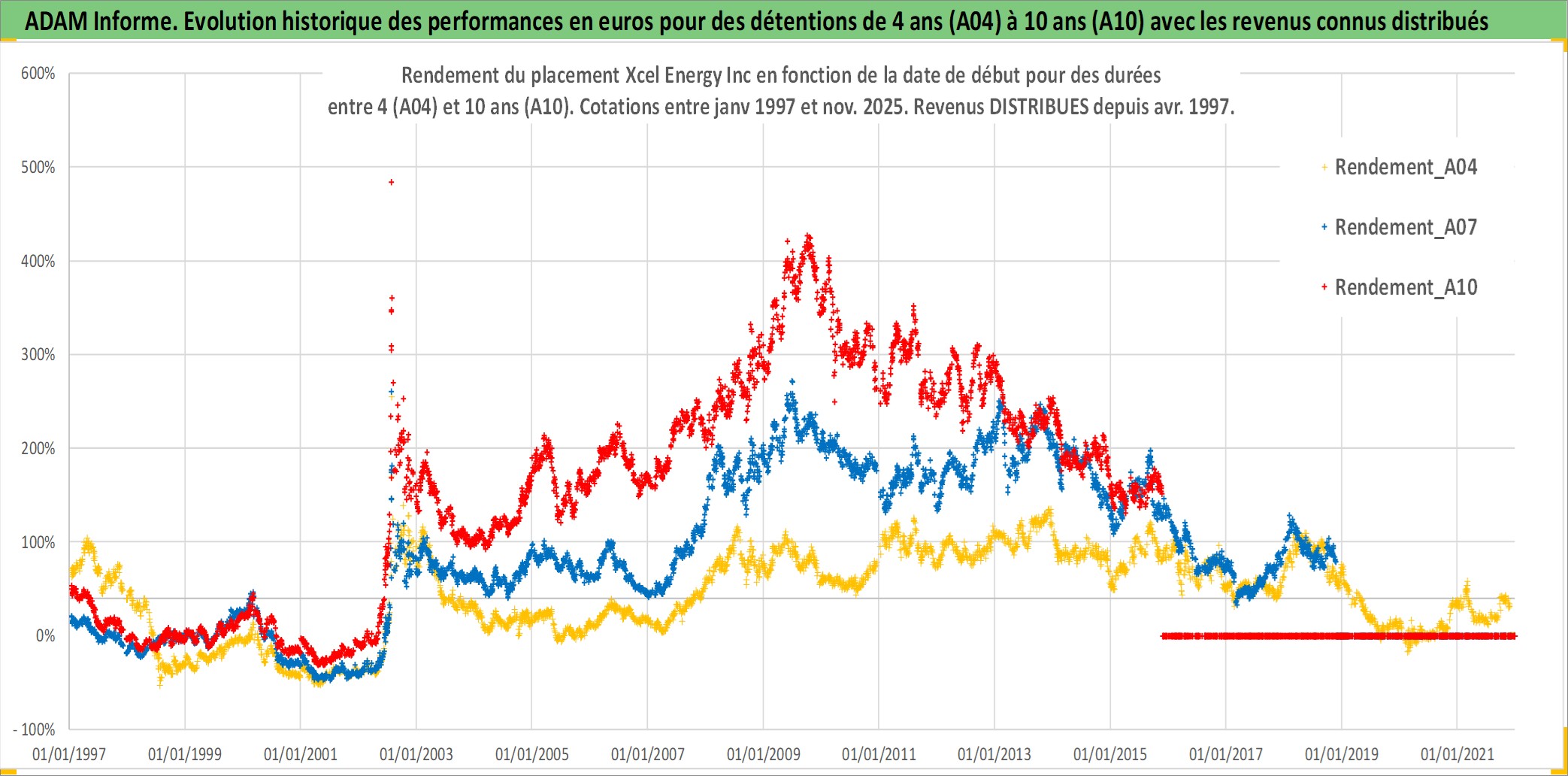 Site dédié aux investisseursPage dédiée sur site financeAnalyse des valorisations hebdomadaires de l'action Xcel Energy Inc. Cet actif est cote en USD. Les valorisations sont en contrevaleur EURO et couvrent les semaines 1997W01 a 2025W48. Les revenus de cet actif financier sont pris en compte depuis la semaine 1997W15. La note globale ESG de cet actif est estimee a 8.0 (apres rebasage entre 0 et 20).