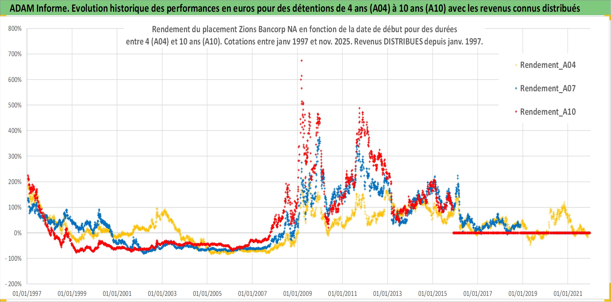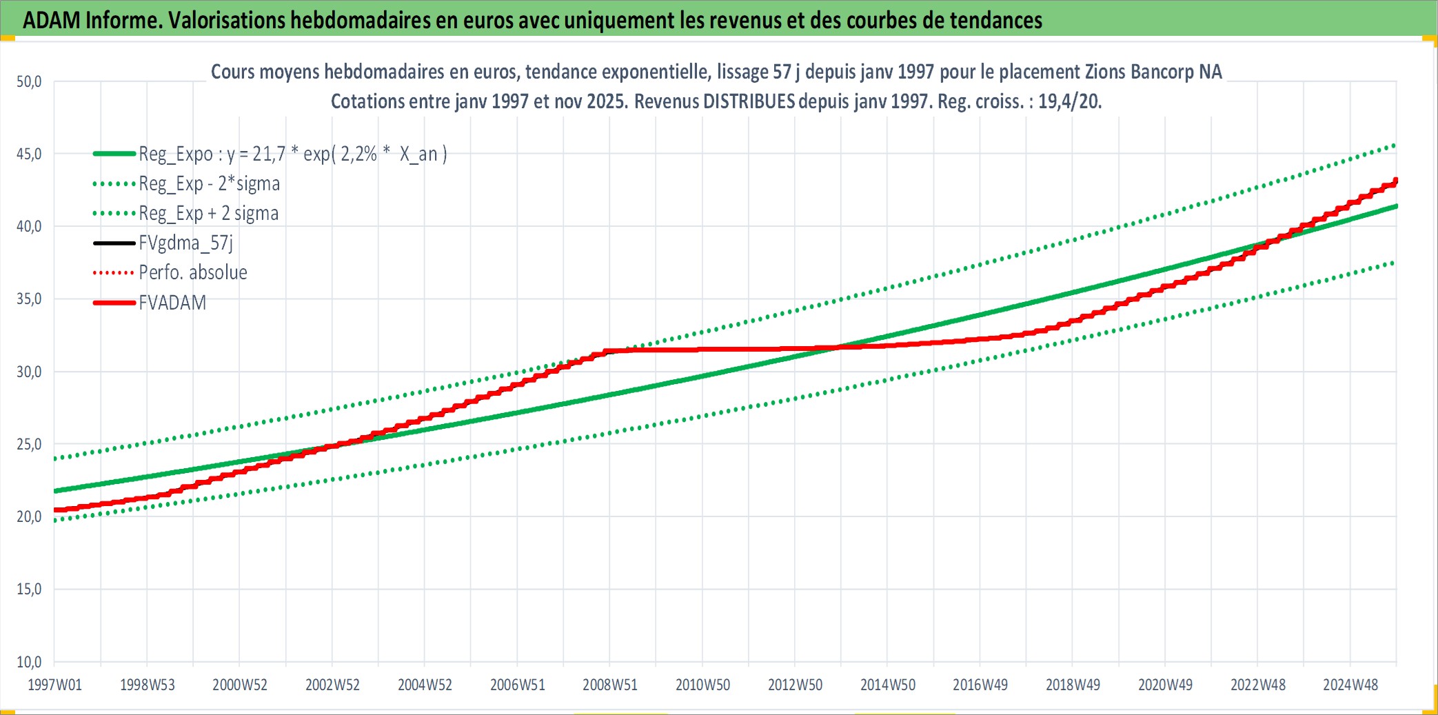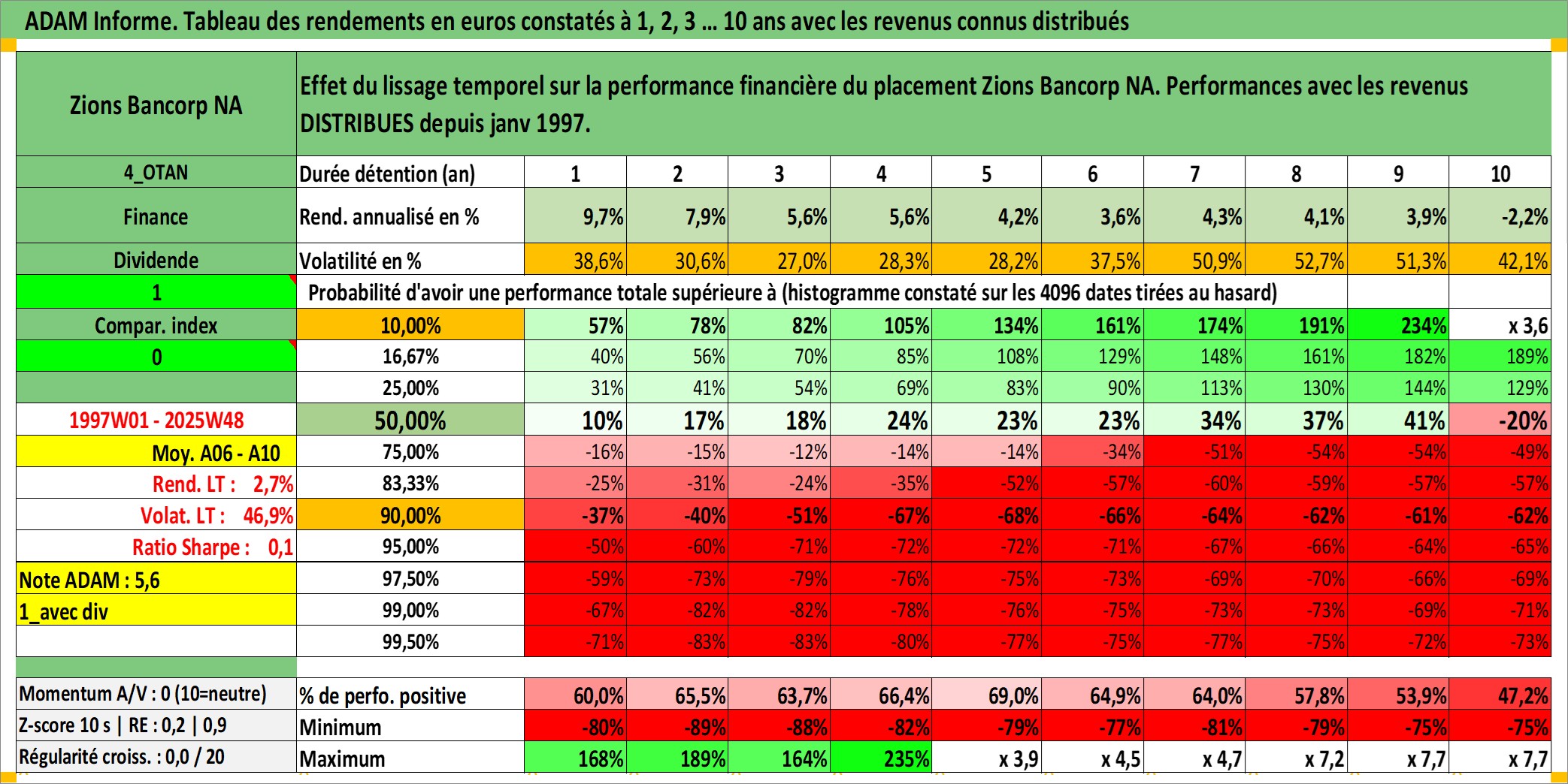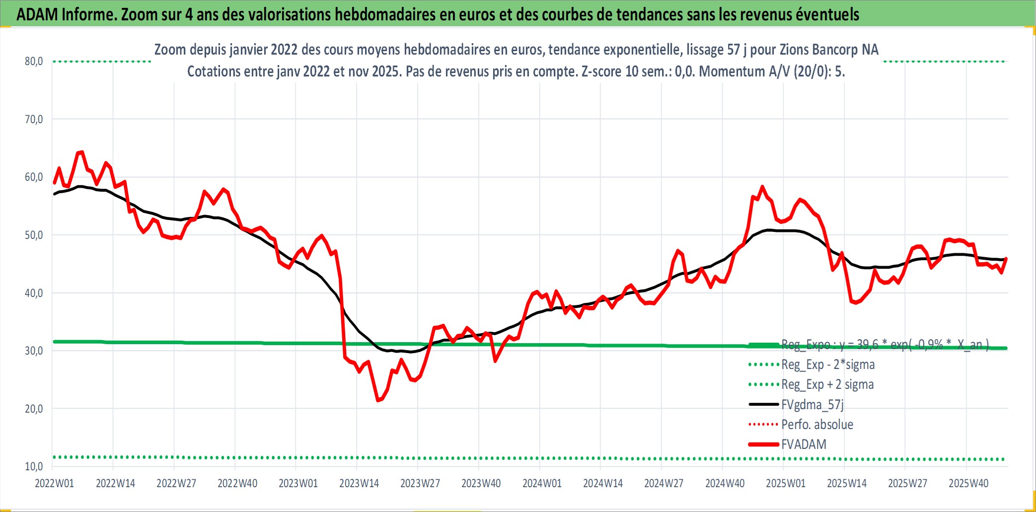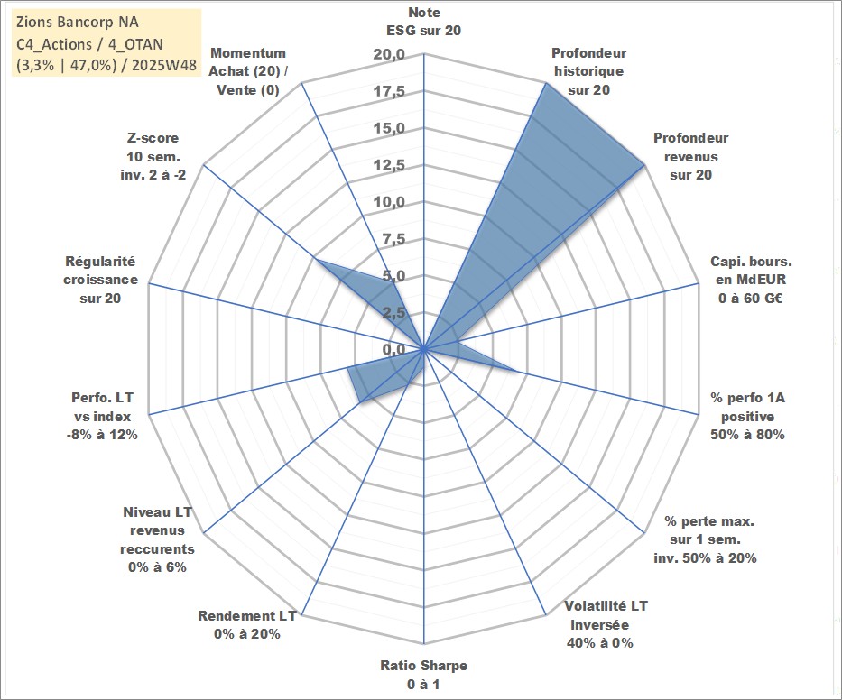 Site dédié aux investisseursPage dédiée sur site financeAnalyse des valorisations hebdomadaires de l'action Zions Bancorp NA. Cet actif est cote en USD. Les valorisations sont en contrevaleur EURO et couvrent les semaines 1997W01 a 2025W48. Les revenus de cet actif financier sont pris en compte depuis la semaine 1997W01. La note ESG de cet actif n'est pas connue.