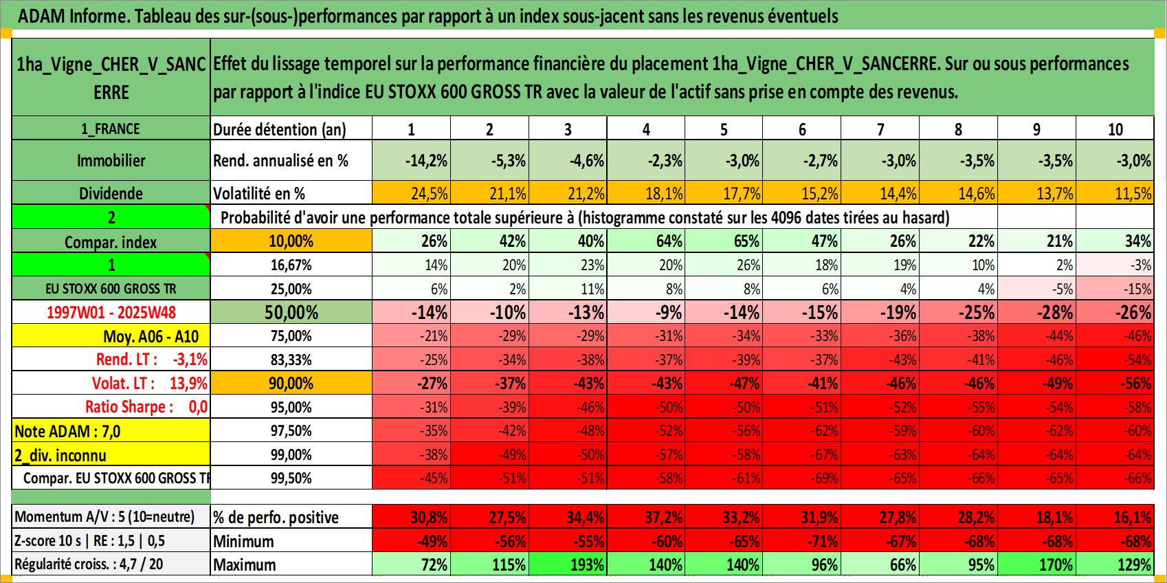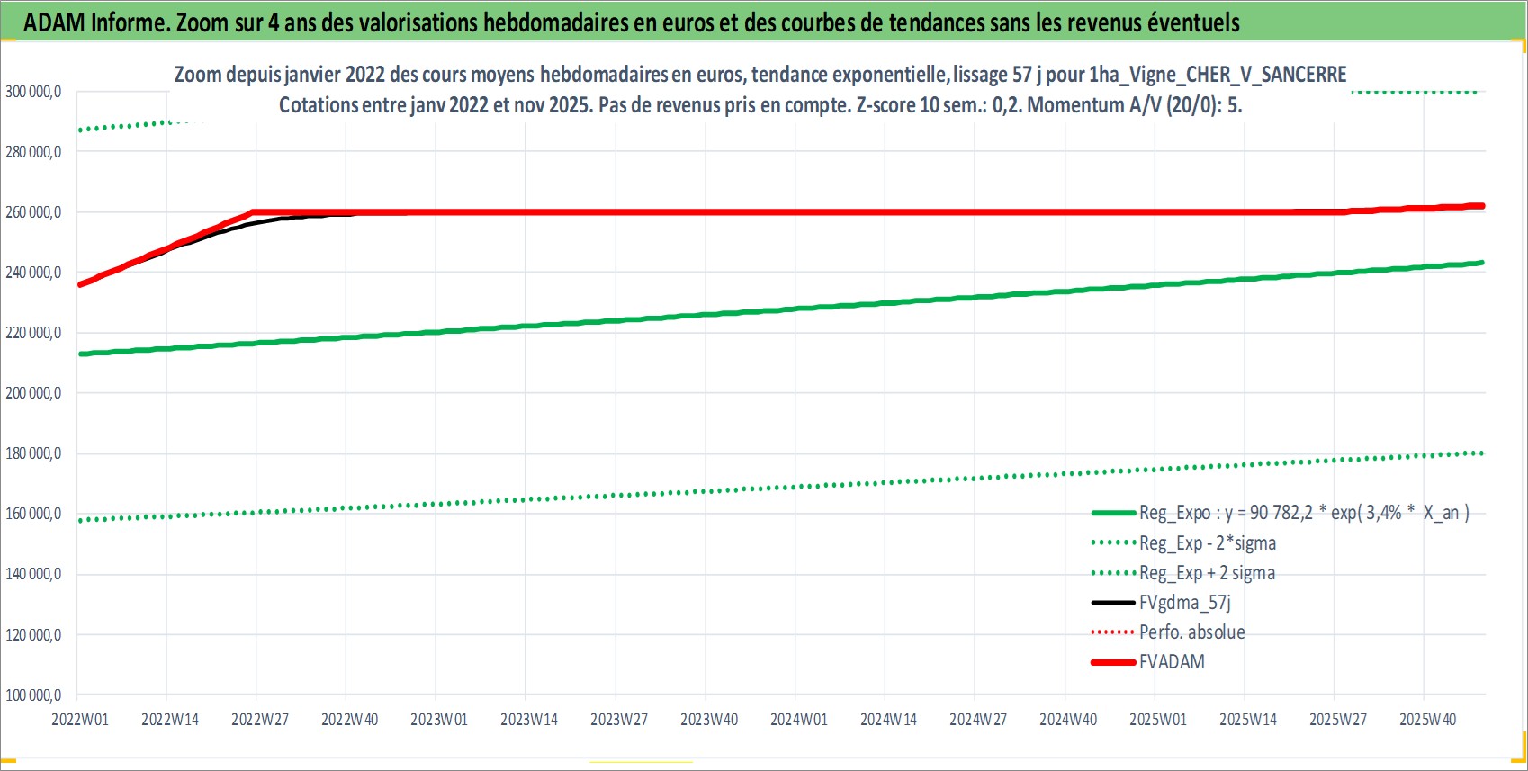 Site dédié aux investisseursPage dédiée sur site financeAnalyse des valorisations hebdomadaires de l'actif 1ha_Vigne_CHER_V_SANCERRE. Cet actif est cote en EUR. Les valorisations couvrent les semaines 1997W01 a 2025W48. Les fermages de ce bien foncier sont pris egaux a 2,5% annuels de la valeur venale du bien.