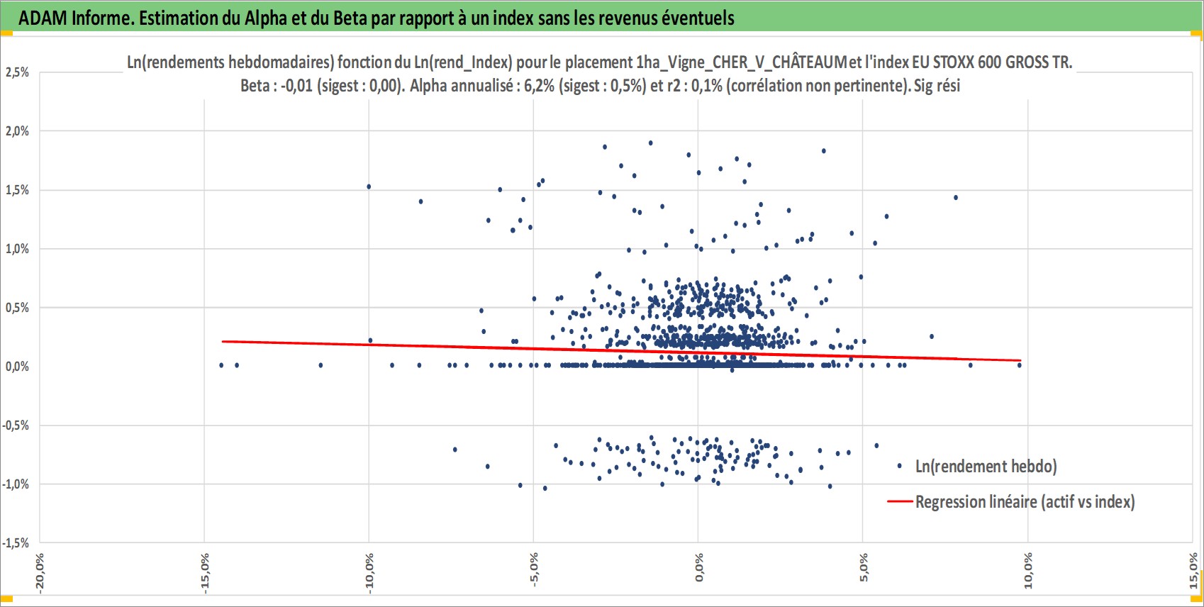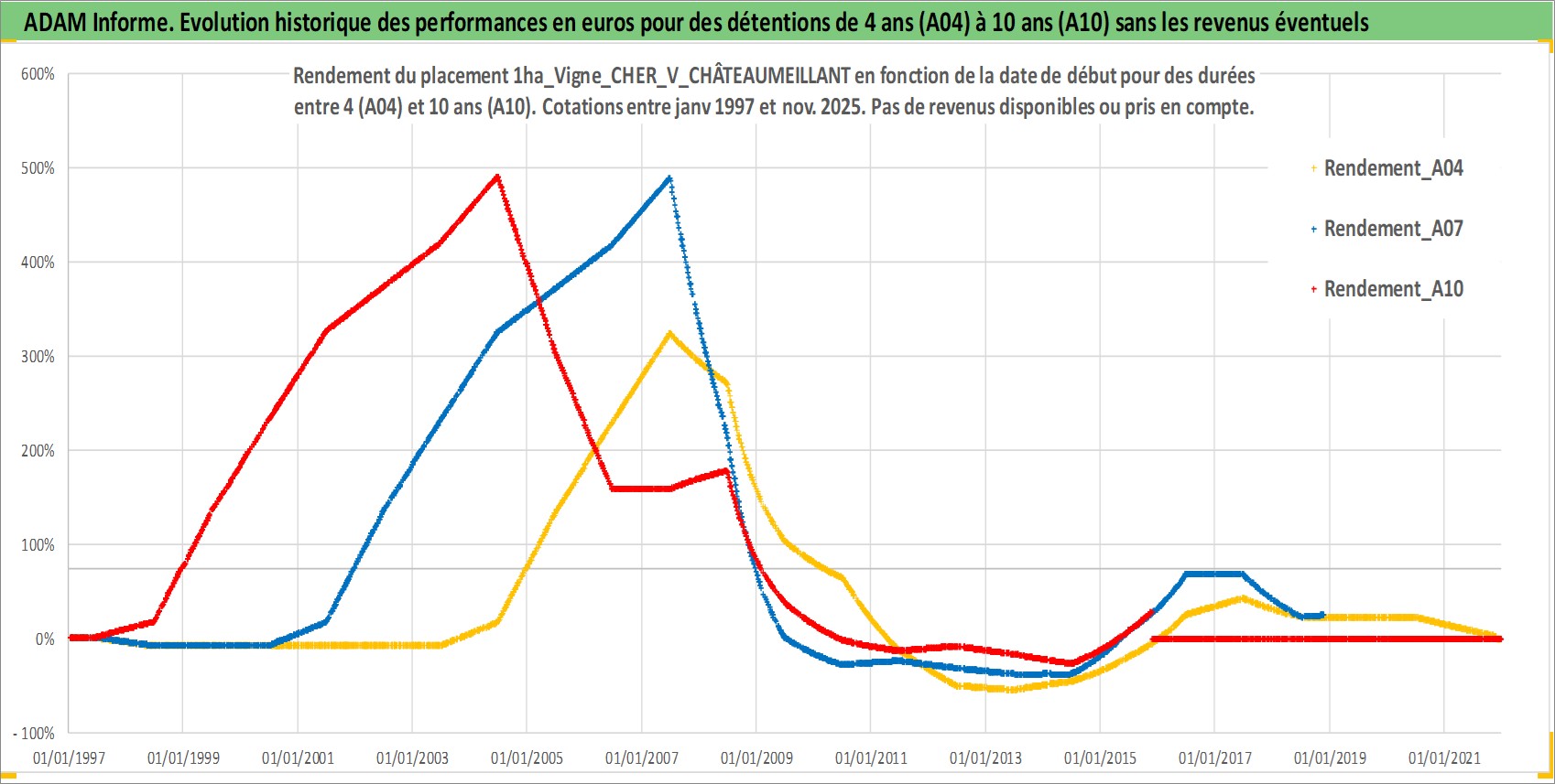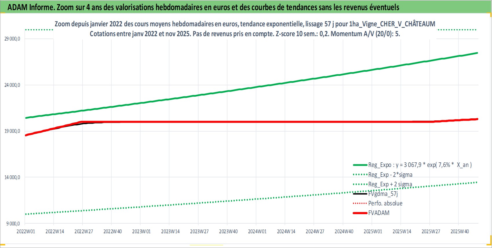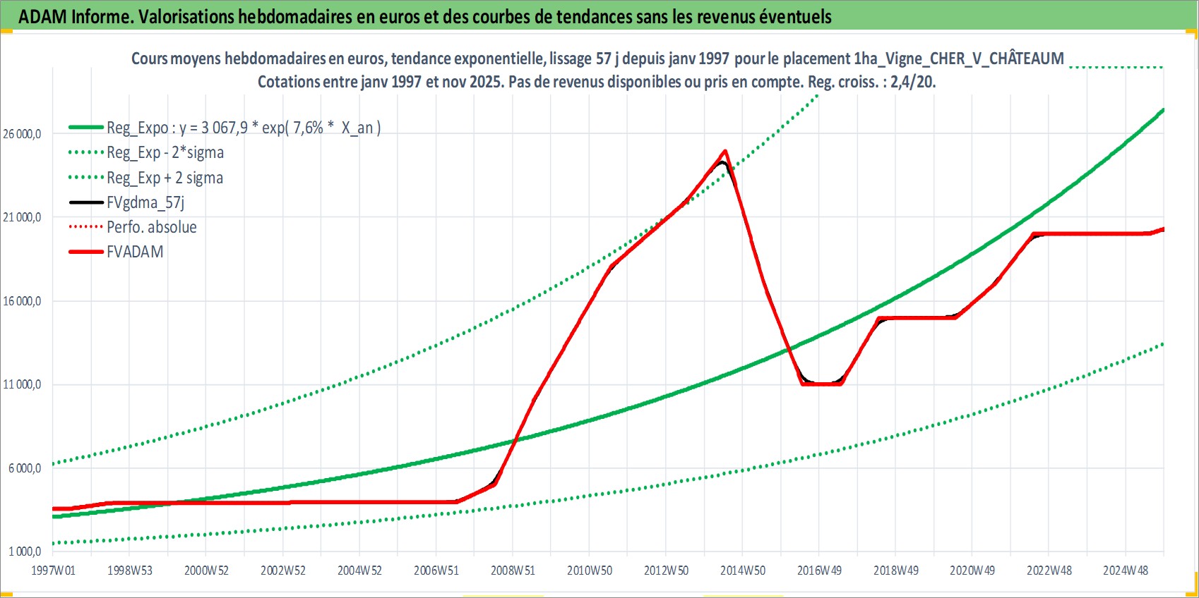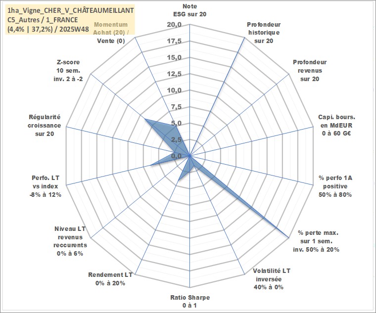 Site dédié aux investisseursPage dédiée sur site financeAnalyse des valorisations hebdomadaires de l'actif 1ha_Vigne_CHER_V_CHÂTEAUMEILLANT. Cet actif est cote en EUR. Les valorisations couvrent les semaines 1997W01 a 2025W48. Les fermages de ce bien foncier sont pris egaux a 2,5% annuels de la valeur venale du bien.