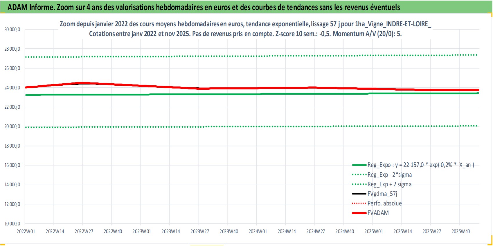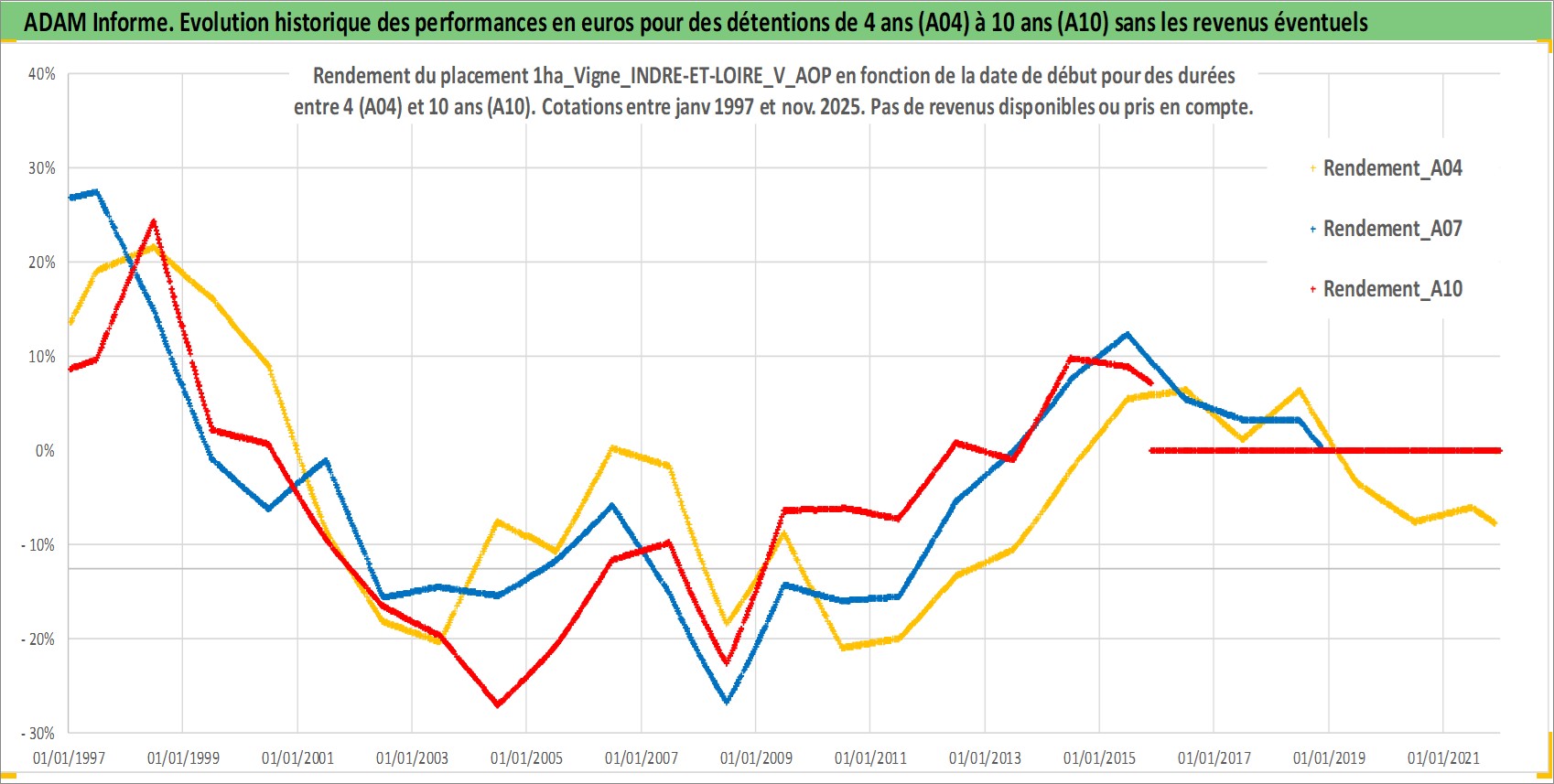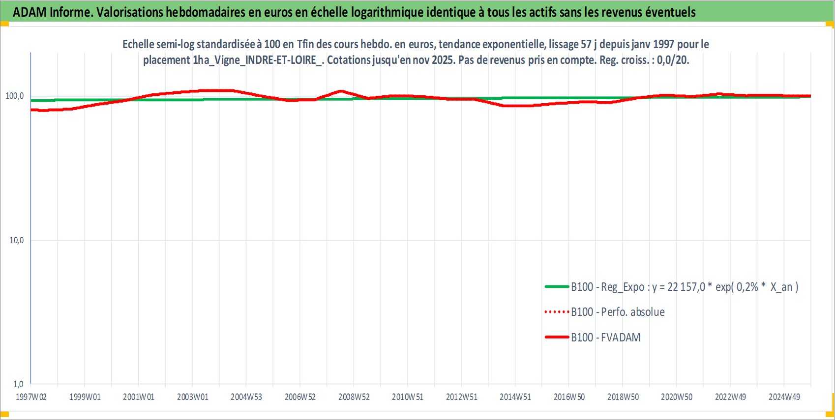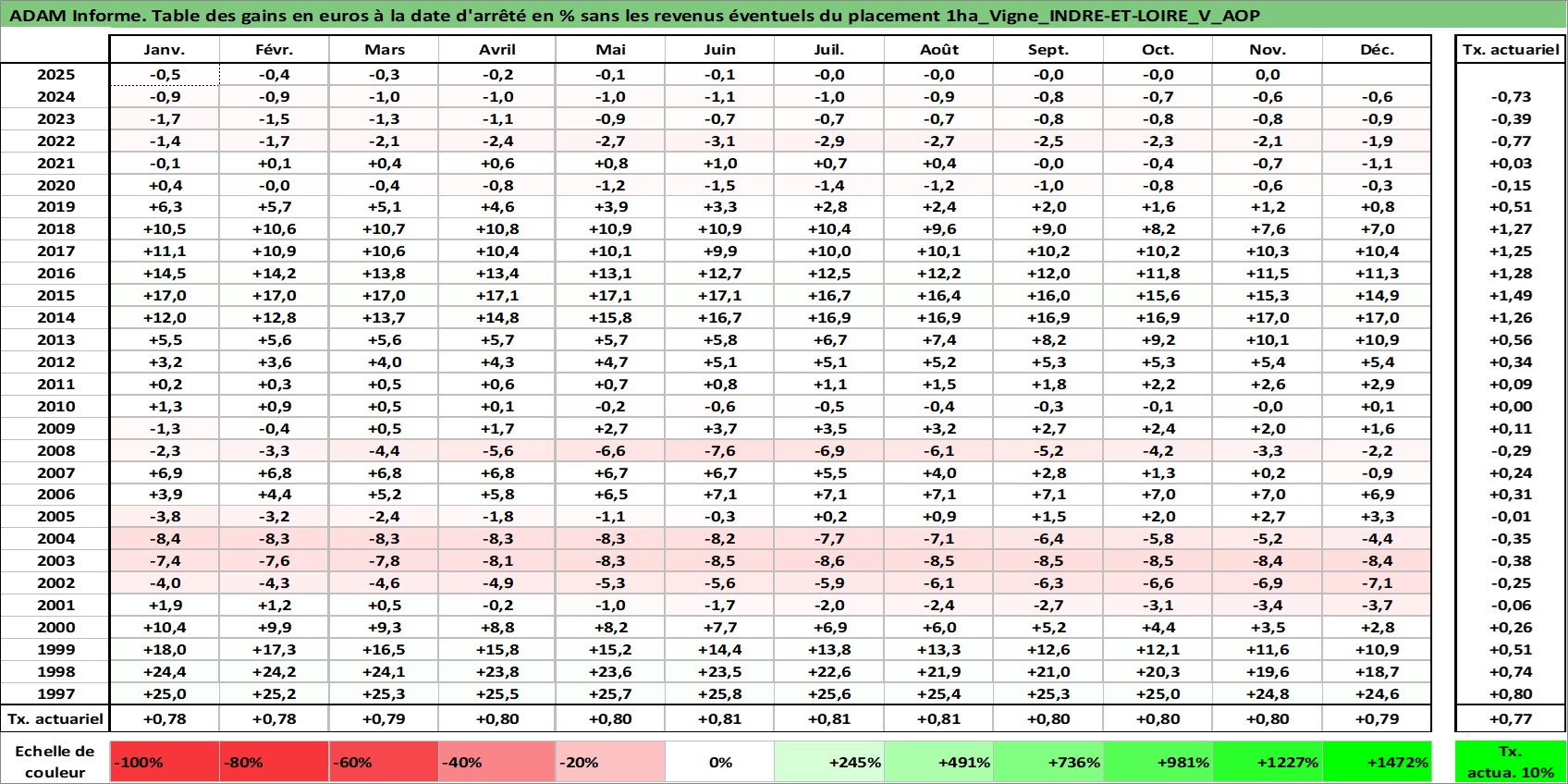 Site dédié aux investisseursPage dédiée sur site financeAnalyse des valorisations hebdomadaires de l'actif 1ha_Vigne_INDRE-ET-LOIRE_V_AOP. Cet actif est cote en EUR. Les valorisations couvrent les semaines 1997W01 a 2025W48. Les fermages de ce bien foncier sont pris egaux a 2,5% annuels de la valeur venale du bien.
