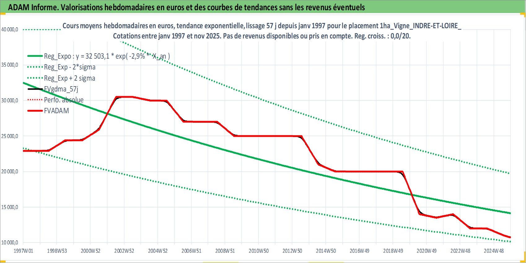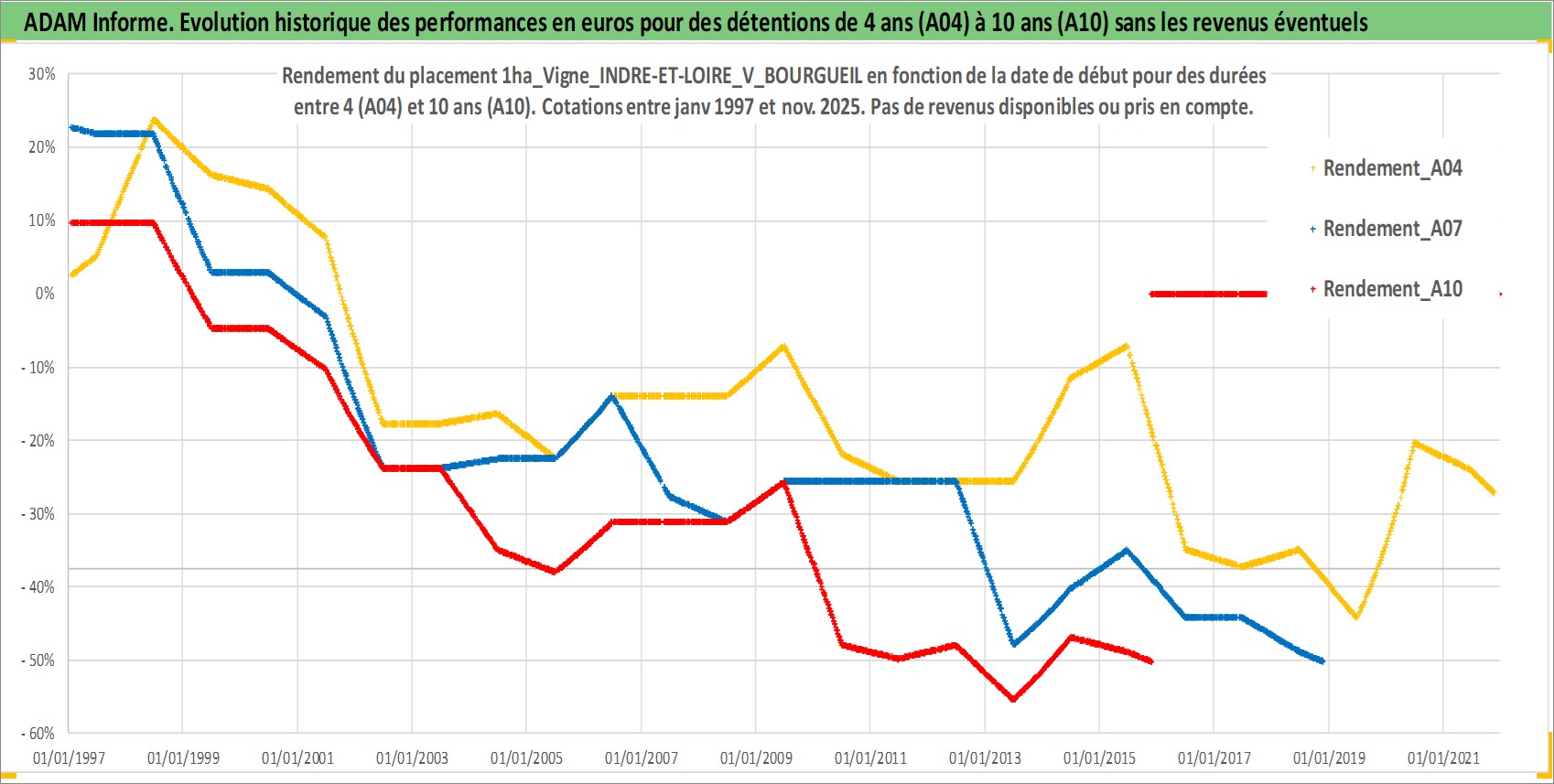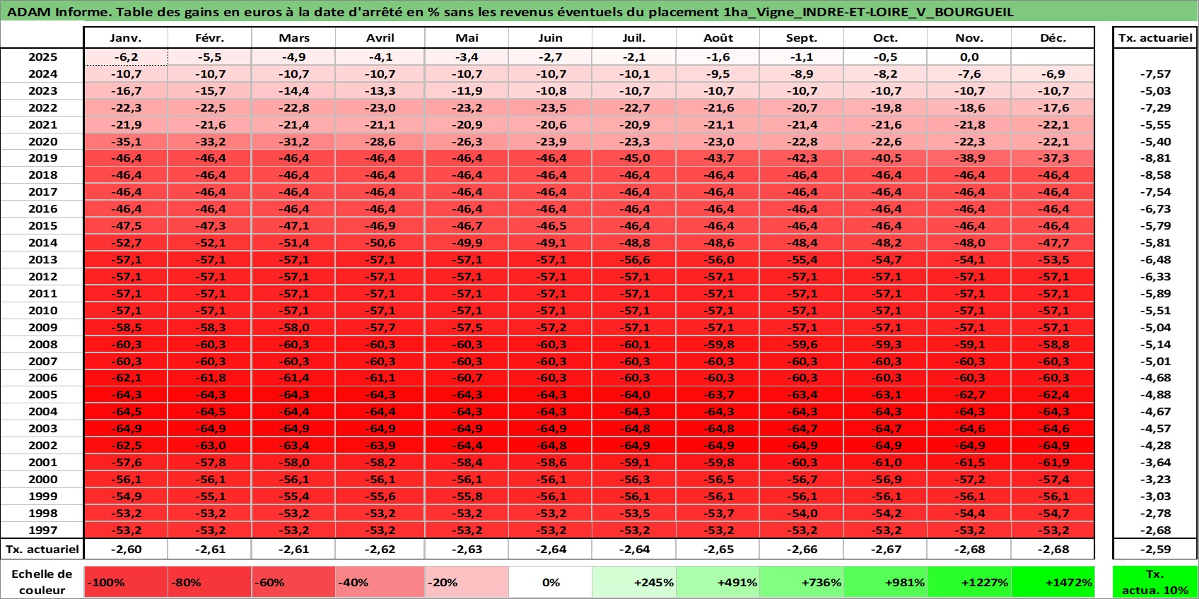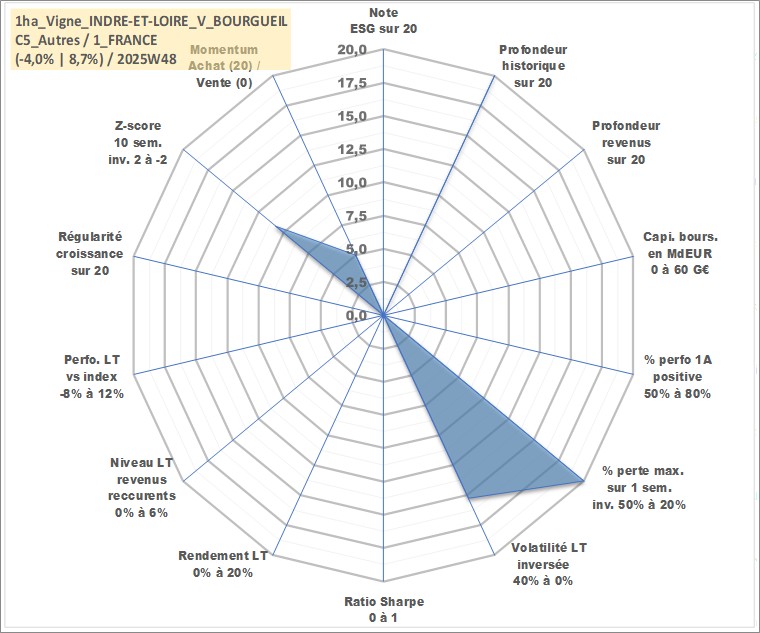 Site dédié aux investisseursPage dédiée sur site financeAnalyse des valorisations hebdomadaires de l'actif 1ha_Vigne_INDRE-ET-LOIRE_V_BOURGUEIL. Cet actif est cote en EUR. Les valorisations couvrent les semaines 1997W01 a 2025W48. Les fermages de ce bien foncier sont pris egaux a 2,5% annuels de la valeur venale du bien.
