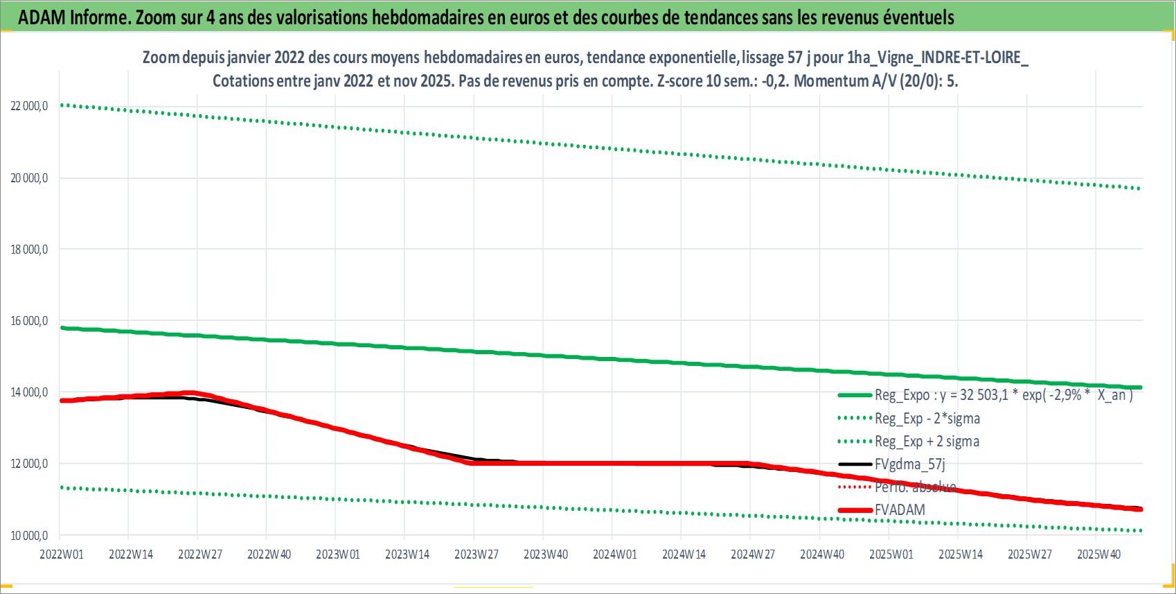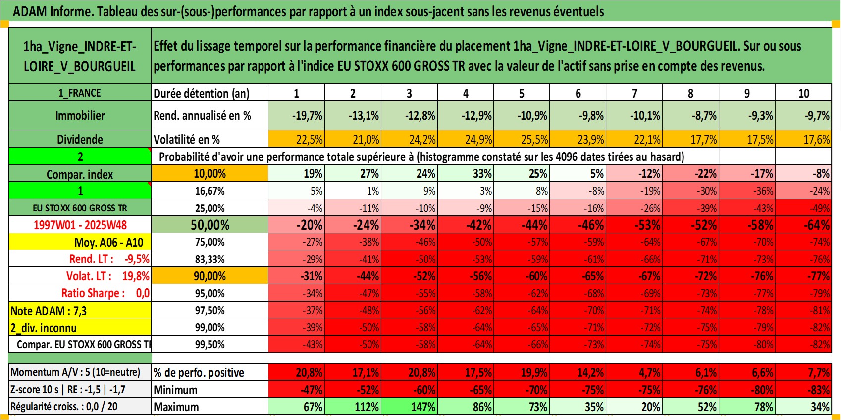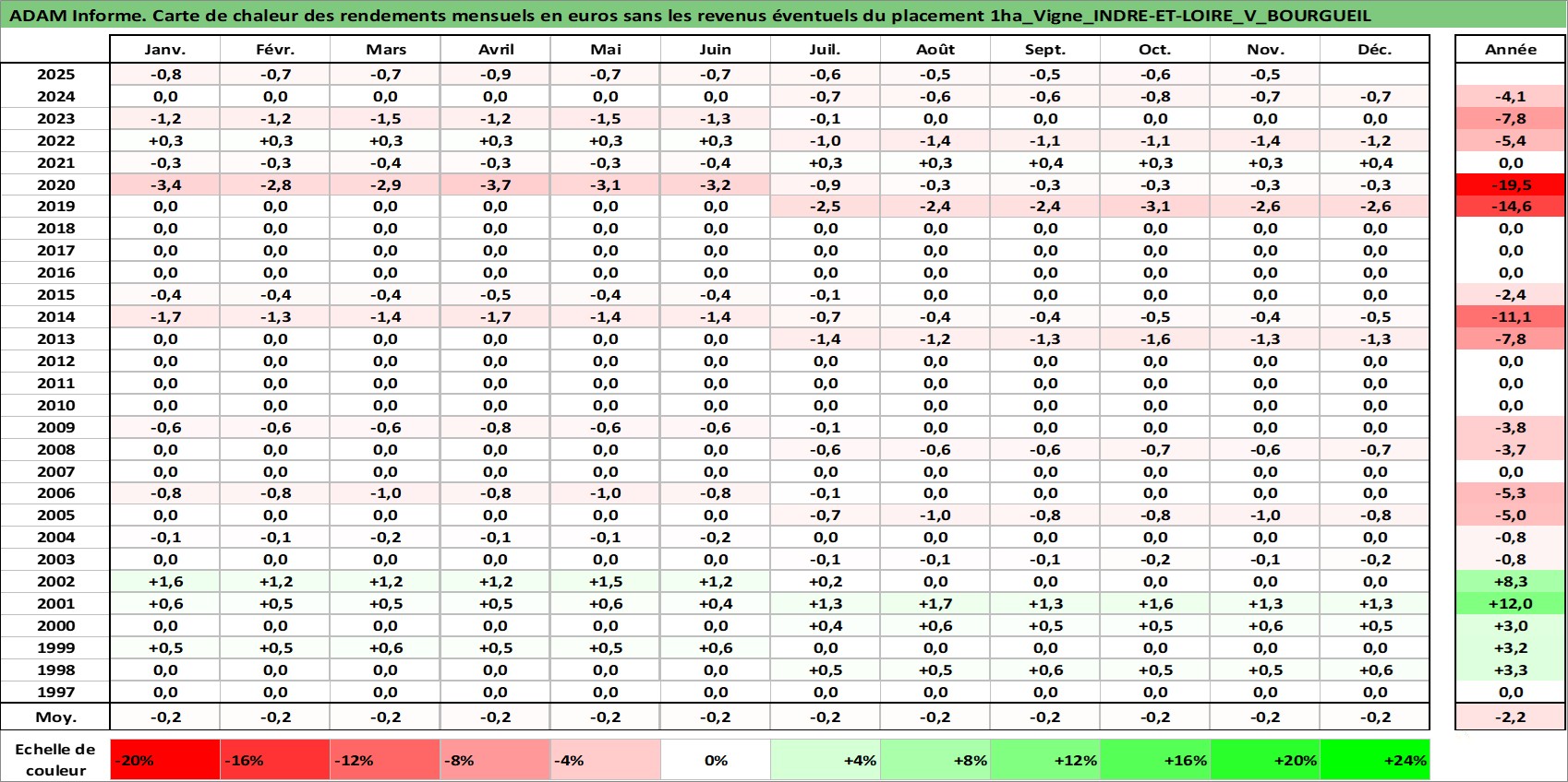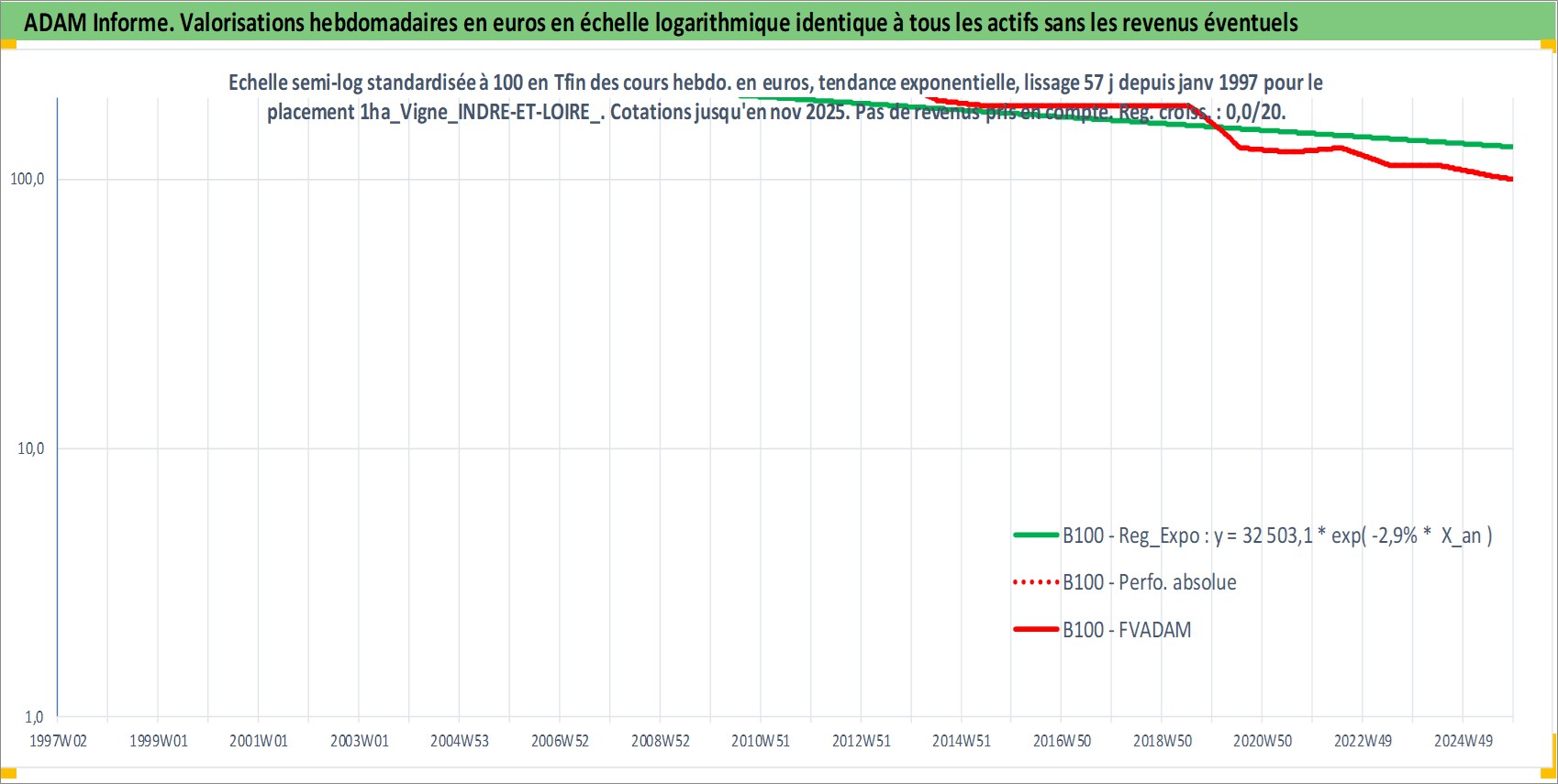 Site dédié aux investisseursPage dédiée sur site financeAnalyse des valorisations hebdomadaires de l'actif 1ha_Vigne_INDRE-ET-LOIRE_V_BOURGUEIL. Cet actif est cote en EUR. Les valorisations couvrent les semaines 1997W01 a 2025W48. Les fermages de ce bien foncier sont pris egaux a 2,5% annuels de la valeur venale du bien.