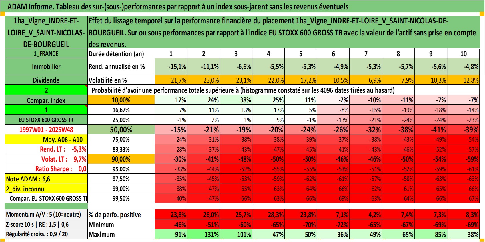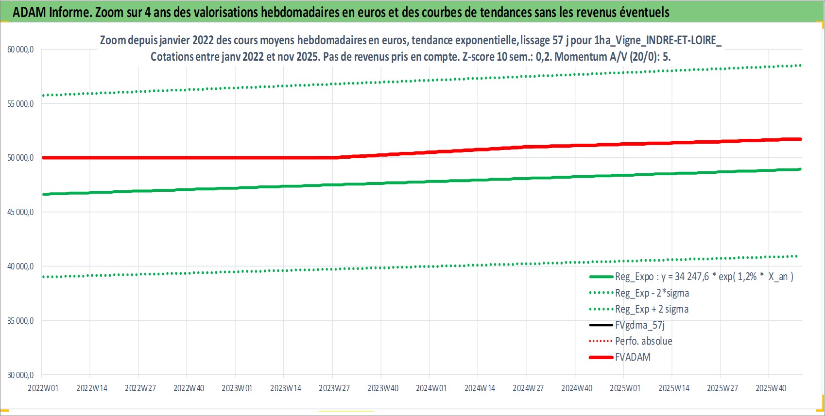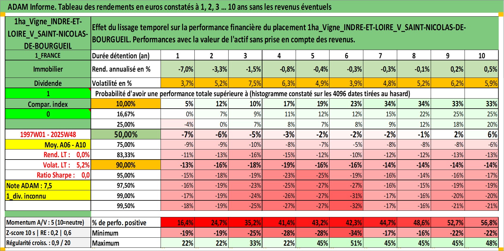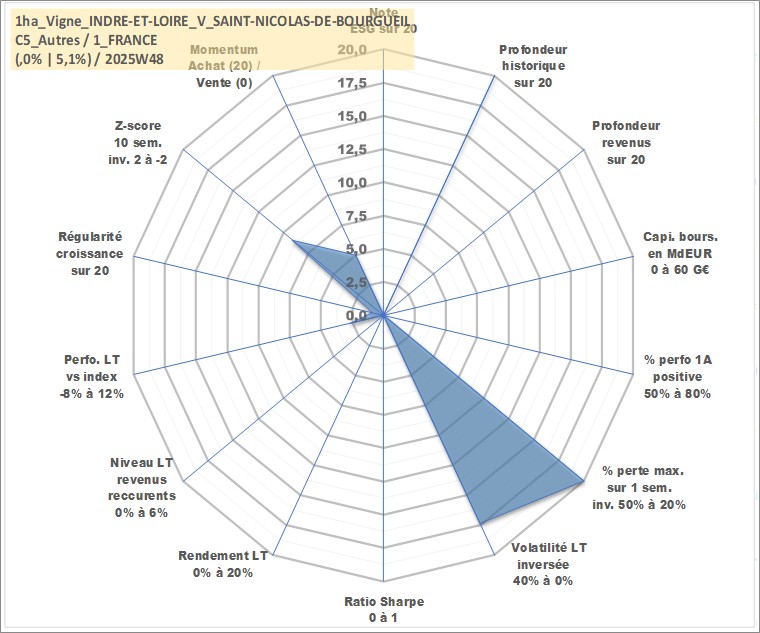Site dédié aux investisseursPage dédiée sur site financeAnalyse des valorisations hebdomadaires de l'actif 1ha_Vigne_INDRE-ET-LOIRE_V_SAINT-NICOLAS-DE-BOURGUEIL. Cet actif est cote en EUR. Les valorisations couvrent les semaines 1997W01 a 2025W48. Les fermages de ce bien foncier sont pris egaux a 2,5% annuels de la valeur venale du bien.