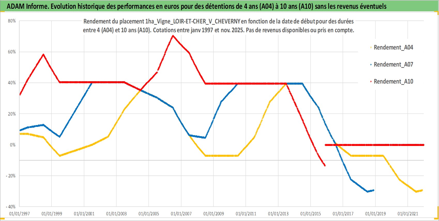 Site dédié aux investisseursPage dédiée sur site financeAnalyse des valorisations hebdomadaires de l'actif 1ha_Vigne_LOIR-ET-CHER_V_CHEVERNY. Cet actif est cote en EUR. Les valorisations couvrent les semaines 1997W01 a 2025W48. Les fermages de ce bien foncier sont pris egaux a 2,5% annuels de la valeur venale du bien.
